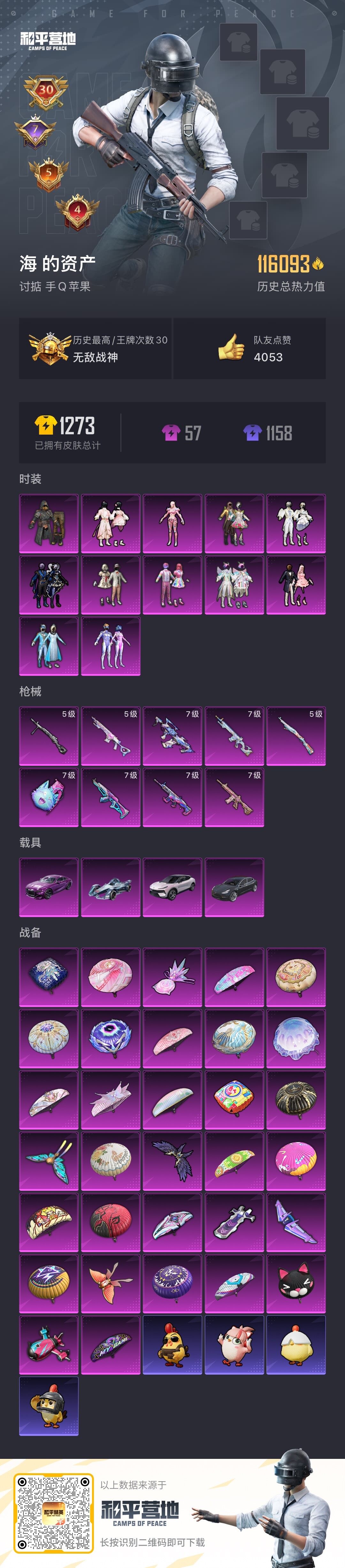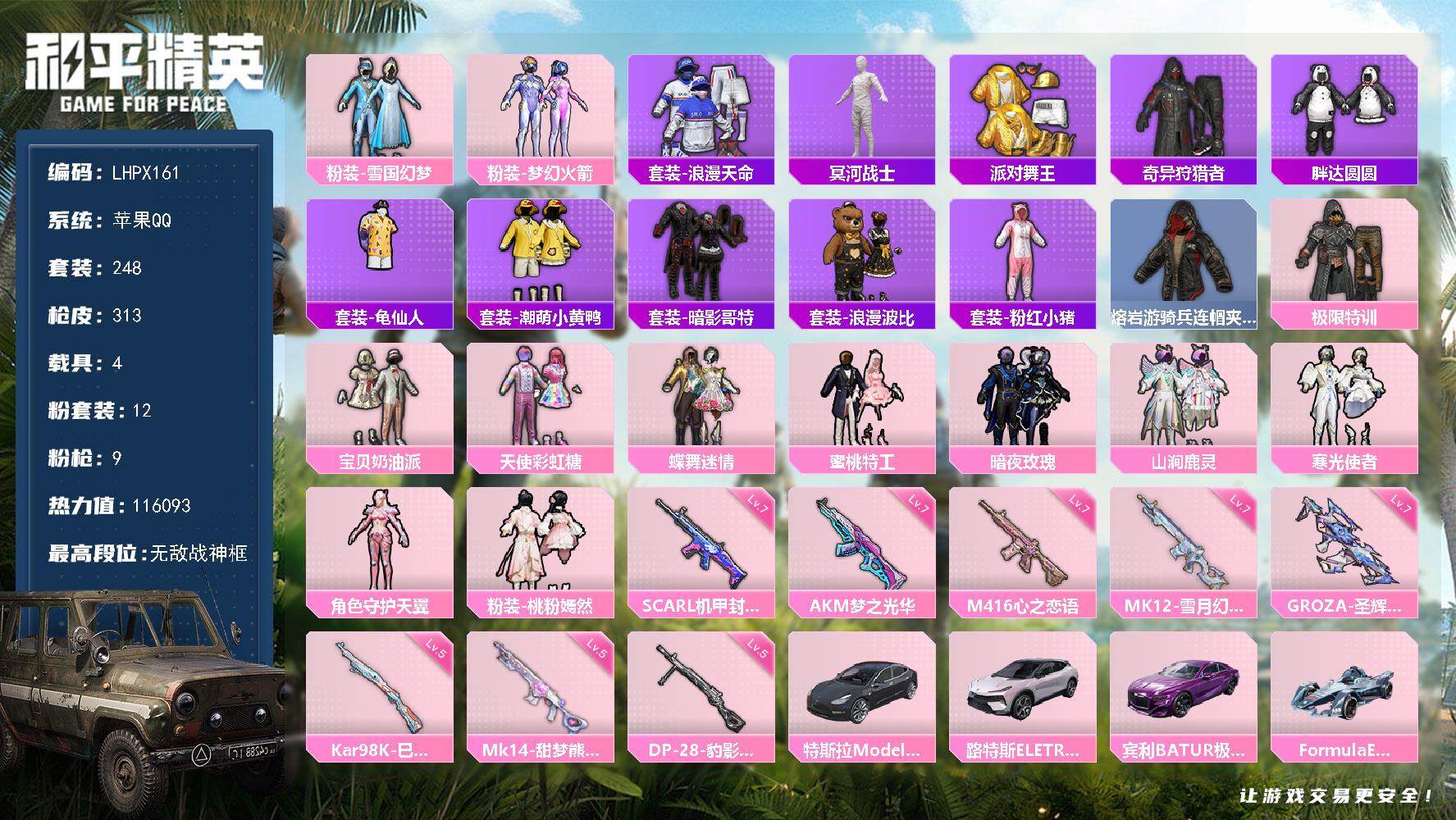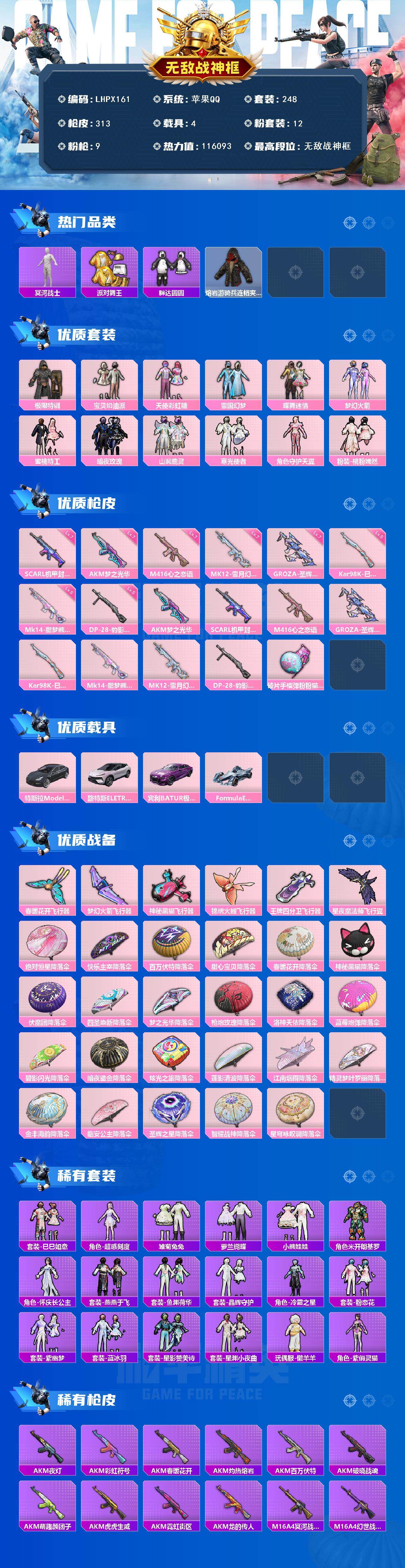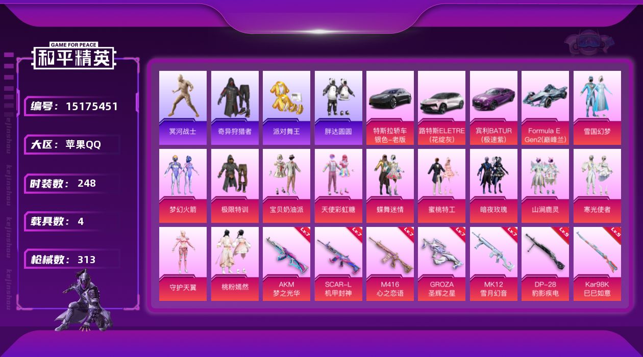 [15175451]【特价出售/店主推荐】苹果 手Q-12粉装-9特效枪-4载具-7粉色飞行器-116093热力值-30王牌印记-248套装-313枪皮