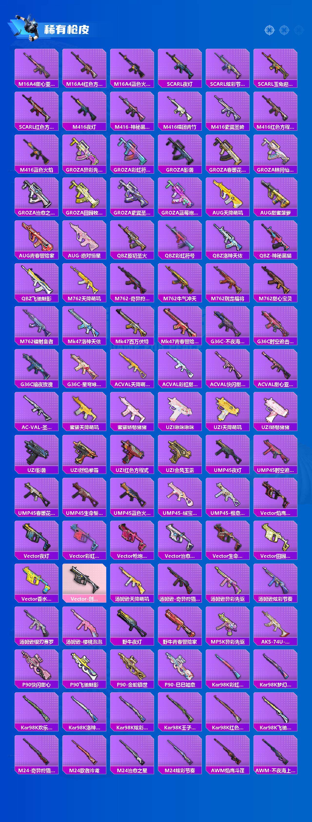 【粉色枪皮】:AKM-梦之光华,SCAR-L-机甲封神,M416-心之恋语,GROZA-圣辉之星,Kar98K-巳巳如意,Mk14-甜梦熊击,MK12-雪月幻音,DP-28-豹影疾电,破片手榴弹-粉粉猫爪