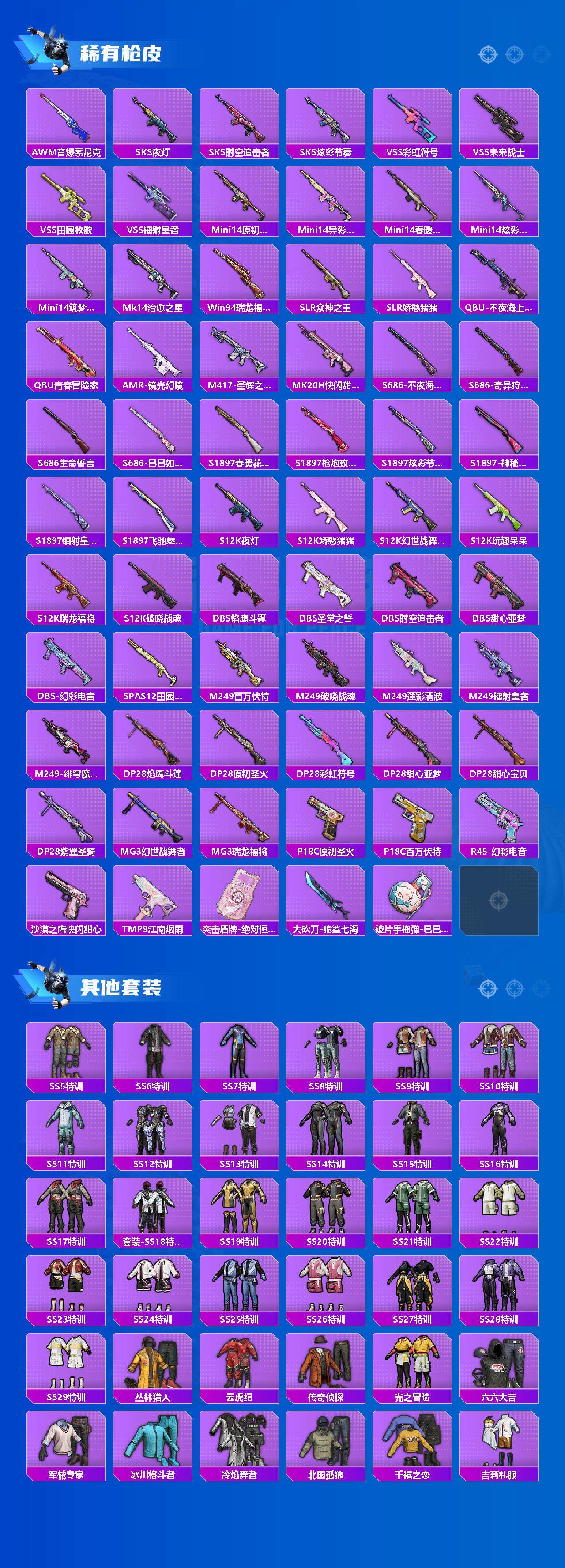 - [11824077]6粉装 6特效枪 6印记 可二次 可修改实名 身法装备:都市猎人,暗影哥特(红眼罩) 优质装备:都市猎人 热门装扮:千金淑猫,冷漠罗丽,香水柠檬,炙焰红王,山涧鹿灵,守护天翼,鹰眼刺客,深海小丑鱼,都市猎人,暗夜魅影 稀有枪皮:AMR-智耀战神,Kar98K-巳巳如意,UMP45量子极限,M762-青锋波束,M416电玩时刻 六级特效枪:六级AMR-智耀战神 五级特效枪:五级M762-青锋波束,五级UMP45-量子极限,五级Kar98K-巳巳如意,五级DP-28-豹影疾电,五级M416-电玩时刻 紫色装扮:田园牧歌,轻风白浪,SS22特训,萌趣咩咩,甜心亚梦,虚音幻奏,SS20特训,SS21特训,娇憨猪猪,人气偶像,SS23特训,极速光影,SS15特训,SS13特训,SS14特训,冰爽海盐,浪漫樱花,飞驰魅影,SS18特训,浓情蜜辣,音速流光,极速竞梦,SS19特训,冰川特警,SS16特训,瑞龙福将,团圆交子,SS17特训,蓝色运动,虎虎生威吉莉,街头潮人,跃动心情,蓝彩潮人,都市漫游者,都市魅力,酒红色名流,酷潮明星,蓝色守护者,阳光火鸡,竞技勇士朋克,竞技达人朋克,红色运动,绮丽涂鸦,缤纷果语,耀眼新星,长空猛禽,冰河战士,龙魂突击队,蝶变,龟仙人,无面战甲,青年教官,飞行日记,骑行爱好者,魅力单车,鹤鸣,麻辣教官,黄色伏地魔,黄色名流,黄色运动,黑色伏地魔,福星高照,战地督导,探宝勇士,时尚圣诞,极速红龙,柠萌假日,格斗先锋,橘黑制服,怒火燎原,冷焰舞者,北国孤狼,吉莉礼服,完美偶像,帅气教官,幻世战舞者,幻影武者,甜蜜告白,狂沙舞者,猎鹰,猛禽,王牌教练,甜蜜熊情侣,白熊同盟,白色伏地魔,破晓战魂,破蛋小黄鸡,海岛探路者,深蓝色名流,湖蓝色名流,滨海假日,滨海厨神,牛气满满,灰色格斗者,灼焰舞者,炫蓝之夏,热血青春,牛气冲天,粉日山川,小熊娃娃,雏菊兔兔,萝兰蝴蝶,SS29特训,冰公主,纯真浪花,热情海星,曼妙人鱼,SS28特训,暗影刺翼,湖雨初晴,暗影哥特(红眼罩),玉兔迎春,巳巳如意,海琴烟,星途旅人,竞技名士,都市丽猫,SS25特训,SS24特训(SS24特训套装),幻羽潜行,焰鹰斗篷,幽夜迷踪,SS27特训,萌趣绒叽,浪漫天命,逆风勇士,SS6特训,SS11特训,耀粉歌者,大橘大利,原初圣火,SS9特训,SS8特训,SS10特训,纯白誓言,青玉碎影,