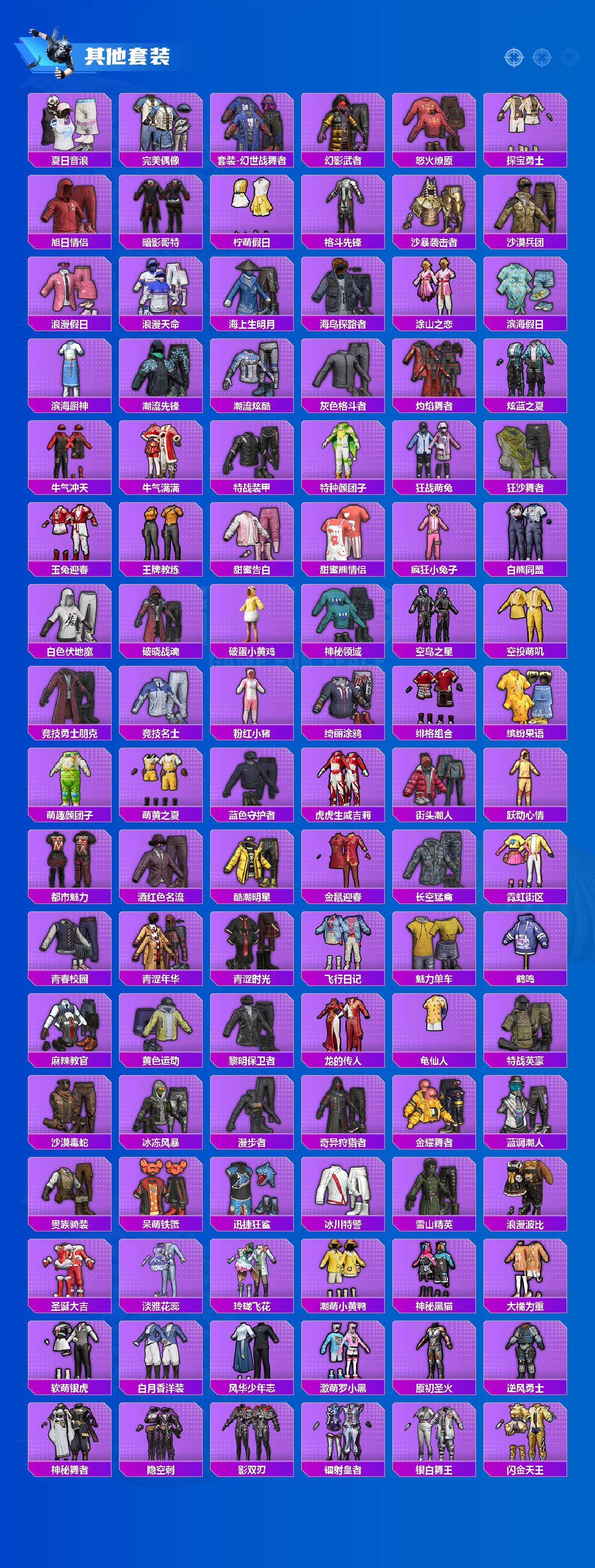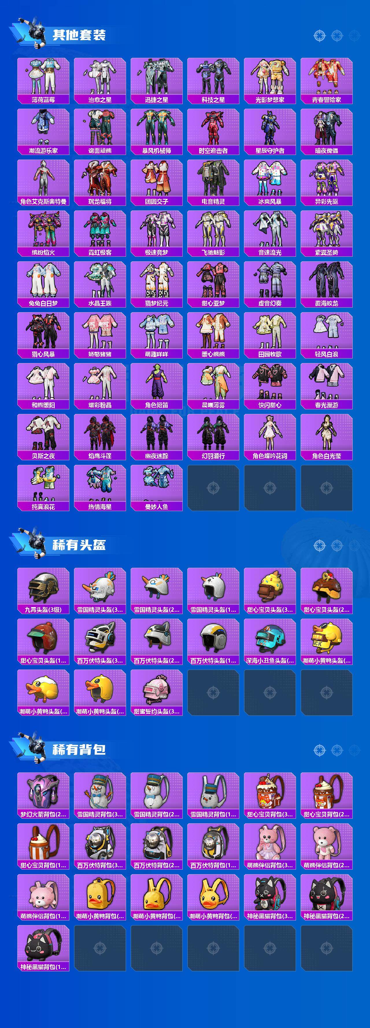 套装-雪国幻梦,套装-梦幻火箭,套装-冥河战士,套装-派对舞王,套装-奇异狩猎者,套装-胖达圆圆,套装-潮萌小黄鸭,套装-浪漫波比,套装-极限特训,套装-宝贝奶油派,套装-天使彩虹糖,套装-蝶舞迷情,套装-蜜桃特工,套装-暗夜玫瑰,套装-山涧鹿灵,套装-寒光使者,角色-守护天翼,套装-桃粉嫣然,套装-呆萌铁蟹,套装-迅捷狂鲨,套装-神秘黑猫,套装-大橘为重,套装-软萌银虎,兔兔白日梦套装