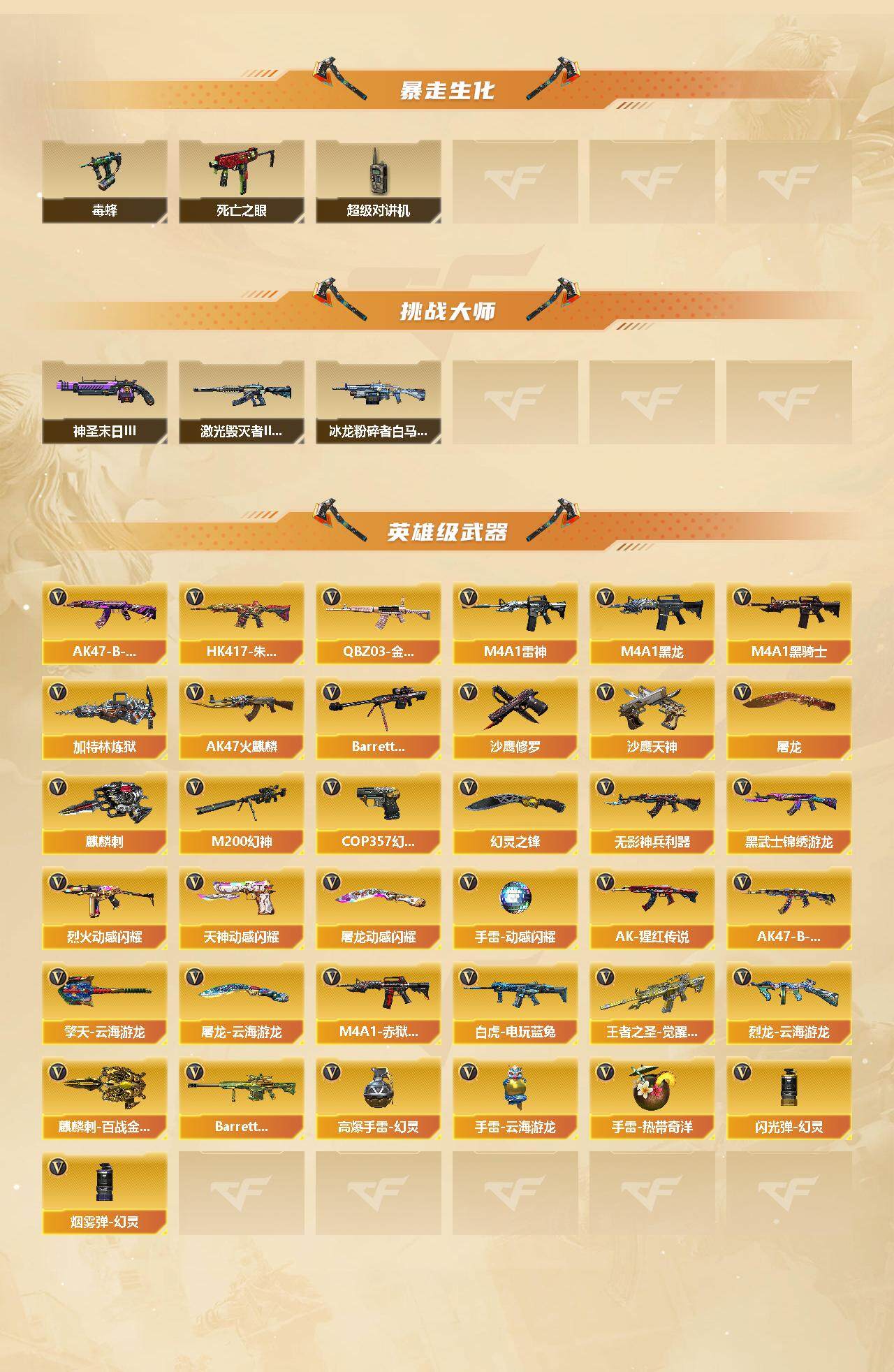 【英雄级武器】:AK47-火麒麟*3,M4A1-黑龙,M4A1-雷神,M4A1-黑骑士,HK417-朱雀,无影-神兵利器,黑武士-锦绣游龙,QBZ03-金色蔷薇,烈火-动感闪耀,王者之圣-觉醒版,AK-47-猩红传说*2,AK47-B-战神*2,AK47-B-常胜将军,白虎-电玩蓝兔,Barrett-毁灭