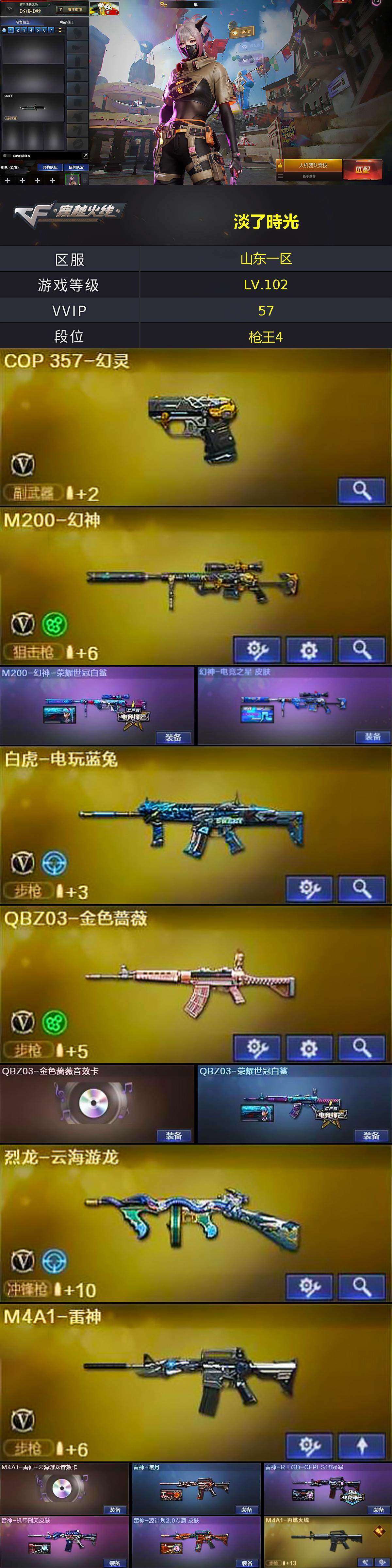[15175996]山东一区-56V-4王者-1炫金 【热门武器】:QBZ03-金色蔷薇,HK417-朱雀,M200-幻神,死亡之眼,白虎-电玩蓝兔,Cat-刀锋,毒蜂,M4A1-黑骑士,加特林-炼狱*2,毁灭-孙三炮,COP-白鲨*2,COP 357-幻灵,沙鹰-修罗*3 【王者炫金武器】:王者之城,王者玉锋,王者云击,炫金骑士 【音效卡】:烈火-动感闪耀 音效卡,M4A1-雷神-云海游龙音效卡,M4A1-黑骑士音效卡,Barrett-毁灭音效卡,Barrett-碧霄极光音效卡 【皮肤】:M200-幻神-荣耀世冠白鲨,幻神-电竞之星 皮肤,QBZ03-荣耀世冠白鲨,雷神-暗月,雷神-R.LGD-CFPLS18冠军,雷神-机甲刑天皮肤,雷神-源计划2.0专属 皮肤,M4A1-再燃火线,火麒麟-轻羽皮肤,火麒麟-平天大圣,火麒麟-百城,火麒麟-心动糖果,毁灭-冠军之怒,毁灭-黑大圣皮肤,毁灭-黑曼巴 皮肤,毁灭-英雄计划 皮肤,M4A1-千变-孔明皮肤,黑龙-能量核心,黑龙-冠军之武,黑骑士-CFS2021,烈火-动感闪耀 皮肤,战神-粉色甜心皮肤,战神-紫绶金章皮肤*2,战神-流金岁月皮肤,修罗-能量核心,修罗-冠军之魂,修罗-15周年嘉年华 皮肤,轻型军用手斧-再燃火线,麒麟刺-月皮肤 【角色】:隼,战地猎狐,王者潘多拉,奇洋探员,乔伊教练,云海玲珑,暗夜-X,初恋灵狐,芳心审判者,风暴女,嘉年华灵狐,娟娟,兰妹妹,猎狐者-追月,灵狐-花神,灵狐者-X,灵狐者-黄金海岸,灵狐者-七夕宝贝,龙儿-小淘气,麻雀,潘多拉-X,潘多拉-甜心教官,青霞仙子,蛇姬,斯沃特-X,蜀雪,铁骑荣耀,兔囡囡,幽 【人偶武器】:COP-白鲨*2,毁灭-孙三炮,雷神-枪娘蕾安娜,AWM-灵狐-15周年嘉年华,Cat-刀锋,迷你牛魔王,深渊终结者手雷,迷你艾比,迷你超能女侍 【暴走生化】:毒蜂,死亡之眼,超级对讲机 【挑战大师】:冰龙粉碎者-白马银枪,激光毁灭者III-白马银枪,神圣爆裂者-末日III*2 【英雄级武器】:AK47-火麒麟*3,M4A1-黑龙,M4A1-雷神,M4A1-黑骑士,HK417-朱雀,无影-神兵利器,黑武士-锦绣游龙,QBZ03-金色蔷薇,烈火-动感闪耀,王者之圣-觉醒版,AK-47-猩红传说*2,AK47-B-战神*2,AK47-B-常胜将军,白虎-电玩蓝兔,Barrett-毁灭