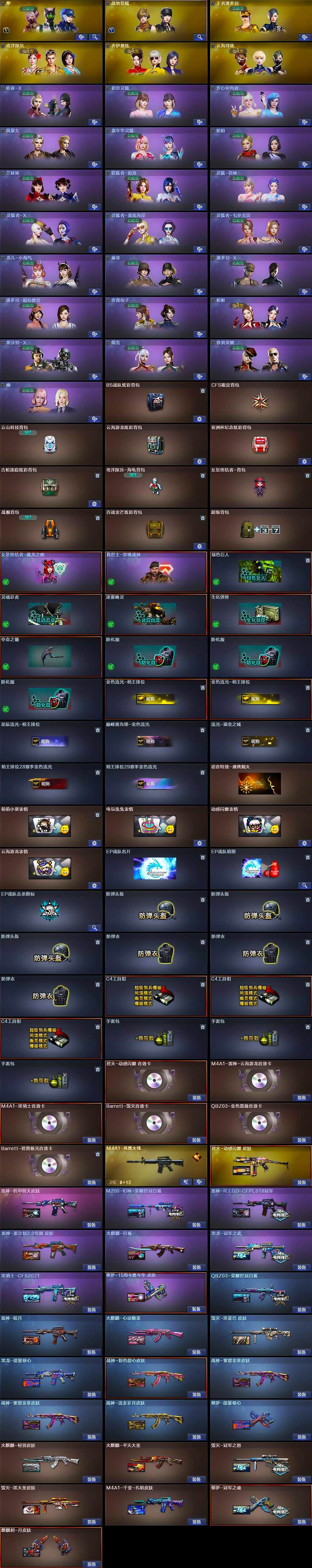 【皮肤】:M200-幻神-荣耀世冠白鲨,幻神-电竞之星 皮肤,QBZ03-荣耀世冠白鲨,雷神-暗月,雷神-R.LGD-CFPLS18冠军,雷神-机甲刑天皮肤,雷神-源计划2.0专属 皮肤,M4A1-再燃火线,火麒麟-轻羽皮肤,火麒麟-平天大圣,火麒麟-百城,火麒麟-心动糖果,毁灭-冠军之怒,毁灭-黑大圣皮肤,毁灭-黑曼巴 皮肤,毁灭-英雄计划 皮肤,M4A1-千变-孔明皮肤,黑龙-能量核心,黑龙-冠军之武,黑骑士-CFS2021,烈火-动感闪耀 皮肤,战神-粉色甜心皮肤,战神-紫绶金章皮肤*2,战神-流金岁月皮肤,修罗-能量核心,修罗-冠军之魂,修罗-15周年嘉年华 皮肤,轻型军用手斧-再燃火线,麒麟刺-月皮肤