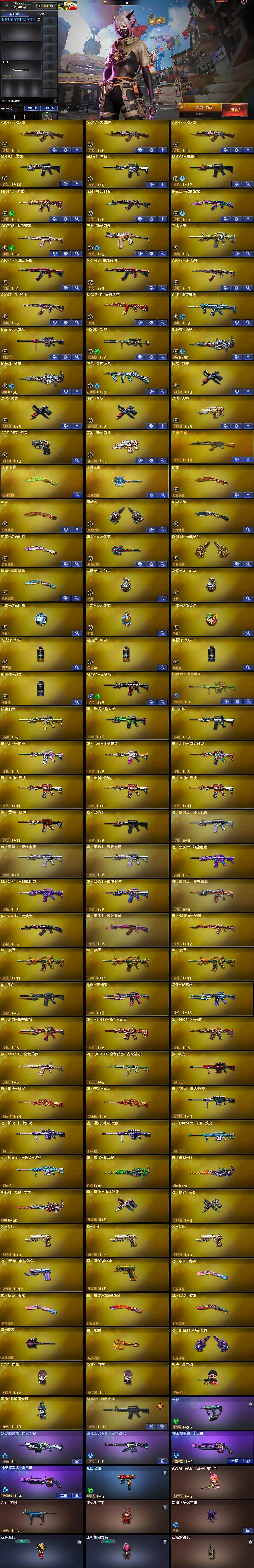 【热门武器】:QBZ03-金色蔷薇,HK417-朱雀,M200-幻神,死亡之眼,白虎-电玩蓝兔,Cat-刀锋,毒蜂,M4A1-黑骑士,加特林-炼狱*2,毁灭-孙三炮,COP-白鲨*2,COP 357-幻灵,沙鹰-修罗*3
