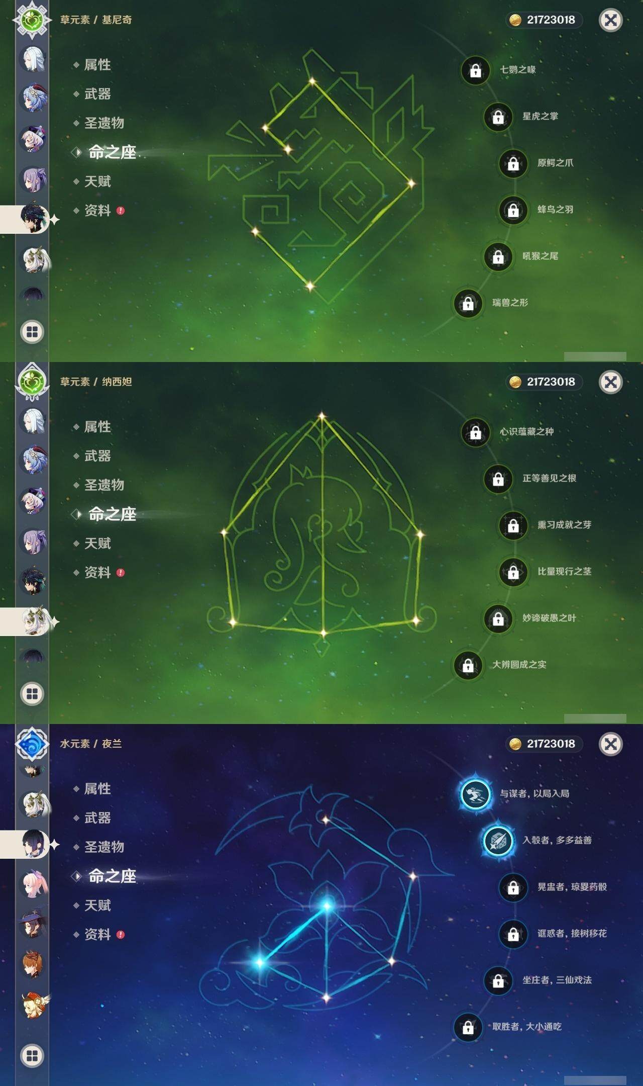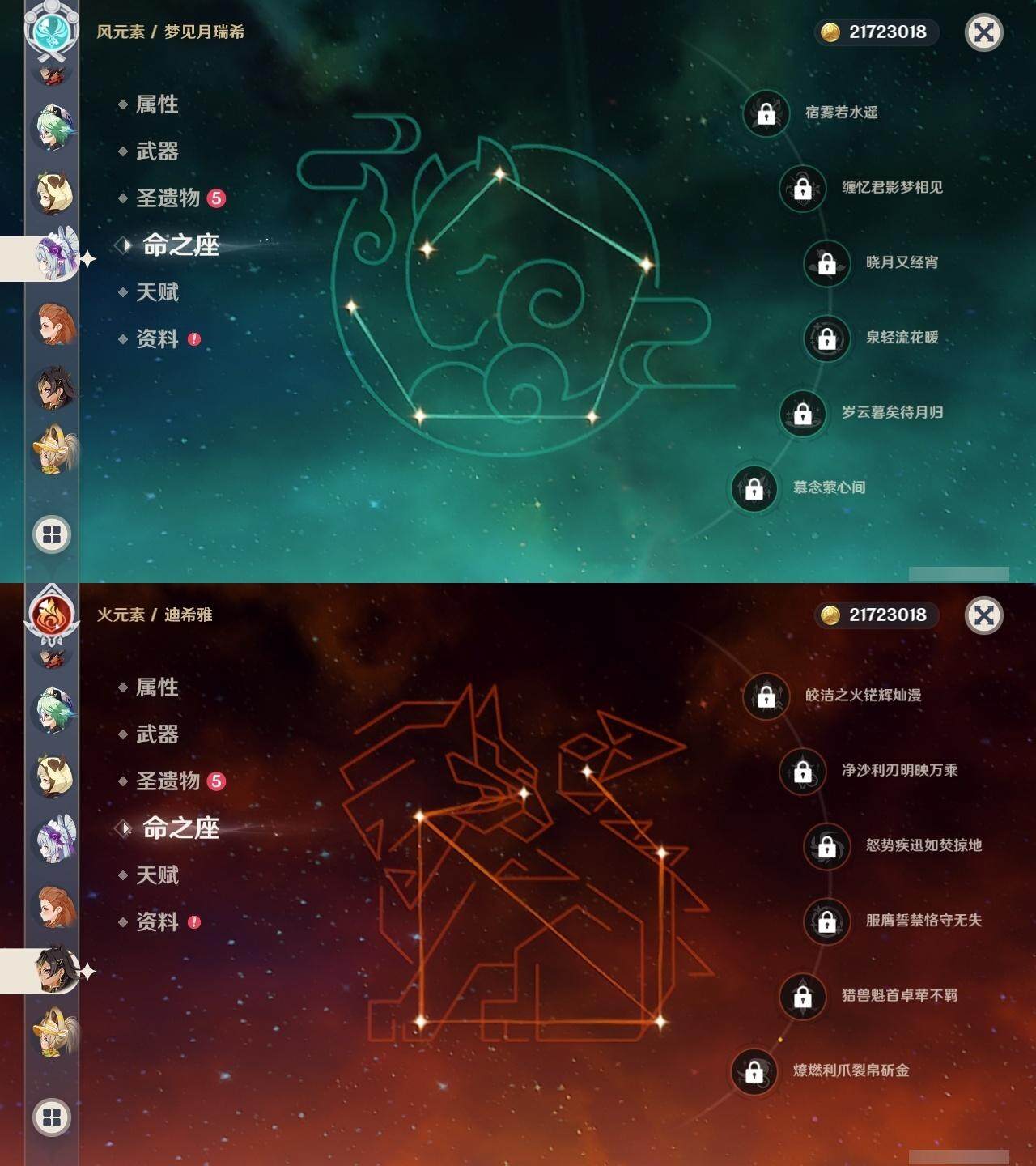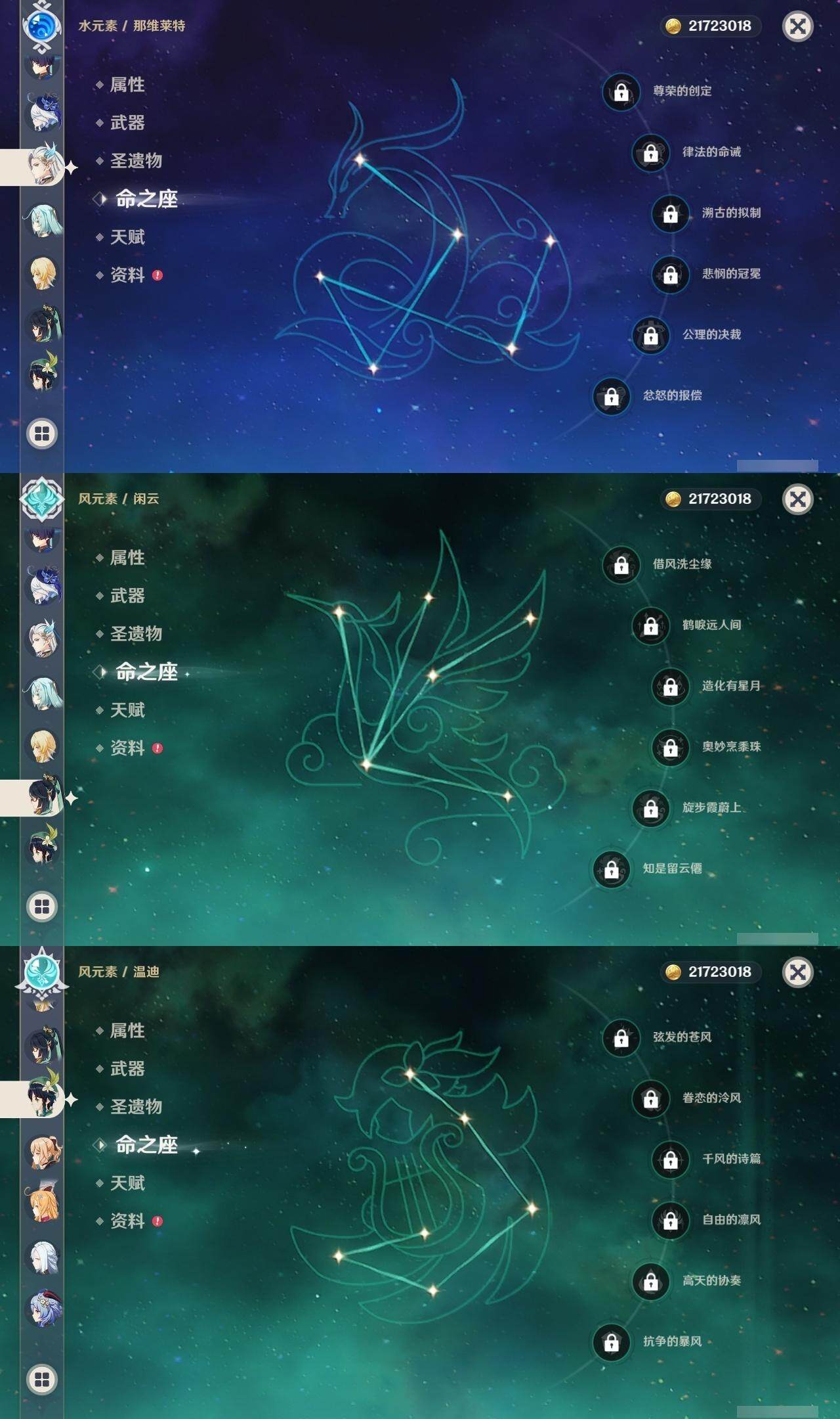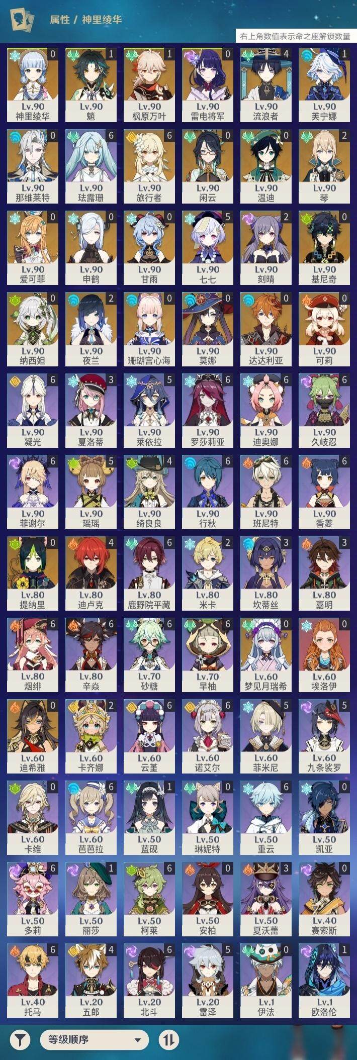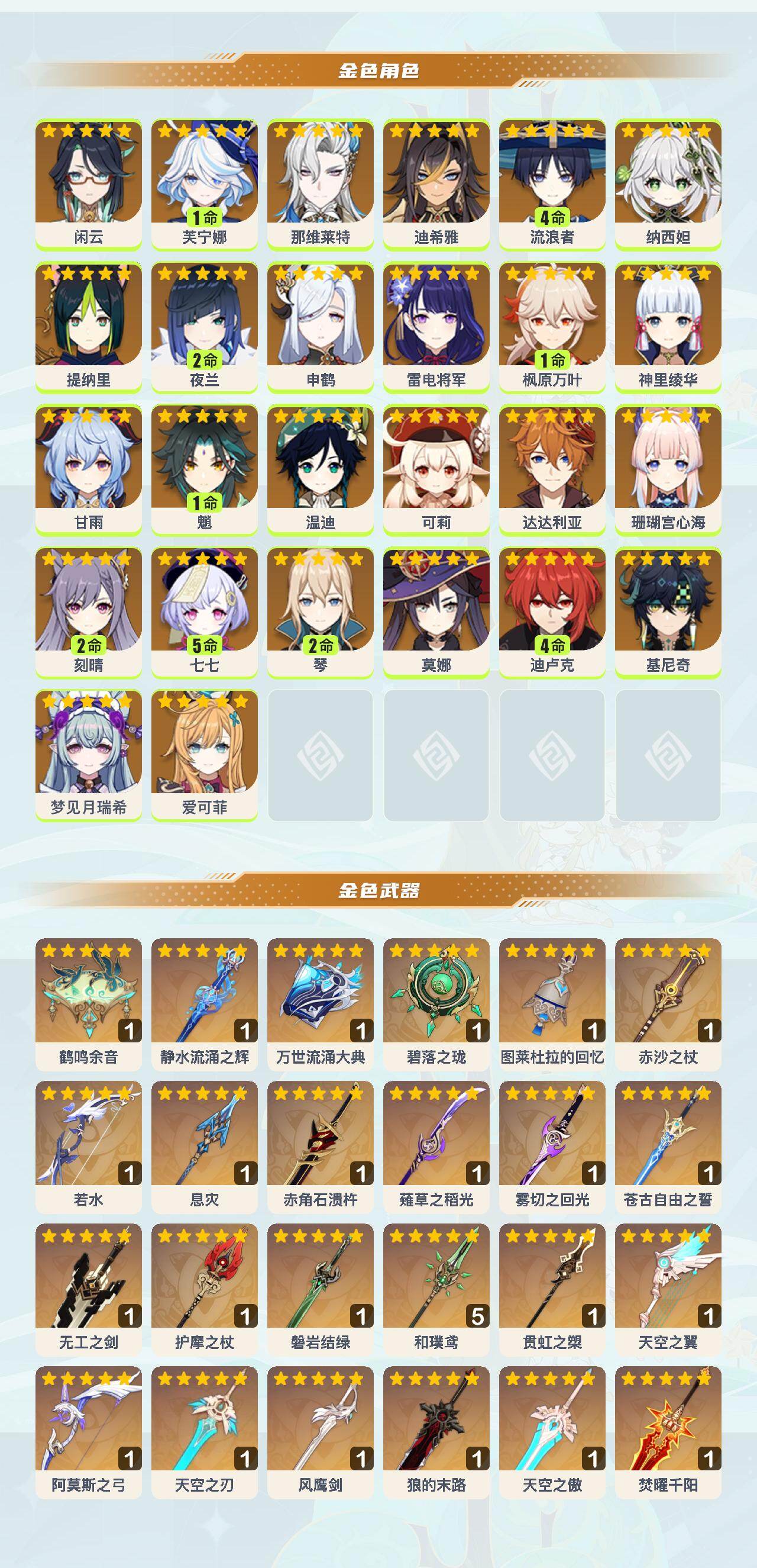 0命闲云,1命芙宁娜,0命那维莱特,0命迪希雅,4命流浪者,0命纳西妲,0命提纳里,2命夜兰,0命申鹤,0命雷电将军,1命枫原万叶,0命神里绫华,0命甘雨,1命魈,0命温迪,0命可莉,0命达达利亚,0命珊瑚宫心海,2命刻晴,5命七七,2命琴,0命莫娜,4命迪卢克,0命基尼奇,0命梦见月瑞希,0命爱可菲,精1鹤鸣余音,精1静水流涌之辉,精1万世流涌大典,精1碧落之珑,精1图莱杜拉的回忆,精1赤沙之杖,精1若水,精1息灾,精1赤角石溃杵,精1薙草之稻光,精1雾切之回光,精1苍古自由之誓,精1无工之剑,精1护摩之杖,精1磐岩结绿,精5和璞鸢,精1贯虹之槊,精1天空之翼,精1阿莫斯之弓,精1天空之刃,精1风鹰剑,精1狼的末路,精1天空之傲,精1焚曜千阳