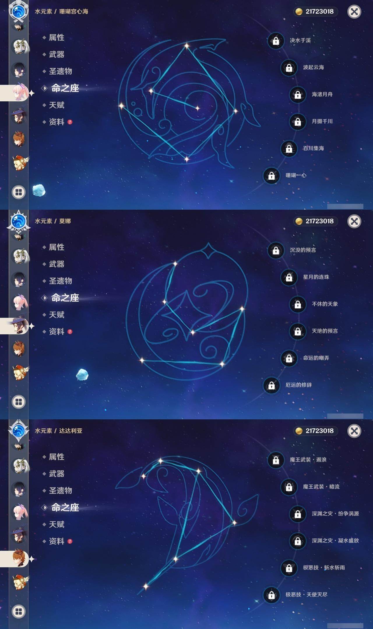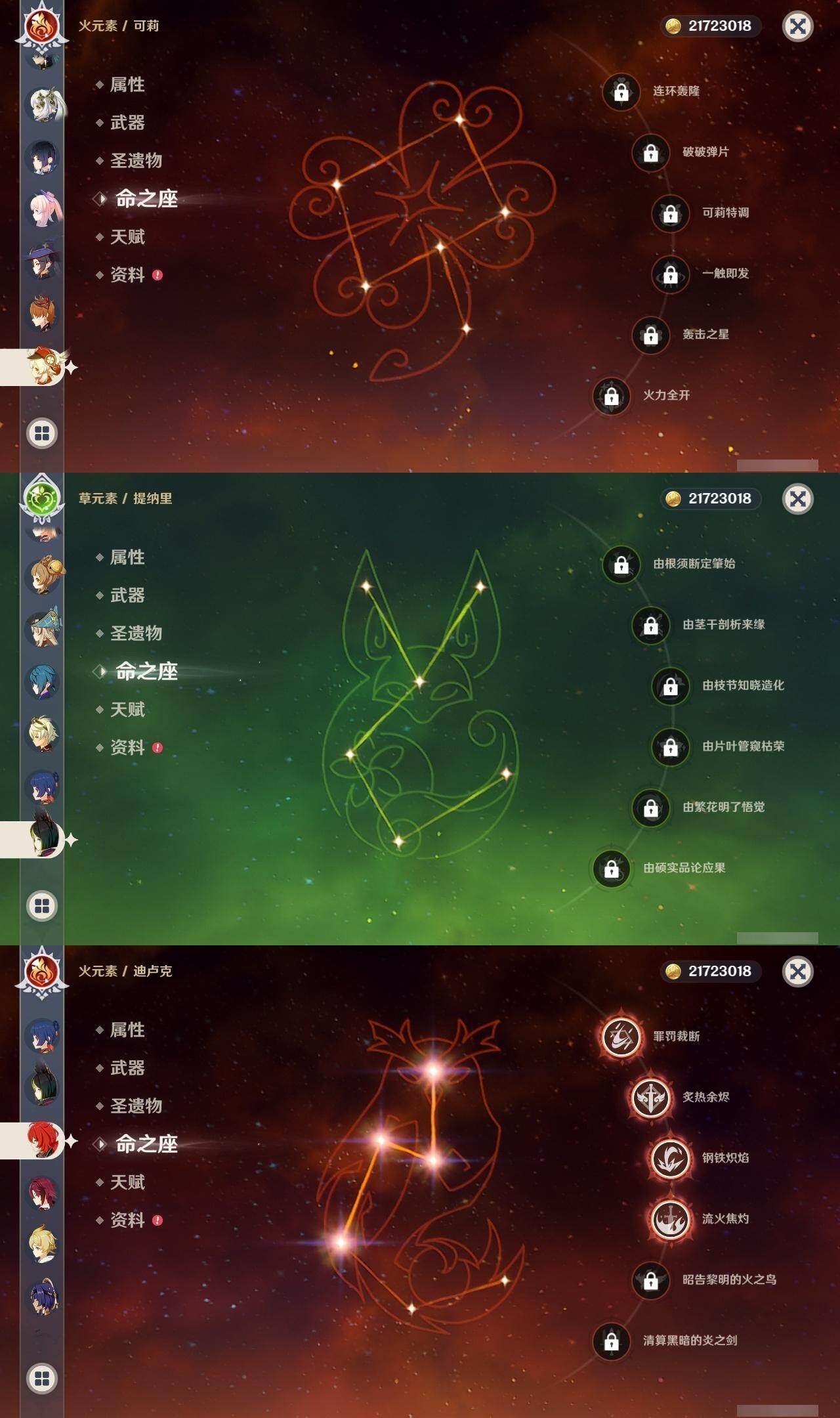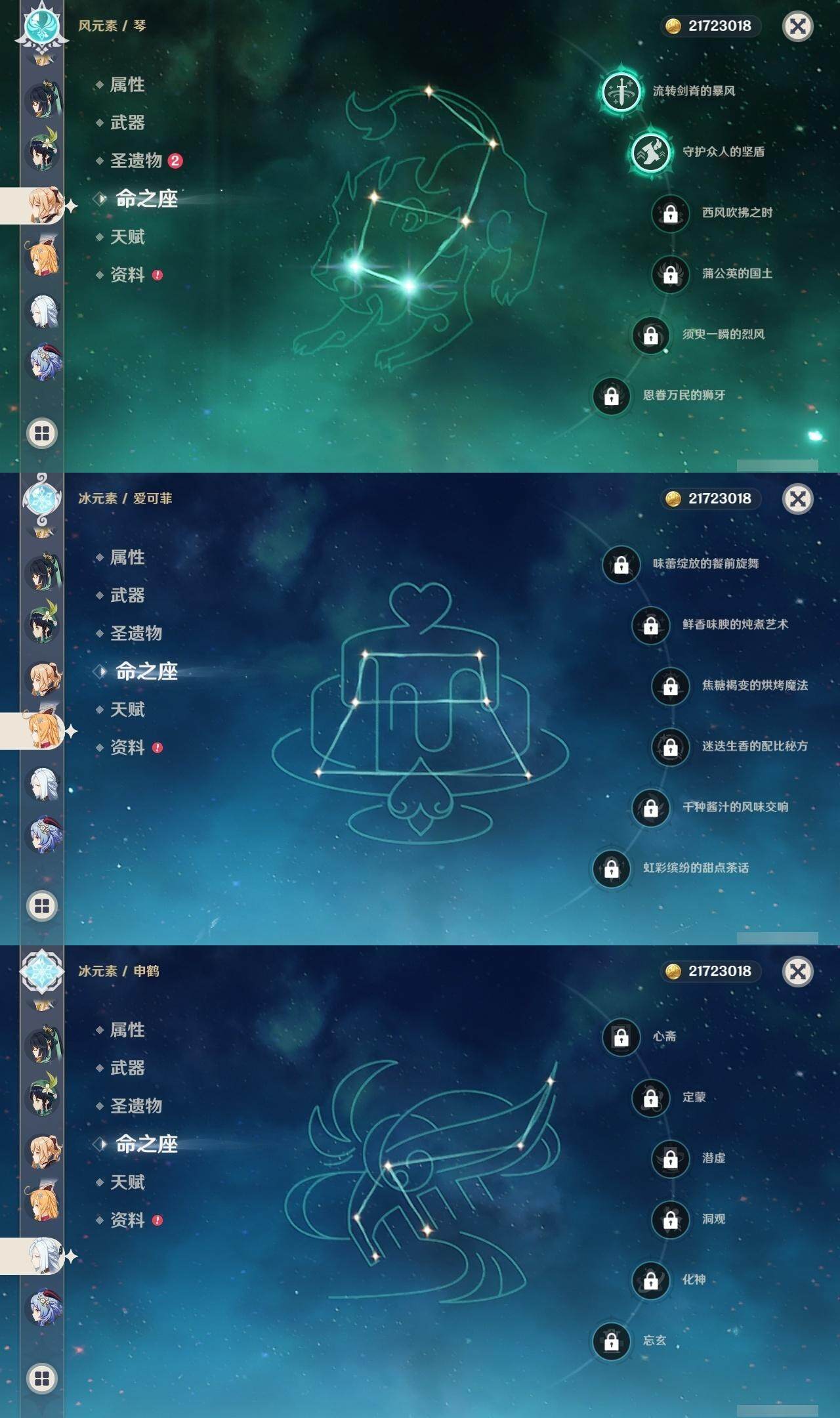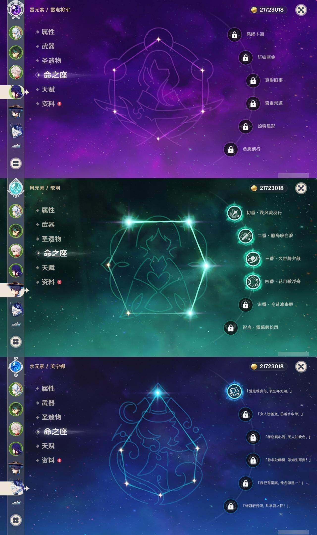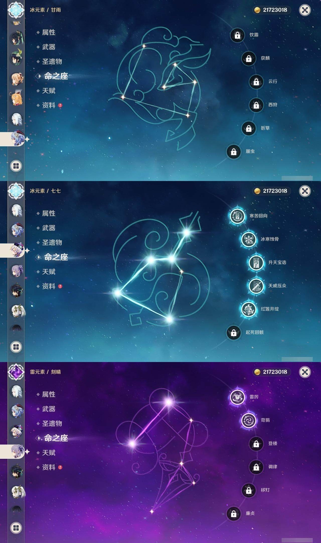 0命闲云,1命芙宁娜,0命那维莱特,0命迪希雅,4命流浪者,0命纳西妲,0命提纳里,2命夜兰,0命申鹤,0命雷电将军,1命枫原万叶,0命神里绫华,0命甘雨,1命魈,0命温迪,0命可莉,0命达达利亚,0命珊瑚宫心海,2命刻晴,5命七七,2命琴,0命莫娜,4命迪卢克,0命基尼奇,0命梦见月瑞希,0命爱可菲,精1鹤鸣余音,精1静水流涌之辉,精1万世流涌大典,精1碧落之珑,精1图莱杜拉的回忆,精1赤沙之杖,精1若水,精1息灾,精1赤角石溃杵,精1薙草之稻光,精1雾切之回光,精1苍古自由之誓,精1无工之剑,精1护摩之杖,精1磐岩结绿,精5和璞鸢,精1贯虹之槊,精1天空之翼,精1阿莫斯之弓,精1天空之刃,精1风鹰剑,精1狼的末路,精1天空之傲,精1焚曜千阳