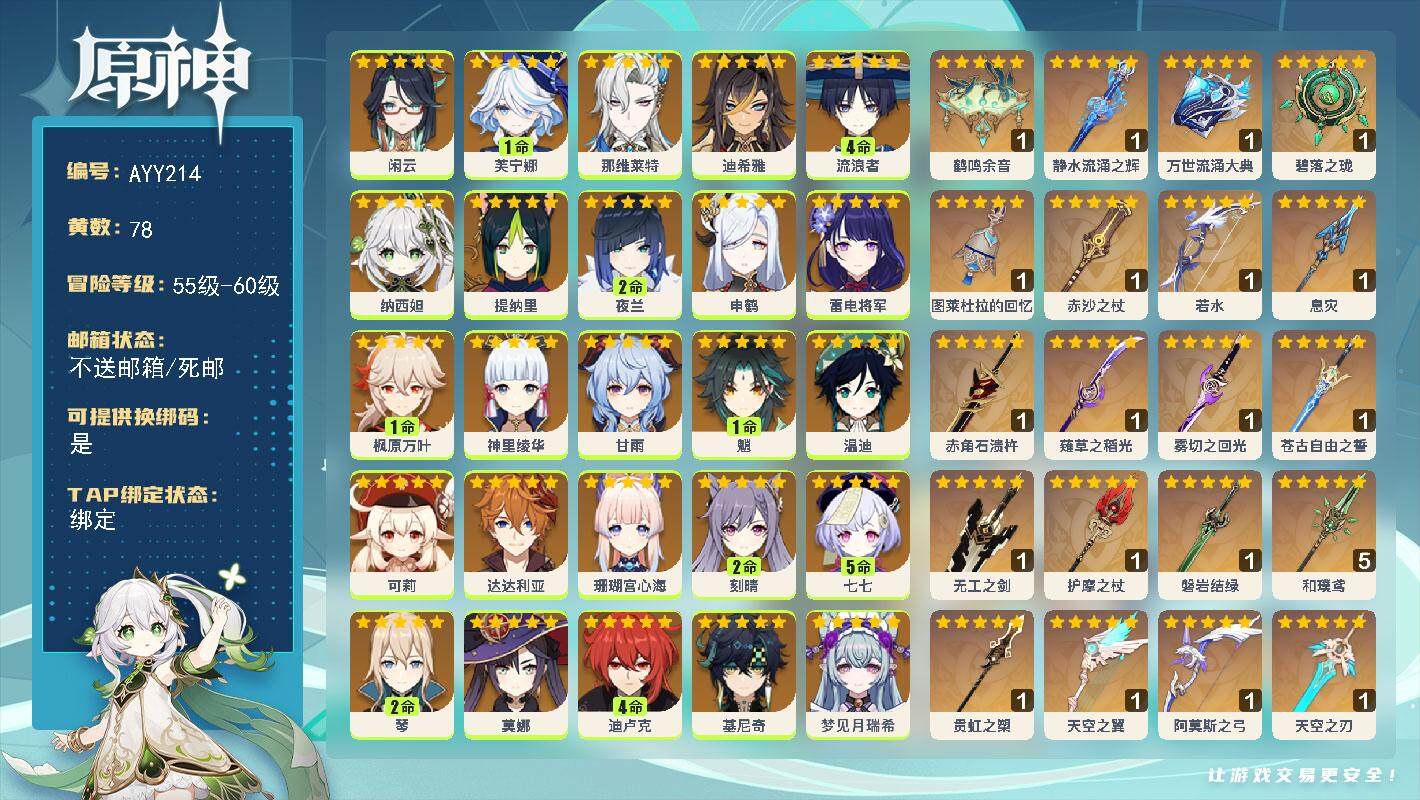[15178534]【店主推荐捡漏号】60级/78黄/女主/26个五星角色/26个五星武器 0命闲云,1命芙宁娜,0命那维莱特,0命迪希雅,4命流浪者,0命纳西妲,0命提纳里,2命夜兰,0命申鹤,0命雷电将军,1命枫原万叶,0命神里绫华,0命甘雨,1命魈,0命温迪,0命可莉,0命达达利亚,0命珊瑚宫心海,2命刻晴,5命七七,2命琴,0命莫娜,4命迪卢克,0命基尼奇,0命梦见月瑞希,0命爱可菲,精1鹤鸣余音,精1静水流涌之辉,精1万世流涌大典,精1碧落之珑,精1图莱杜拉的回忆,精1赤沙之杖,精1若水,精1息灾,精1赤角石溃杵,精1薙草之稻光,精1雾切之回光,精1苍古自由之誓,精1无工之剑,精1护摩之杖,精1磐岩结绿,精5和璞鸢,精1贯虹之槊,精1天空之翼,精1阿莫斯之弓,精1天空之刃,精1风鹰剑,精1狼的末路,精1天空之傲,精1焚曜千阳