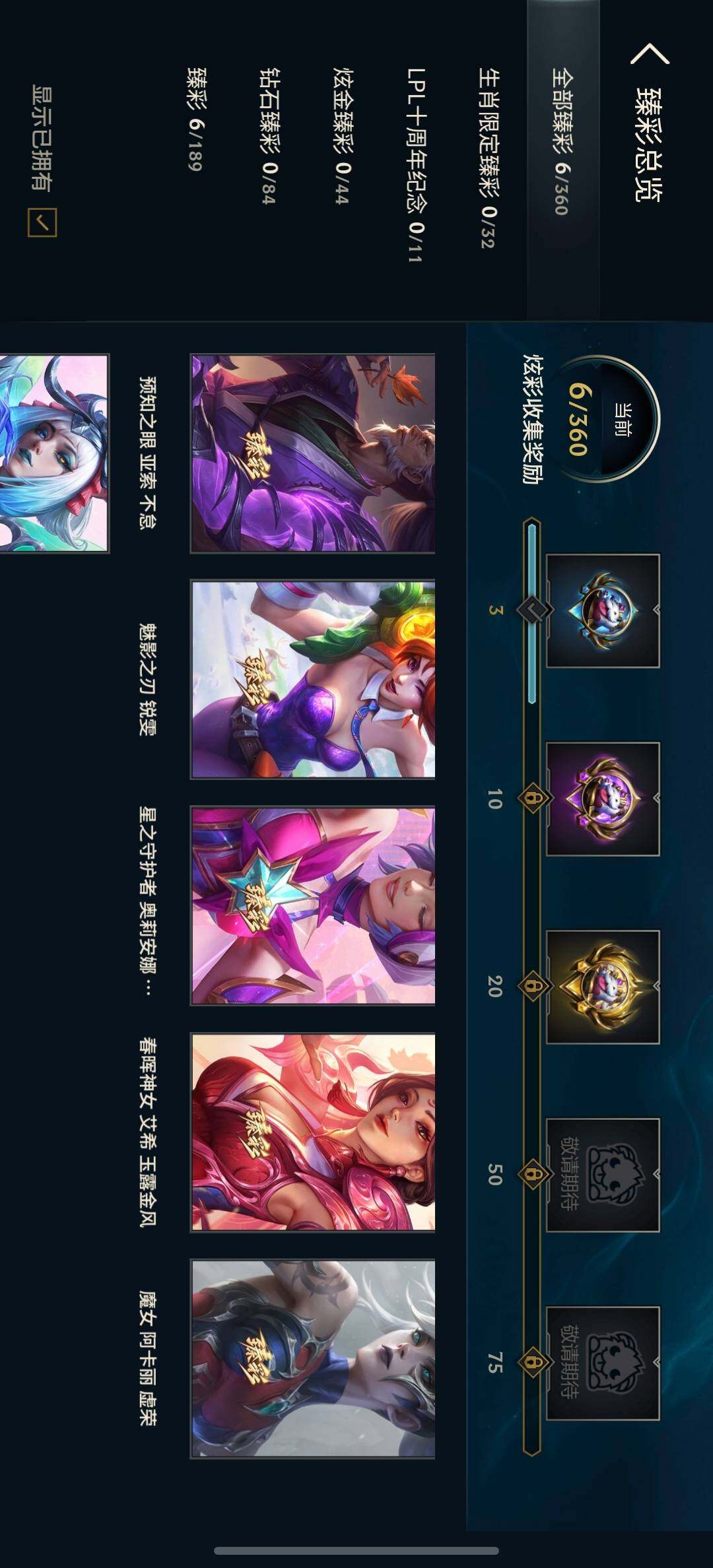 【臻彩皮肤】:星之守护者奥莉安娜未来之光,春晖神女艾希玉露金风,魔女阿卡丽虚荣,净雪之月莫甘娜冬虹,预知之眼亚索不怠
