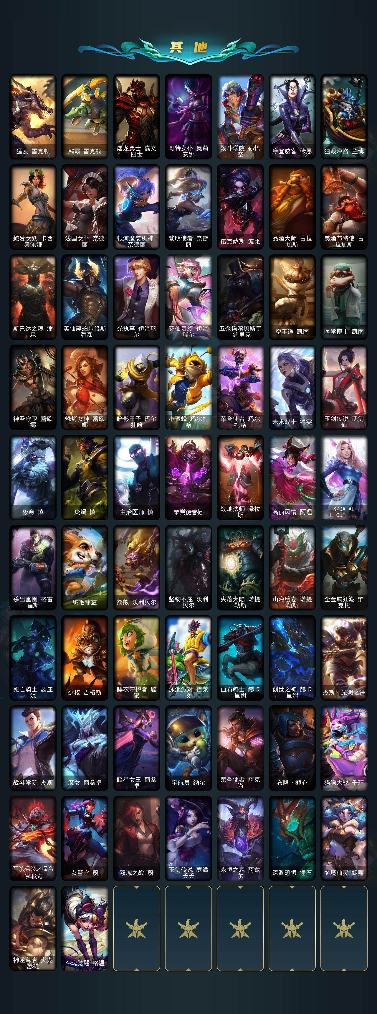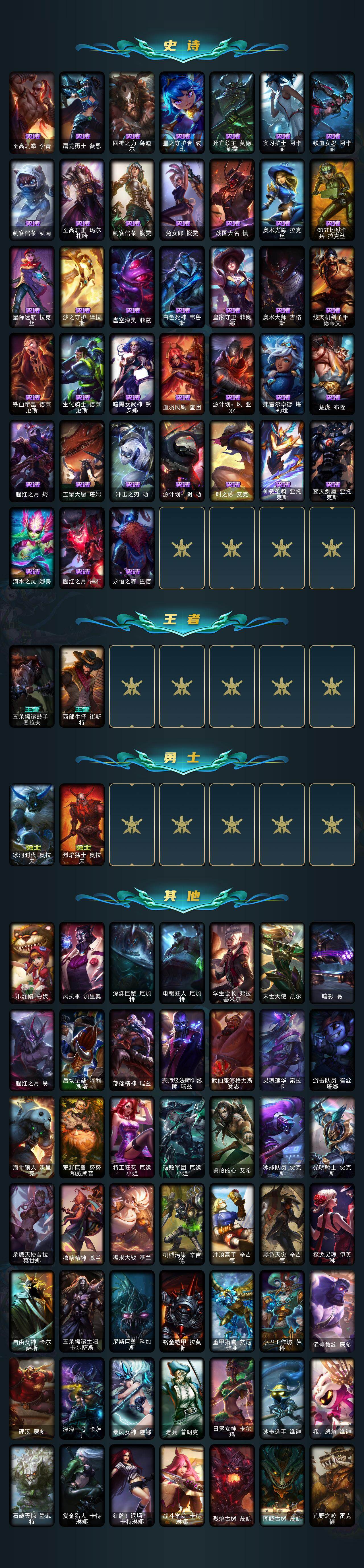 【史诗皮肤】:冰霜烈焰安妮,科学怪熊的新娘安妮,摄魂男爵弗拉基米尔,铁钩船长费德提克,圣光审判凯尔,战争机器赛恩,圣洁化身索拉卡,源代码索拉卡,兔宝宝提莫,荒野豺狼沃里克,法国皇室厄运小姐,黑帮狂花厄运小姐,女船长厄运小姐,国王泰达米尔,炼金狂士辛吉德,卡尔萨斯祸害之光,小小骑士阿木木,熔火之心拉莫斯,飞越疯人院萨科,五杀摇滚键盘手娑娜,恐惧新星普朗克,血石诅咒塔里克,穿着正装的恶魔维迦,北领前线斯维因,抵抗军天使凯特琳,前线指挥官卡特琳娜,蓝焰梦魔魔腾,符文战神雷克顿,至高之拳李青,屠龙勇士薇恩,四神之力乌迪尔,星之守护者波比,死亡领主莫德凯撒,实习护士阿卡丽,铁血女忍阿卡丽,刺客信条凯南,至高君王玛尔扎哈,刺客信条锐雯,兔女郎锐雯,战国大名慎,奥术光辉拉克丝,ODST地狱伞兵拉克丝,星际迷航拉克丝,沙之守护泽拉斯,虚空海灵菲兹,白色死神韦鲁斯,皇家守卫菲奥娜,奥术大师吉格斯,绞肉机刽子手德莱文,铁血帝皇德莱厄斯,生化骑士德莱厄斯,暗黑女武神黛安娜,血羽凤凰奎因,源计划风亚索