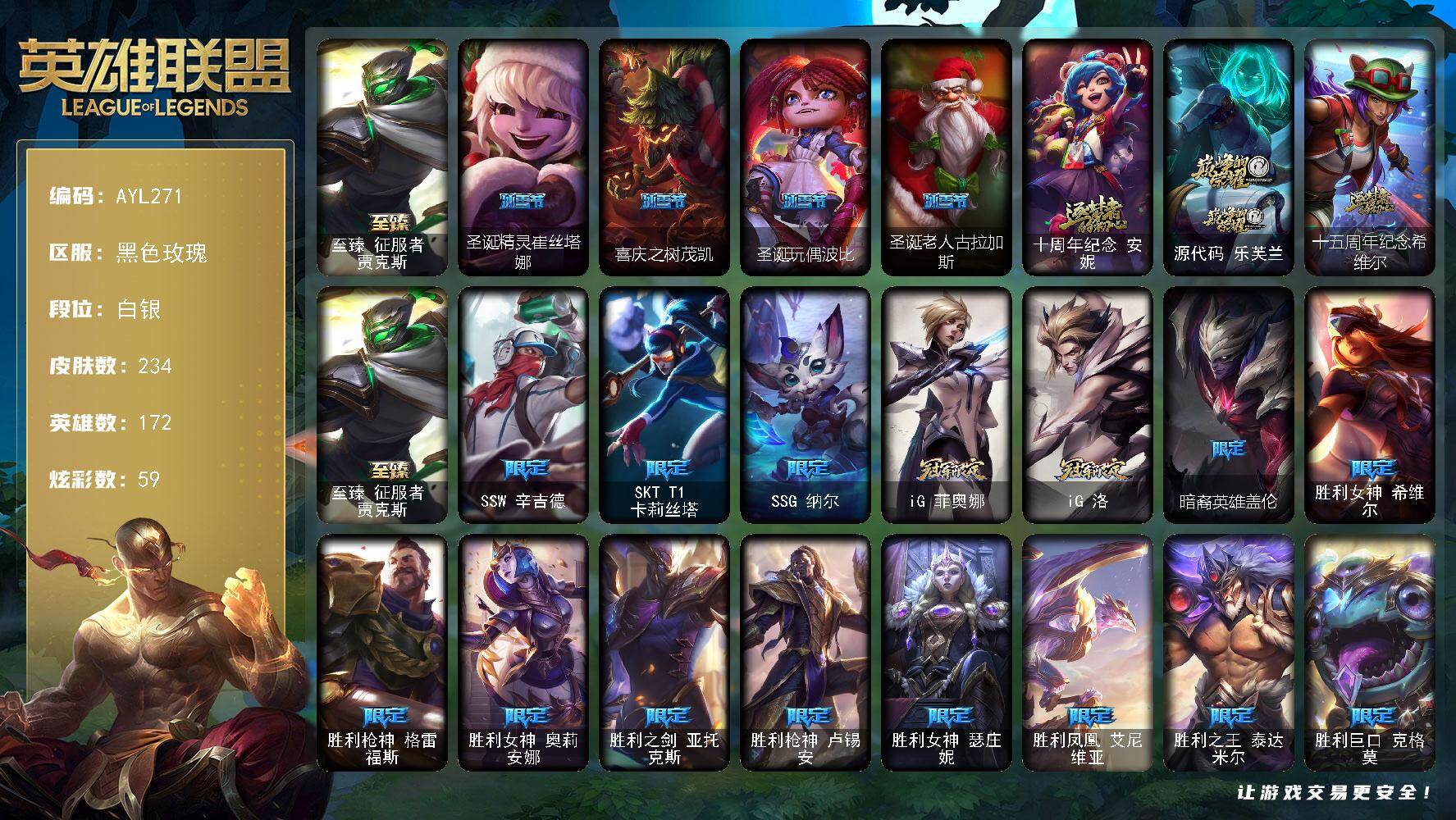 [15179852]【店主推荐捡漏号!可直接换绑】白银段位-172英雄-234皮肤-59炫彩-0终极-4神话-27限定-19传说-66史诗 【至臻皮肤】:至臻征服者贾克斯 【臻彩皮肤】:星之守护者奥莉安娜未来之光,春晖神女艾希玉露金风,魔女阿卡丽虚荣,净雪之月莫甘娜冬虹,预知之眼亚索不怠 【冰雪限定】:圣诞精灵崔丝塔娜,喜庆之树茂凯,圣诞玩偶波比,圣诞老人古拉加斯 【神话皮肤】:十周年纪念安妮,源代码乐芙兰,十五周年纪念希维尔,至臻征服者贾克斯 【限定皮肤】:SSW辛吉德,SKTT1卡莉丝塔,SSG纳尔,iG菲奥娜,iG洛,暗裔英雄盖伦,胜利女神希维尔,胜利枪神格雷福斯,胜利女神奥莉安娜,胜利之剑亚托克斯,胜利枪神卢锡安,胜利女神瑟庄妮,胜利凤凰艾尼维亚,胜利之王泰达米尔,胜利巨口克格莫,胜利女神娑娜,胜利剑圣易,胜利女神菲奥娜,无头骑士赫卡里姆,暗影沃里克,都铎王朝图奇,防暴天使凯尔,警用试作体K9内瑟斯 【传说皮肤】:铁哥们儿奥拉夫,地狱之门卫士加里奥,血石领主弗拉基米尔,大天使长米迦勒凯尔,源计划林易,烈焰雄心崔丝塔娜,女皇艾希,鬼魂新娘莫甘娜,战地巨兽科加斯,电玩女神娑娜,红色男爵库奇,女警狙击凯特琳,冰川巨兽墨菲特,钢铁军团盖伦,黯黑魔龙希瓦娜,冰霜亚龙希瓦娜,宇航员诺提勒斯,蔷薇绅士杰斯,暗星锤石 【史诗皮肤】:冰霜烈焰安妮,科学怪熊的新娘安妮,摄魂男爵弗拉基米尔,铁钩船长费德提克,圣光审判凯尔,战争机器赛恩,圣洁化身索拉卡,源代码索拉卡,兔宝宝提莫,荒野豺狼沃里克,法国皇室厄运小姐,黑帮狂花厄运小姐,女船长厄运小姐,国王泰达米尔,炼金狂士辛吉德,卡尔萨斯祸害之光,小小骑士阿木木,熔火之心拉莫斯,飞越疯人院萨科,五杀摇滚键盘手娑娜,恐惧新星普朗克,血石诅咒塔里克,穿着正装的恶魔维迦,北领前线斯维因,抵抗军天使凯特琳,前线指挥官卡特琳娜,蓝焰梦魔魔腾,符文战神雷克顿,至高之拳李青,屠龙勇士薇恩,四神之力乌迪尔,星之守护者波比,死亡领主莫德凯撒,实习护士阿卡丽,铁血女忍阿卡丽,刺客信条凯南,至高君王玛尔扎哈,刺客信条锐雯,兔女郎锐雯,战国大名慎,奥术光辉拉克丝,ODST地狱伞兵拉克丝,星际迷航拉克丝,沙之守护泽拉斯,虚空海灵菲兹,白色死神韦鲁斯,皇家守卫菲奥娜,奥术大师吉格斯,绞肉机刽子手德莱文,铁血帝皇德莱厄斯,生化骑士德莱厄斯,暗黑女武神黛安娜,血羽凤凰奎因,源计划风亚索