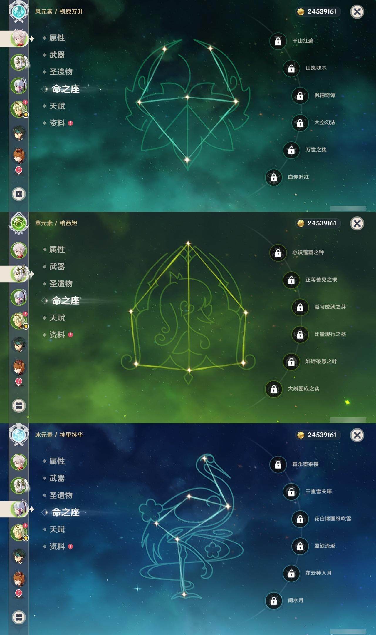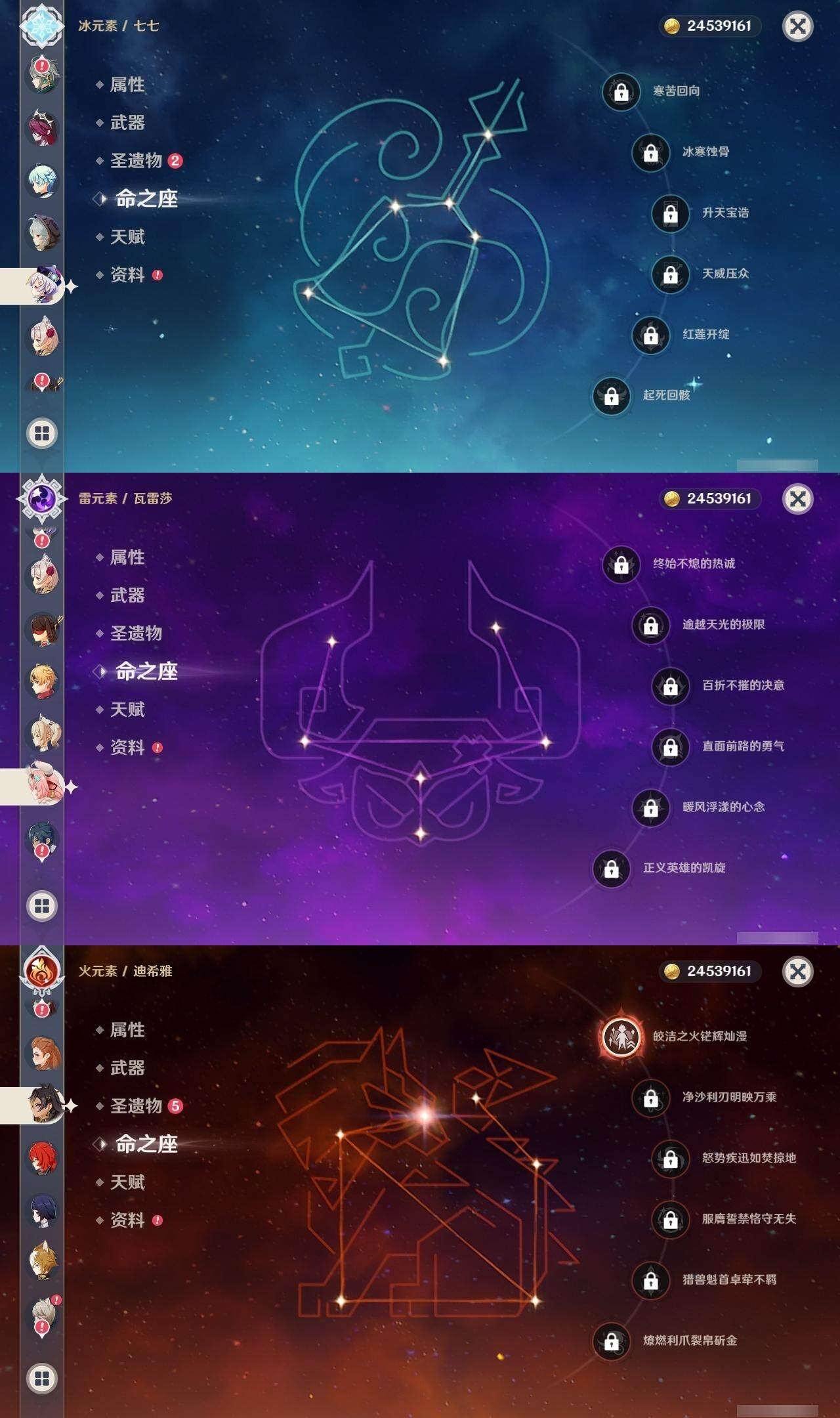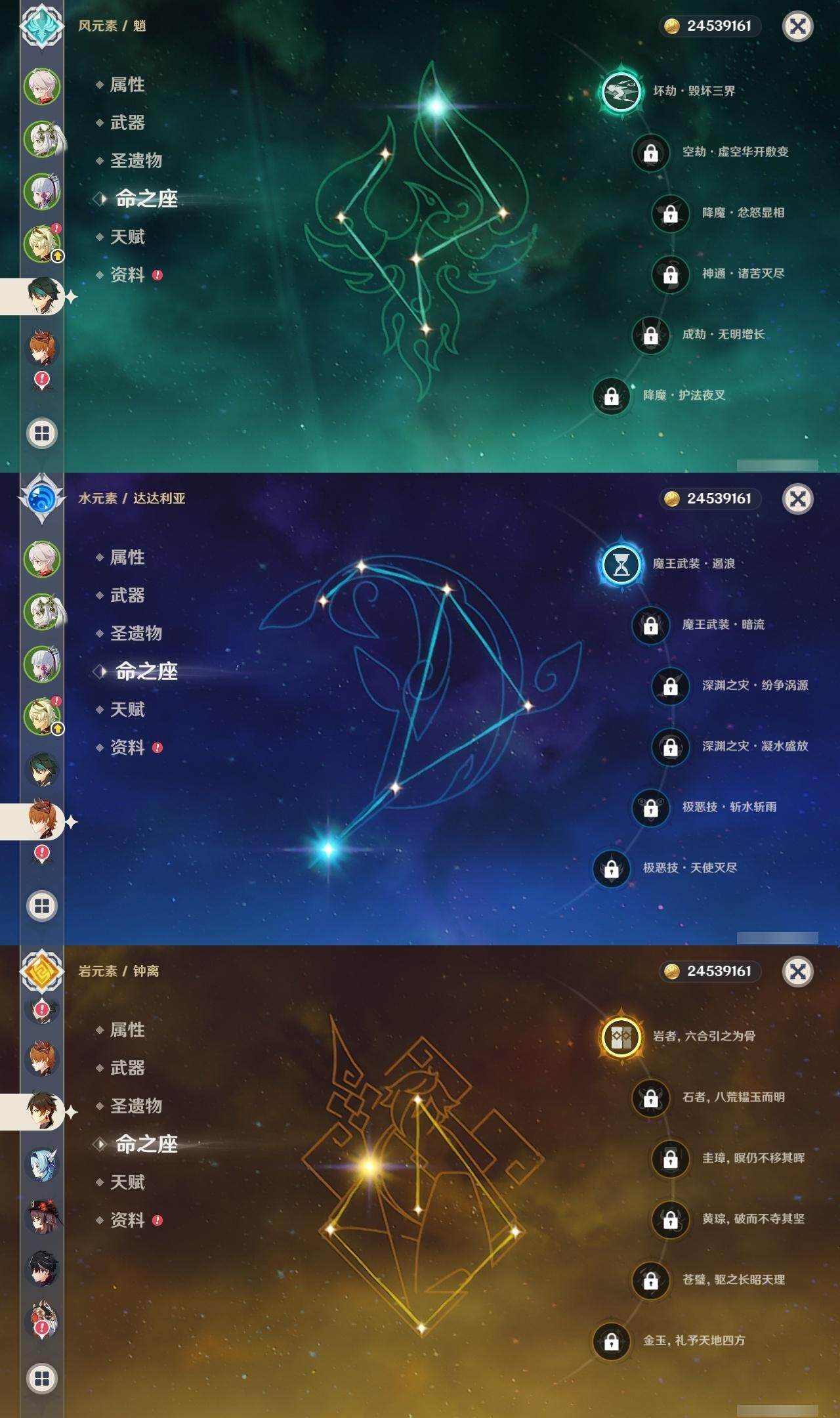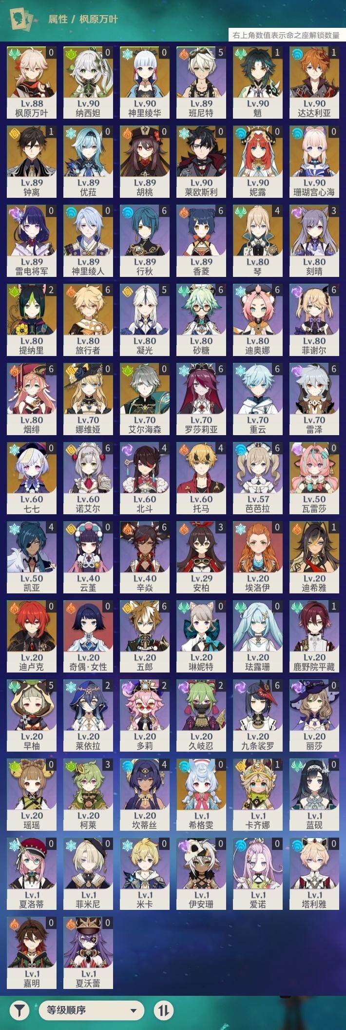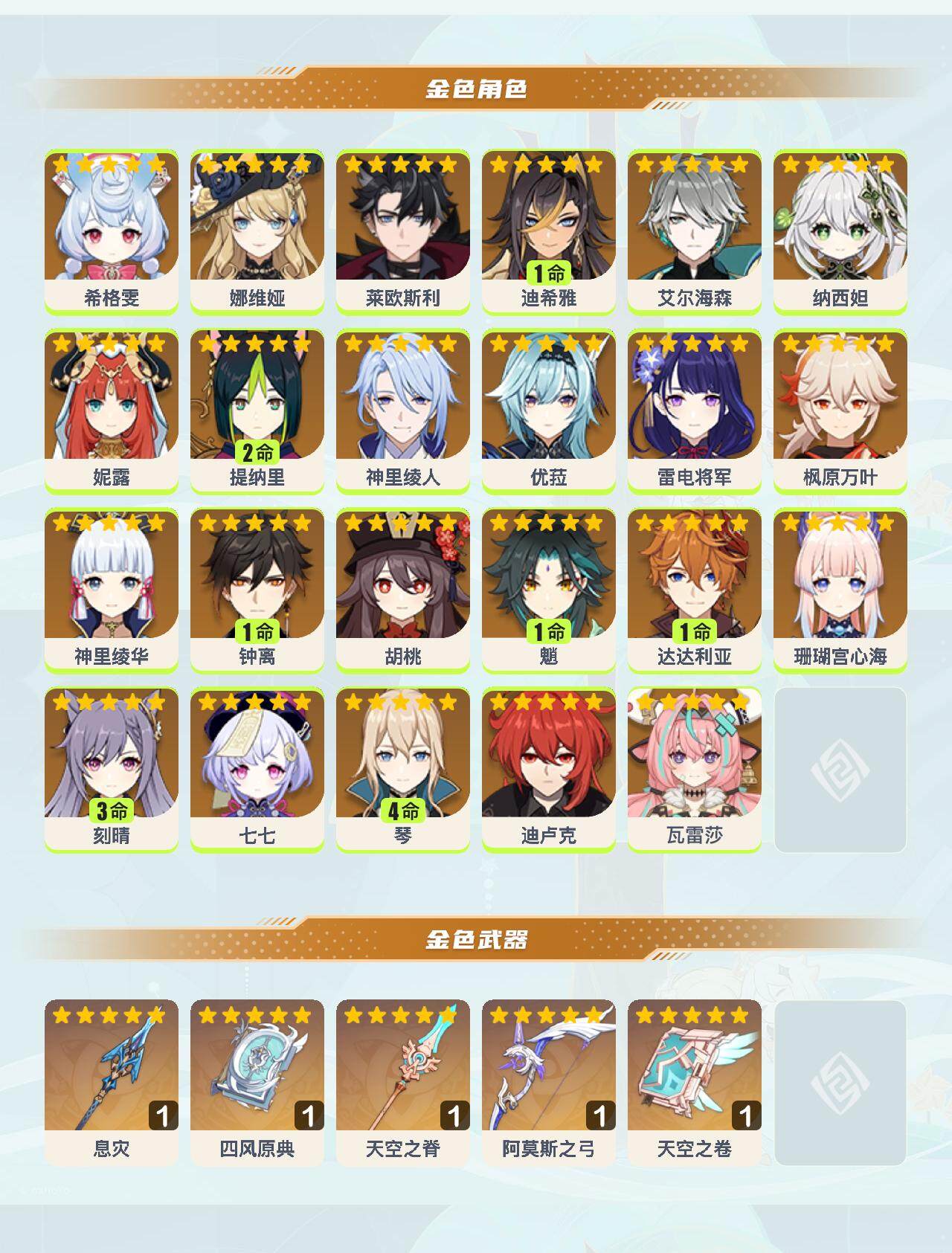 0命希格雯,0命娜维娅,0命莱欧斯利,1命迪希雅,0命艾尔海森,0命纳西妲,0命妮露,2命提纳里,0命神里绫人,0命优菈,0命雷电将军,0命枫原万叶,0命神里绫华,1命钟离,0命胡桃,1命魈,1命达达利亚,0命珊瑚宫心海,3命刻晴,0命七七,4命琴,0命迪卢克,0命瓦雷莎,精1息灾,精1四风原典,精1天空之脊,精1阿莫斯之弓,精1天空之卷