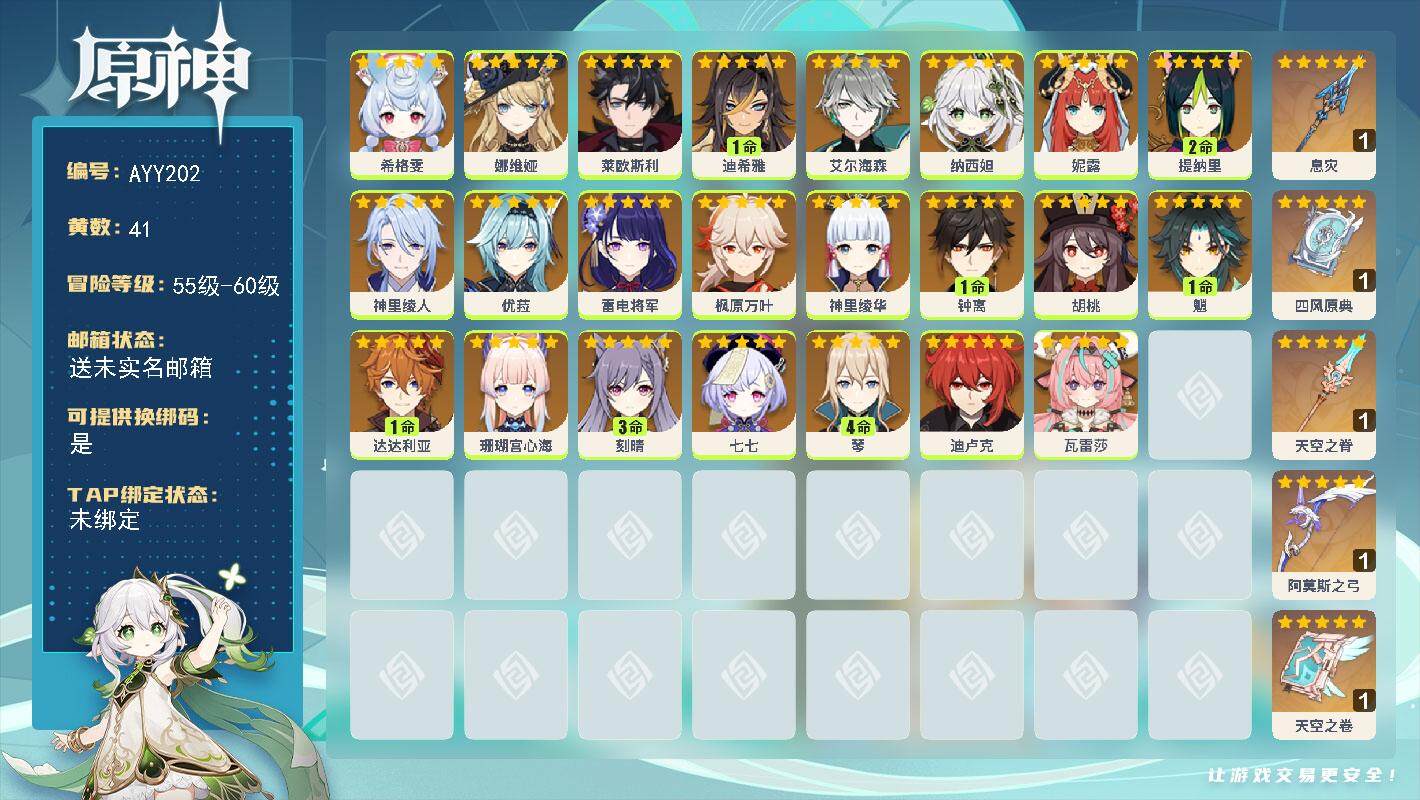 [15182351]59级/41黄/男主/23个五星角色/5个五星武器 0命希格雯,0命娜维娅,0命莱欧斯利,1命迪希雅,0命艾尔海森,0命纳西妲,0命妮露,2命提纳里,0命神里绫人,0命优菈,0命雷电将军,0命枫原万叶,0命神里绫华,1命钟离,0命胡桃,1命魈,1命达达利亚,0命珊瑚宫心海,3命刻晴,0命七七,4命琴,0命迪卢克,0命瓦雷莎,精1息灾,精1四风原典,精1天空之脊,精1阿莫斯之弓,精1天空之卷