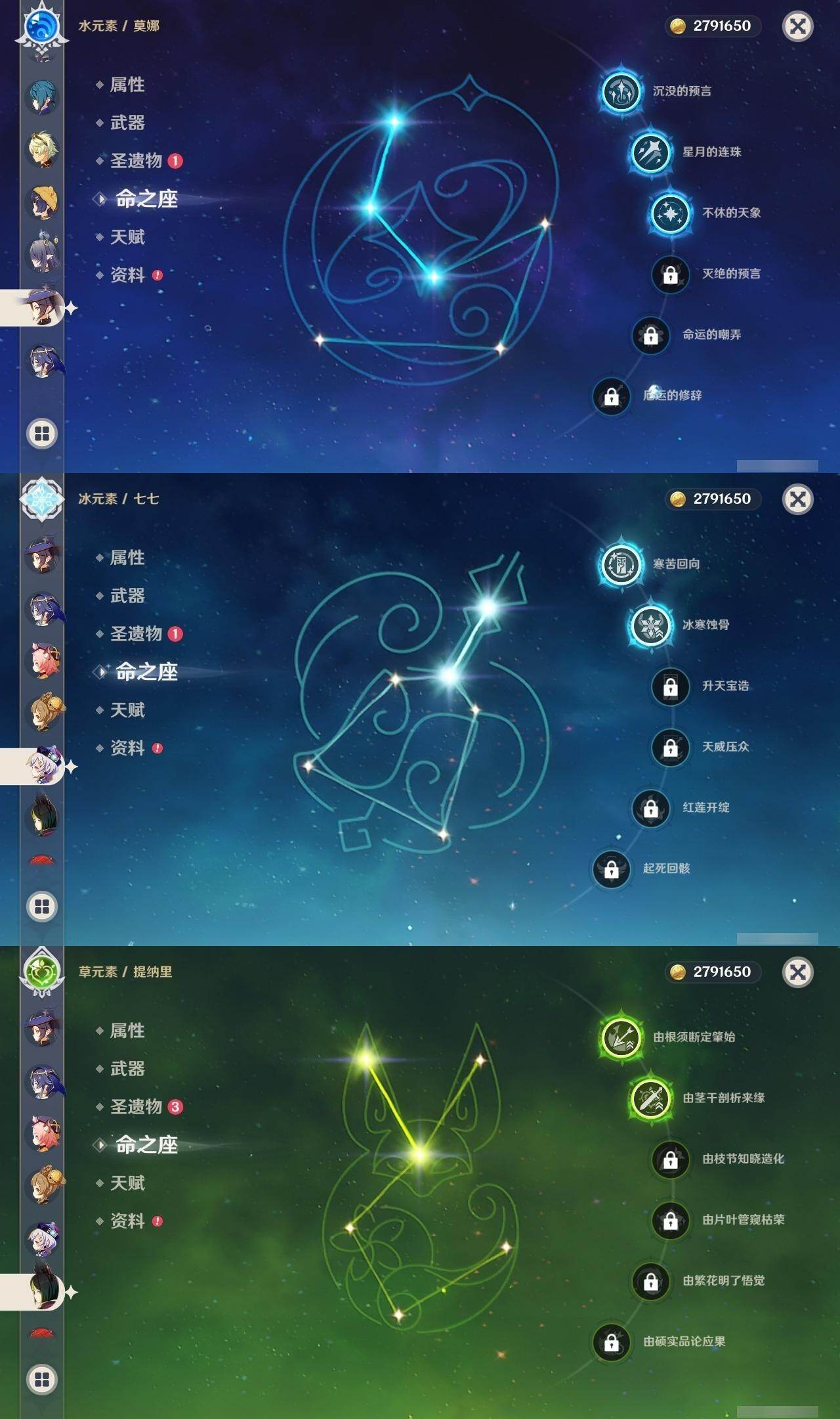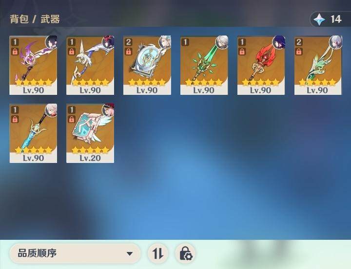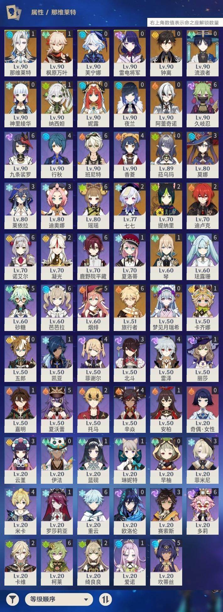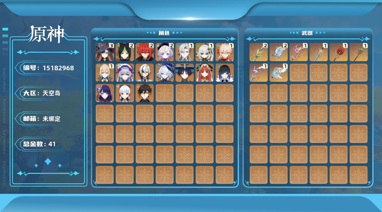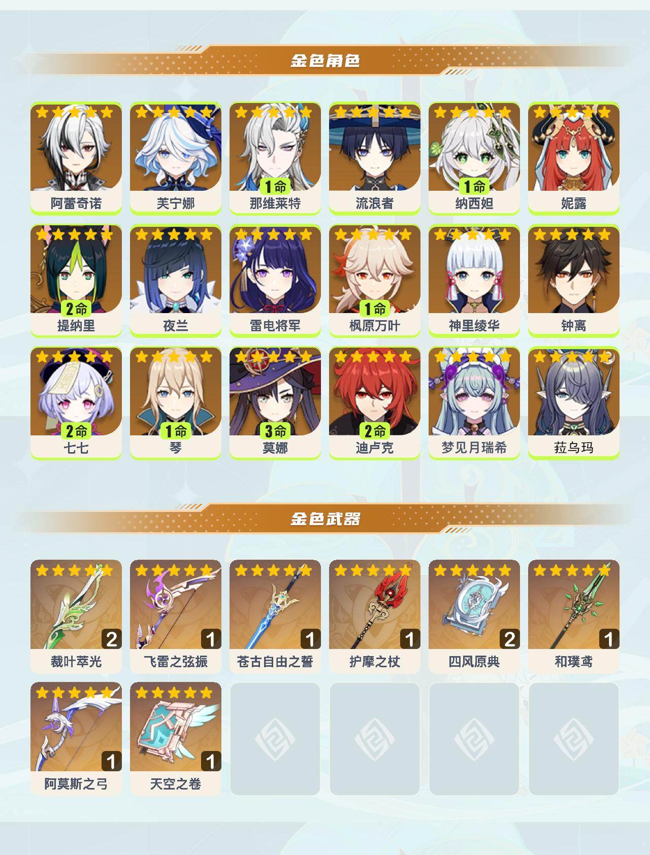 0命阿蕾奇诺,0命芙宁娜,1命那维莱特,0命流浪者,1命纳西妲,0命妮露,2命提纳里,0命夜兰,0命雷电将军,1命枫原万叶,0命神里绫华,0命钟离,2命七七,1命琴,3命莫娜,2命迪卢克,0命梦见月瑞希,0命菈乌玛,精2裁叶萃光,精1飞雷之弦振,精1苍古自由之誓,精1护摩之杖,精2四风原典,精1和璞鸢,精1阿莫斯之弓,精1天空之卷