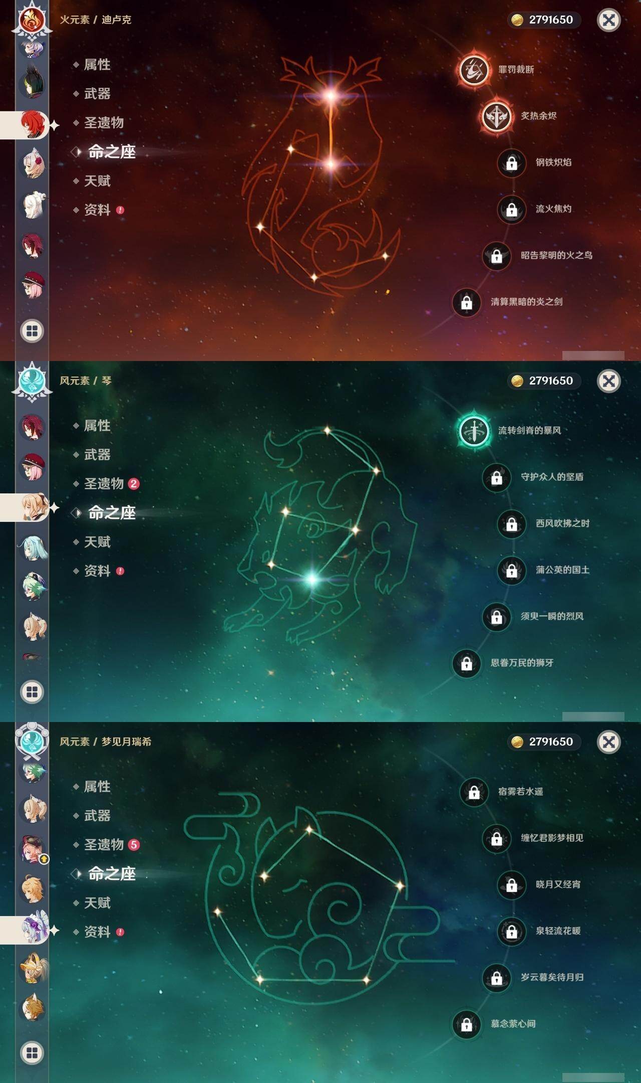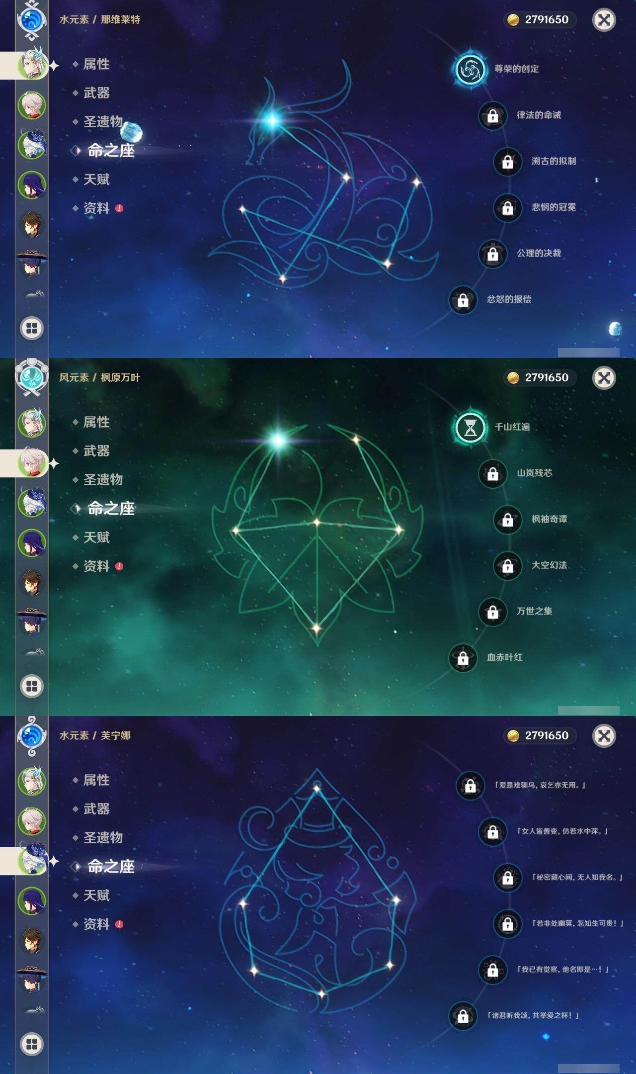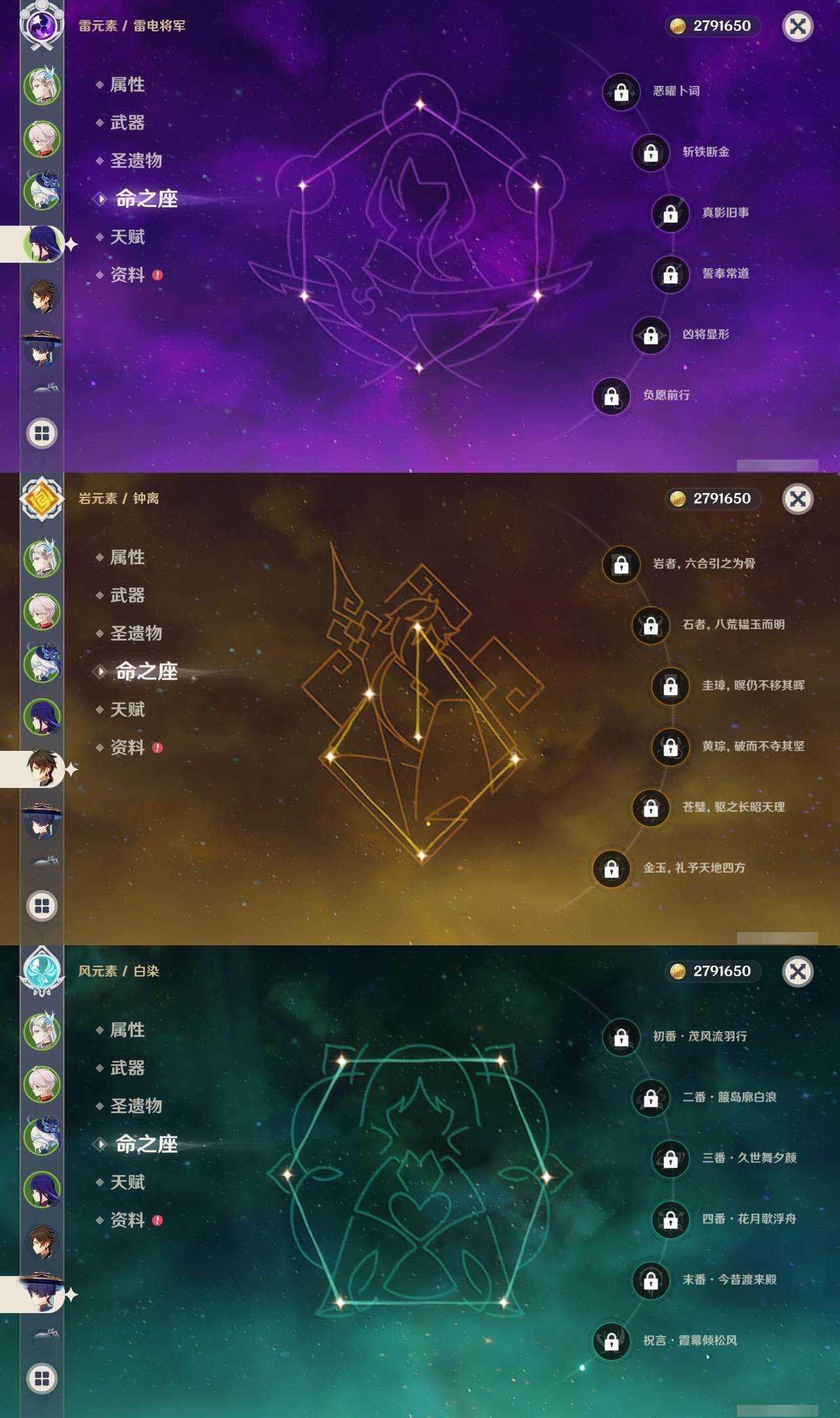 0命阿蕾奇诺,0命芙宁娜,1命那维莱特,0命流浪者,1命纳西妲,0命妮露,2命提纳里,0命夜兰,0命雷电将军,1命枫原万叶,0命神里绫华,0命钟离,2命七七,1命琴,3命莫娜,2命迪卢克,0命梦见月瑞希,0命菈乌玛,精2裁叶萃光,精1飞雷之弦振,精1苍古自由之誓,精1护摩之杖,精2四风原典,精1和璞鸢,精1阿莫斯之弓,精1天空之卷
