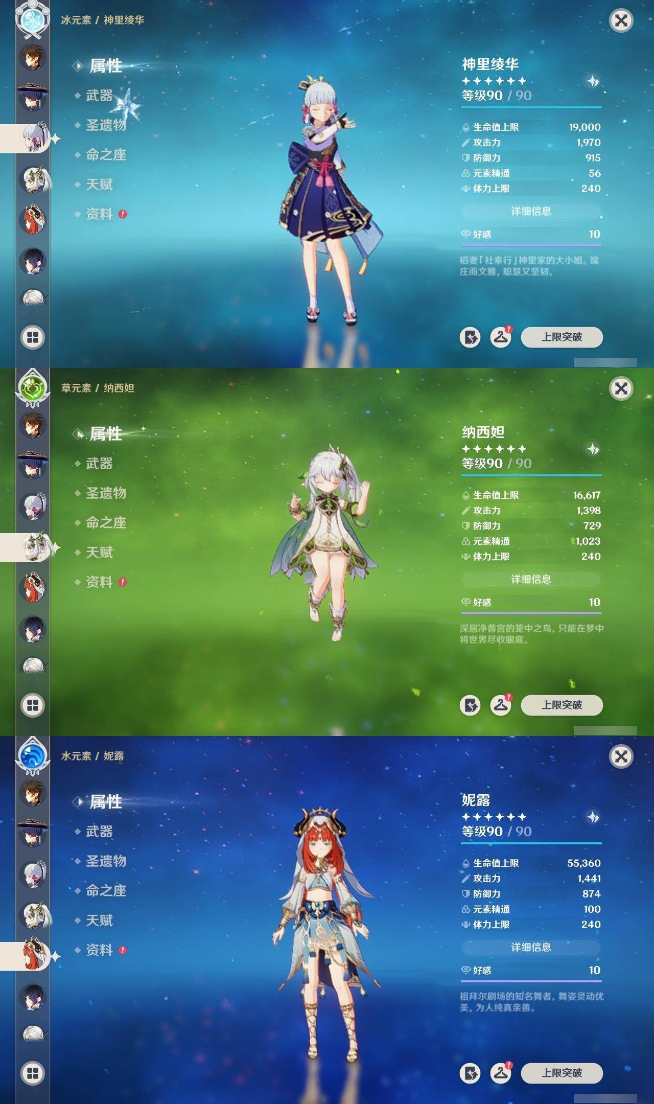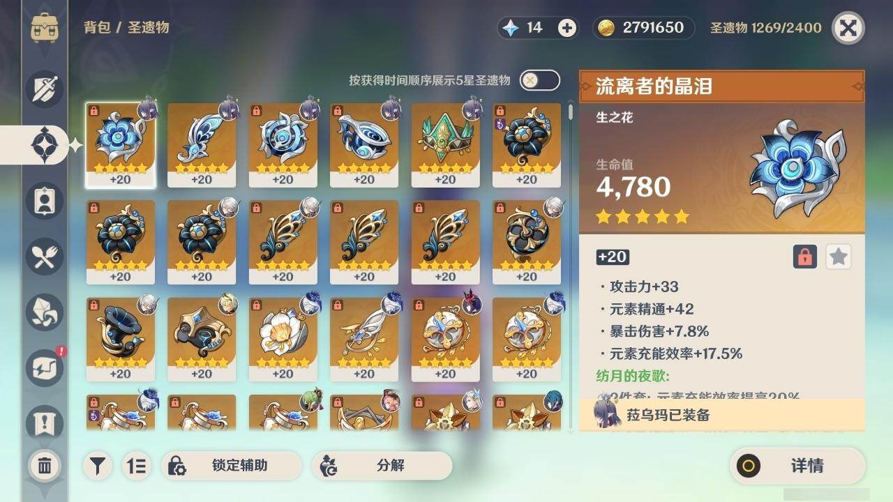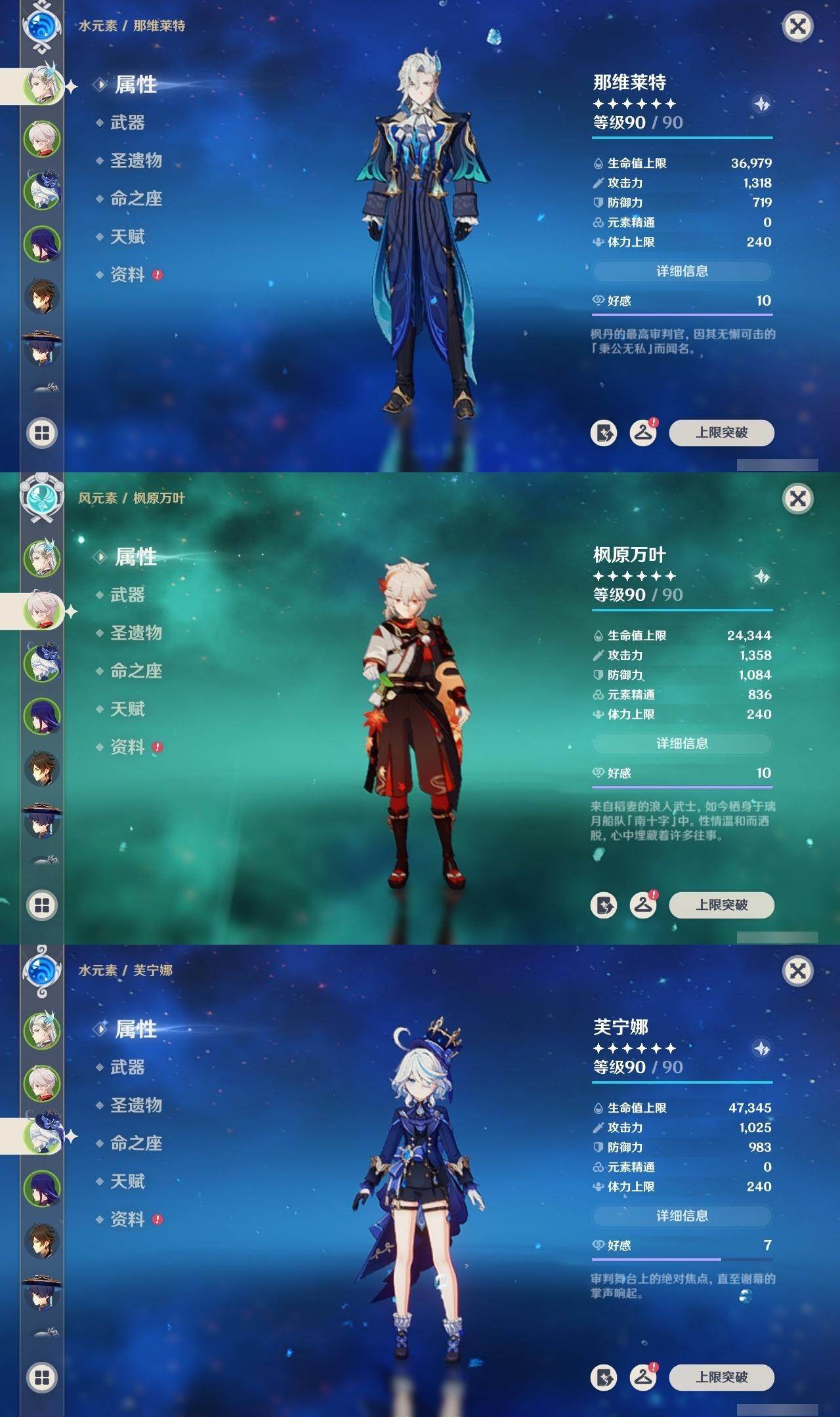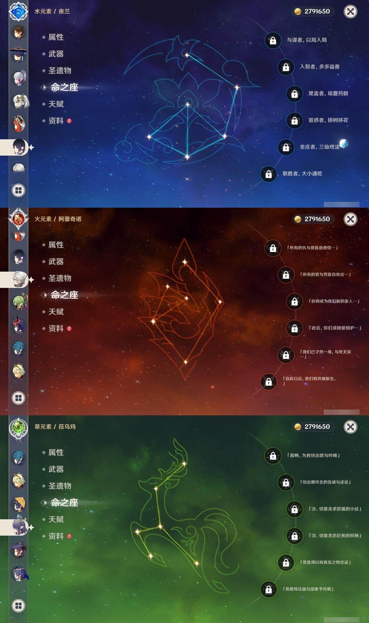 0命阿蕾奇诺,0命芙宁娜,1命那维莱特,0命流浪者,1命纳西妲,0命妮露,2命提纳里,0命夜兰,0命雷电将军,1命枫原万叶,0命神里绫华,0命钟离,2命七七,1命琴,3命莫娜,2命迪卢克,0命梦见月瑞希,0命菈乌玛,精2裁叶萃光,精1飞雷之弦振,精1苍古自由之誓,精1护摩之杖,精2四风原典,精1和璞鸢,精1阿莫斯之弓,精1天空之卷