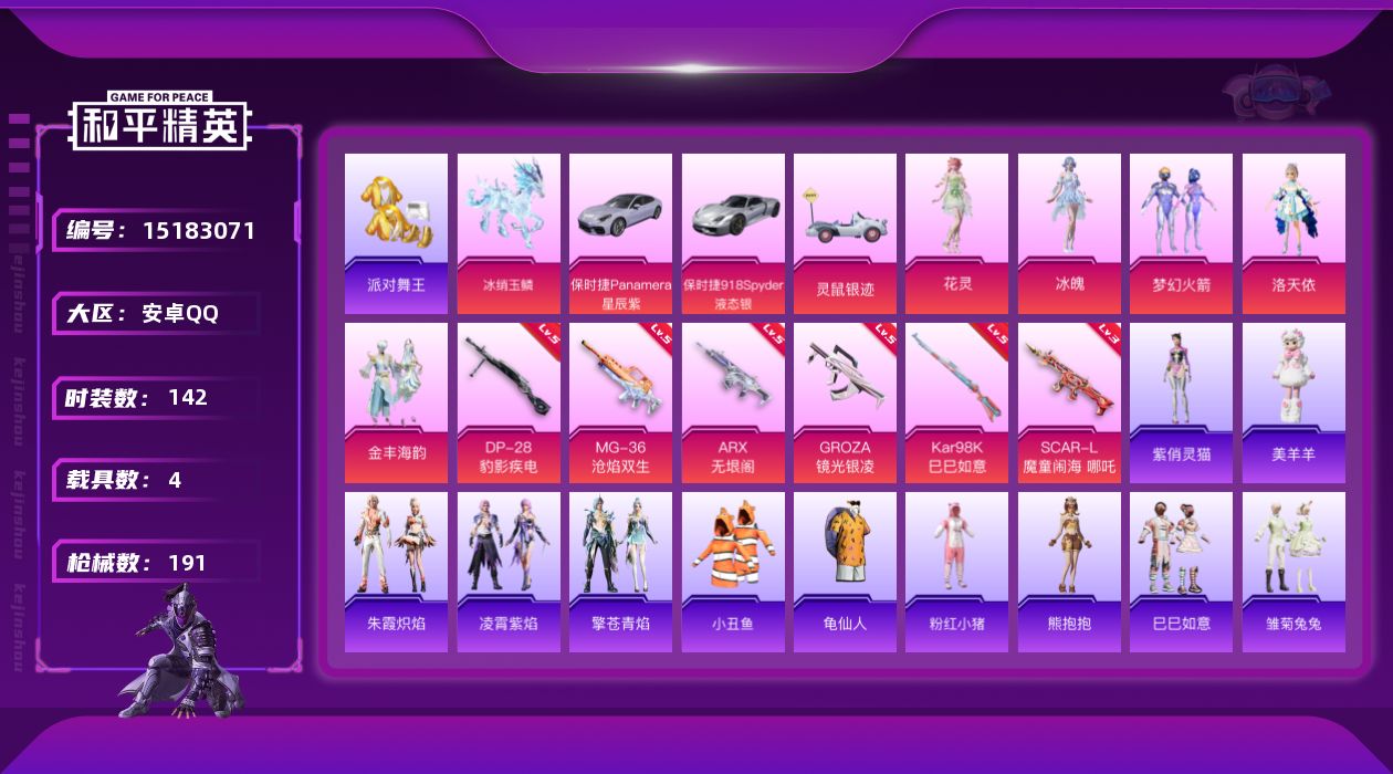 [15183071]【店主推荐捡漏号!可直接换绑】/素材身法号/璀璨碎片1474 安卓 手Q-5粉装-6特效枪-4载具-5粉色飞行器-6.1w热力值-13王牌印记-142套装-191枪皮【热门品类】:粉装-梦幻火箭,套装-派对舞王,套装-小丑鱼,套装-龟仙人,套装-粉红小猪【粉色载具】:保时捷Panamera(星辰紫),保时捷918 Spyder(液态银),灵鼠银迹,冰绡玉鳞【粉色套装】:粉装-梦幻火箭,角色-洛天依,粉装-金丰海韵,角色-花灵,角色-冰魄【粉色枪皮等级】:SCAR-L-魔童闹海 哪吒(三级),GROZA-镜光银凌(五级),ARX-无垠阁(五级),Kar98K-巳巳如意(五级),DP-28-豹影疾电(五级),MG-36-沧焰双生(五级)【粉色飞行器】:梦幻火箭飞行器,飞天猪飞行器,灵珠游龙飞行器