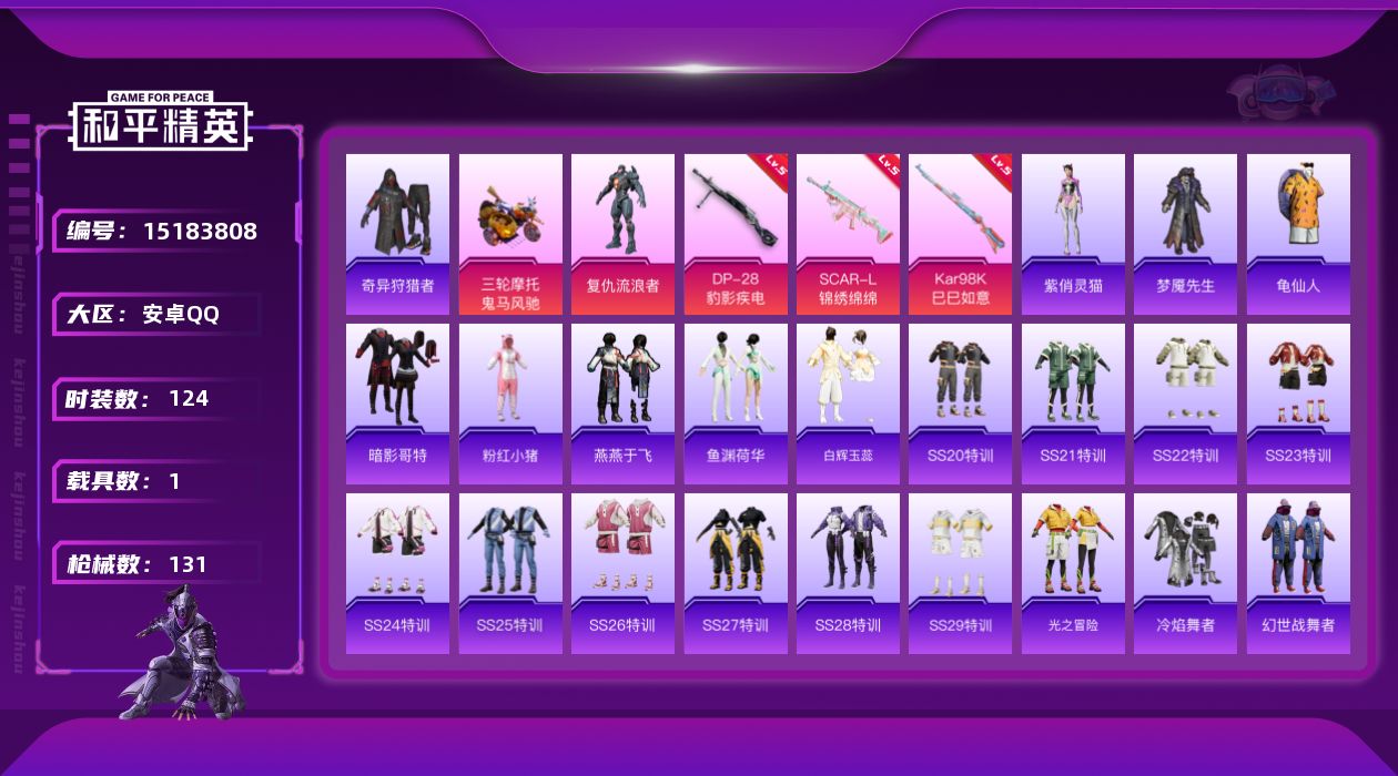 [15183808]【店主推荐捡漏号!可直接换绑】安卓 手Q-1粉装-3特效枪-1载具-3粉色飞行器-3.9w热力值-5王牌印记-124套装-131枪皮【热门品类】:套装-奇异狩猎者,套装-龟仙人,套装-暗影哥特,套装-粉红小猪【粉色载具】:鬼马风驰【粉色套装】:角色-复仇流浪者【粉色枪皮等级】:SCAR-L-锦绣绵绵(五级),Kar98K-巳巳如意(五级),DP-28-豹影疾电(五级)【粉色飞行器】:花傲天飞行器,繁龙极客飞行器