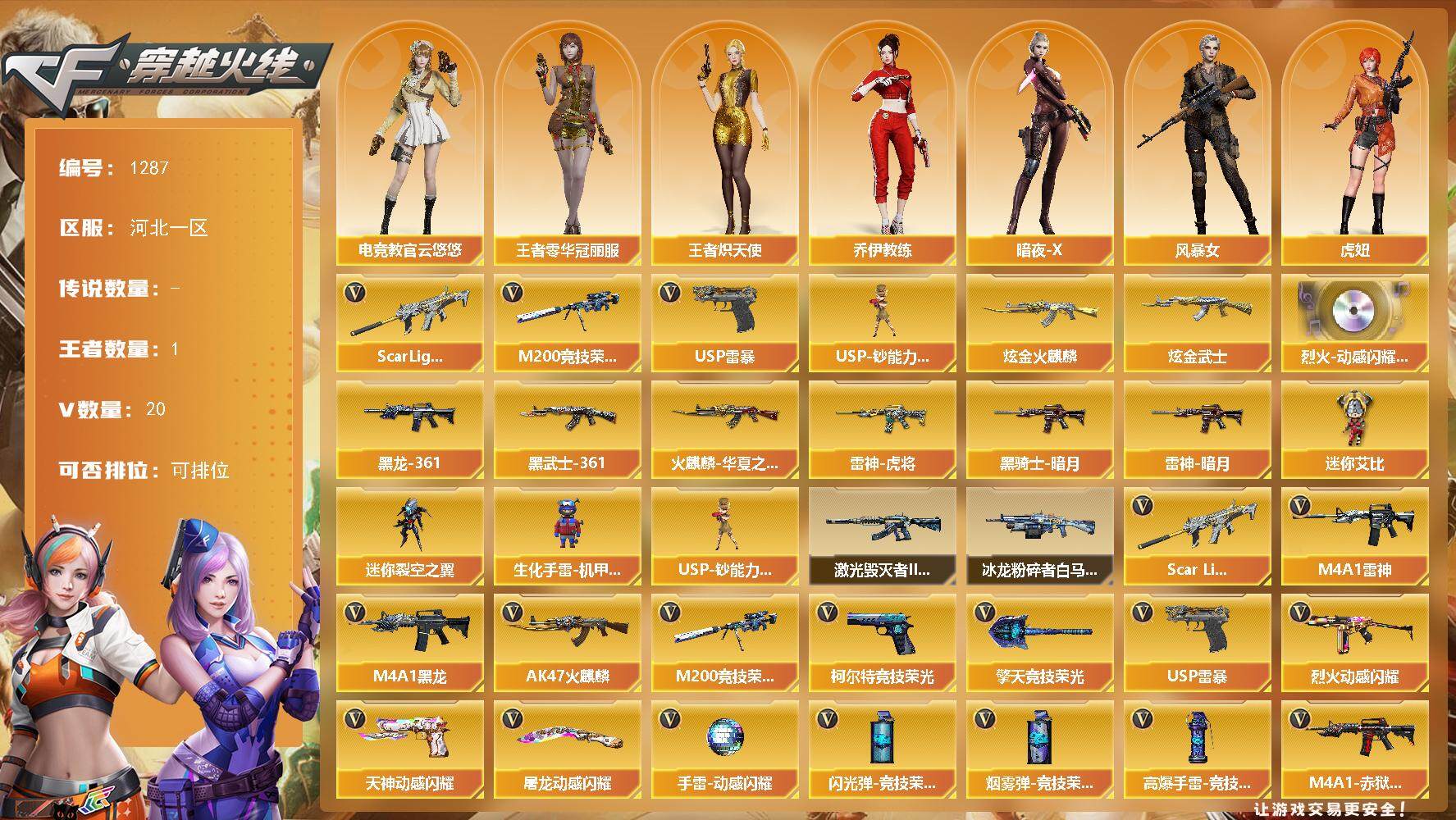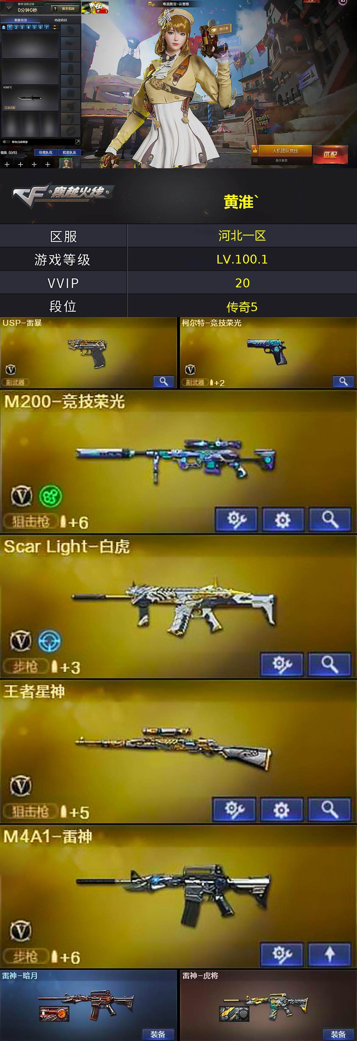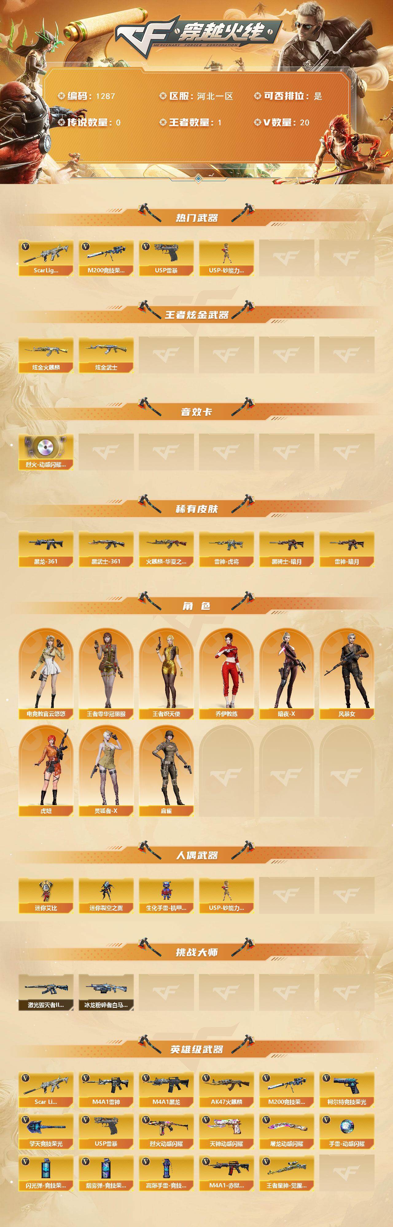 [15185759]河北一区-20V-1王者-2炫金 【热门武器】:Scar Light-白虎,M200-竞技荣光,USP-钞能力灵狐,USP-雷暴 【王者炫金武器】:炫金火麒麟,炫金武士 【音效卡】:烈火-动感闪耀 音效卡 【皮肤】:雷神-暗月,雷神-虎将,火麒麟-华夏之心,M4A1-黑龙-361*2,黑骑士-暗月,AK47-黑武士-361 【角色】:电竞教官-云悠悠,王者零-华冠丽服,王者炽天使,乔伊教练,暗