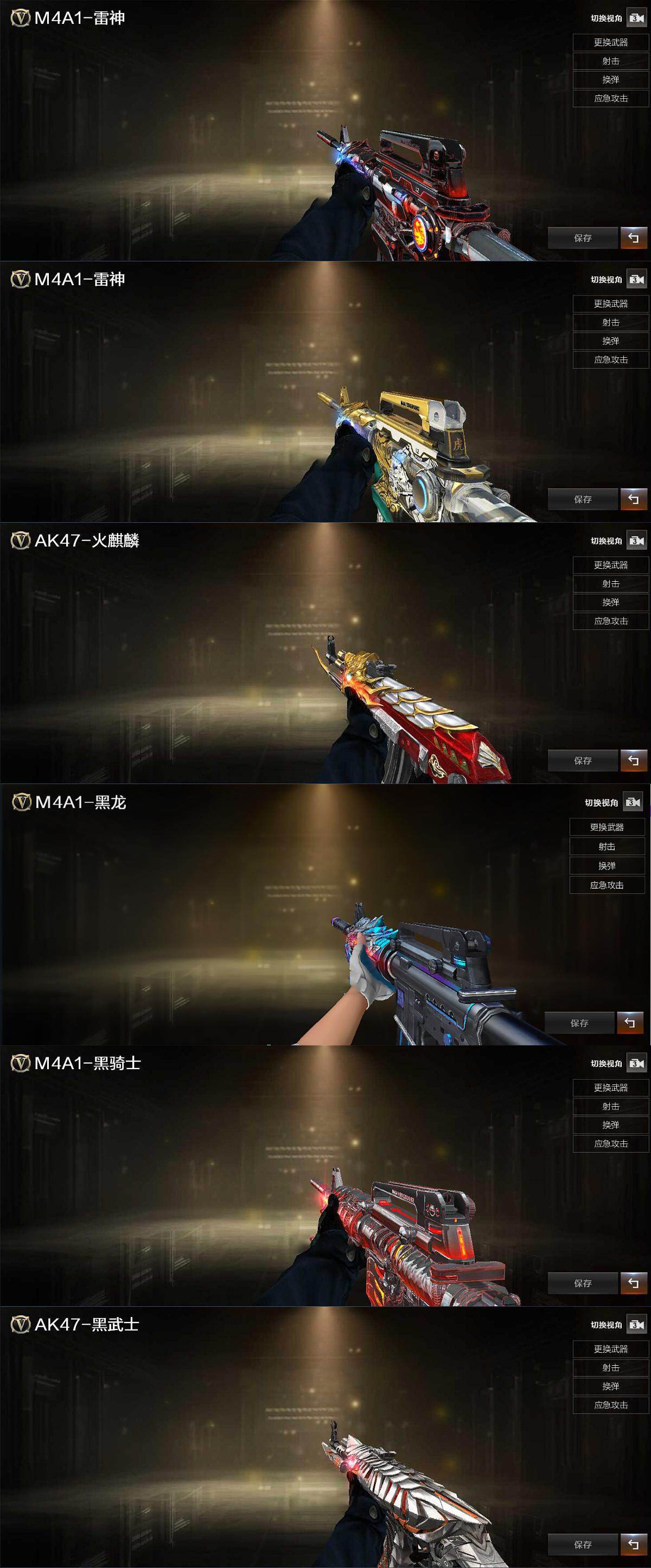 【皮肤】:雷神-暗月,雷神-虎将,火麒麟-华夏之心,M4A1-黑龙-361*2,黑骑士-暗月,AK47-黑武士-361