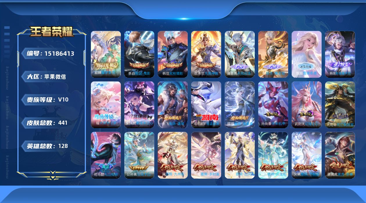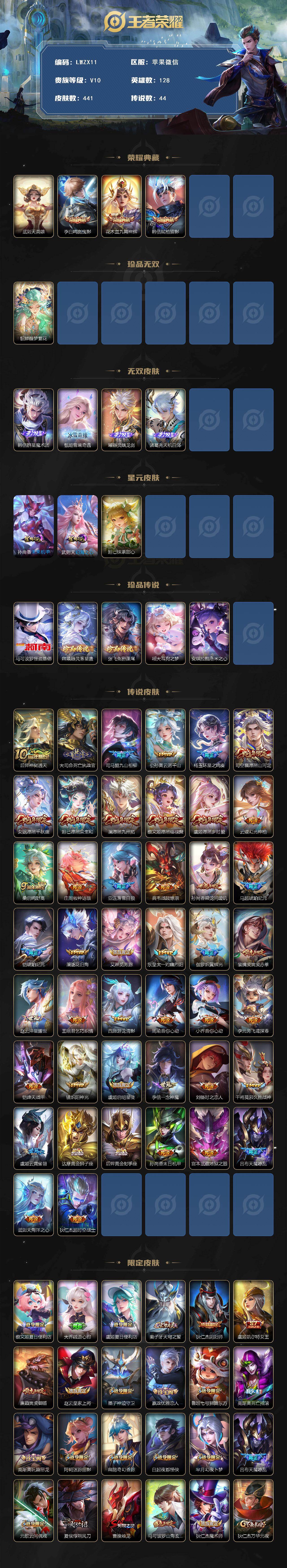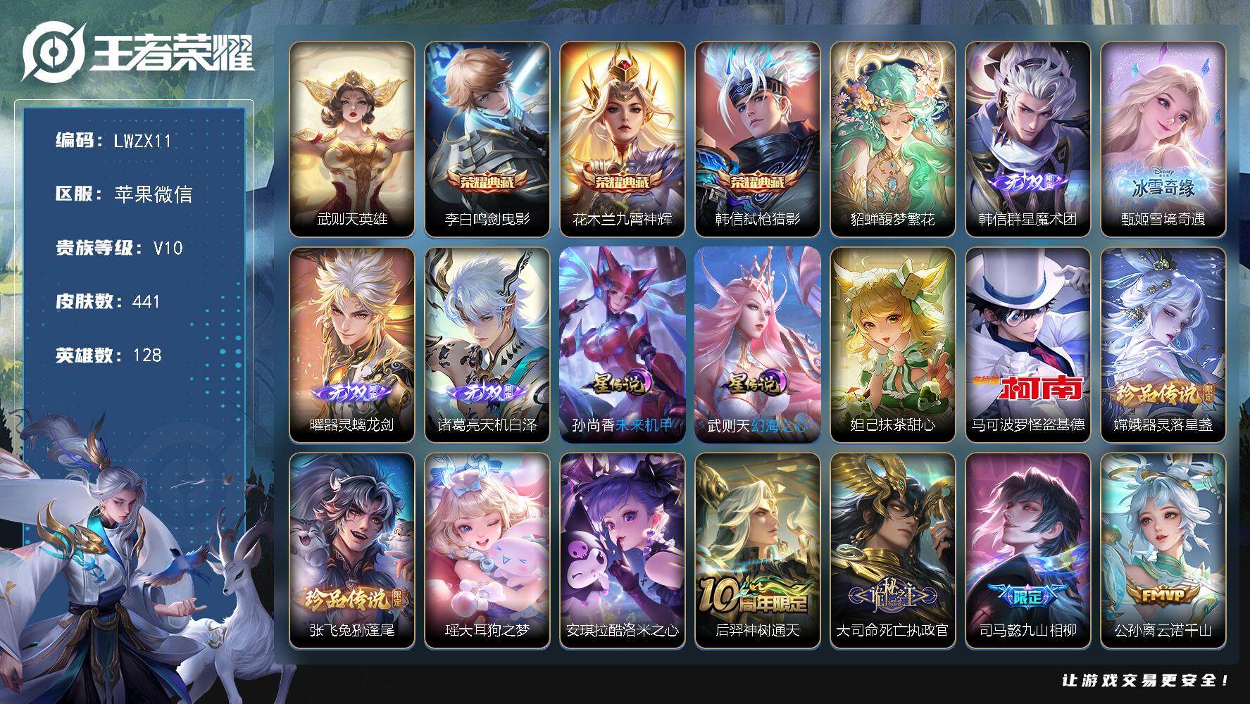 [15186413]有二次【特价出售/店主推荐】苹果WX-V10-最强王者段位-128英雄-441皮肤-3典藏皮肤-1典藏英雄-1珍品无双-4无双-5珍品传说-44传说-132史诗-2星元