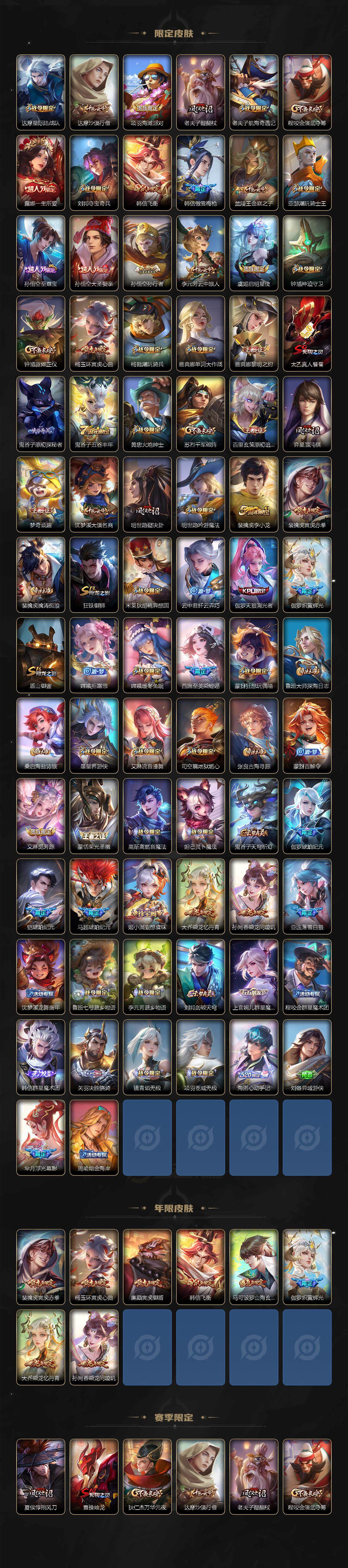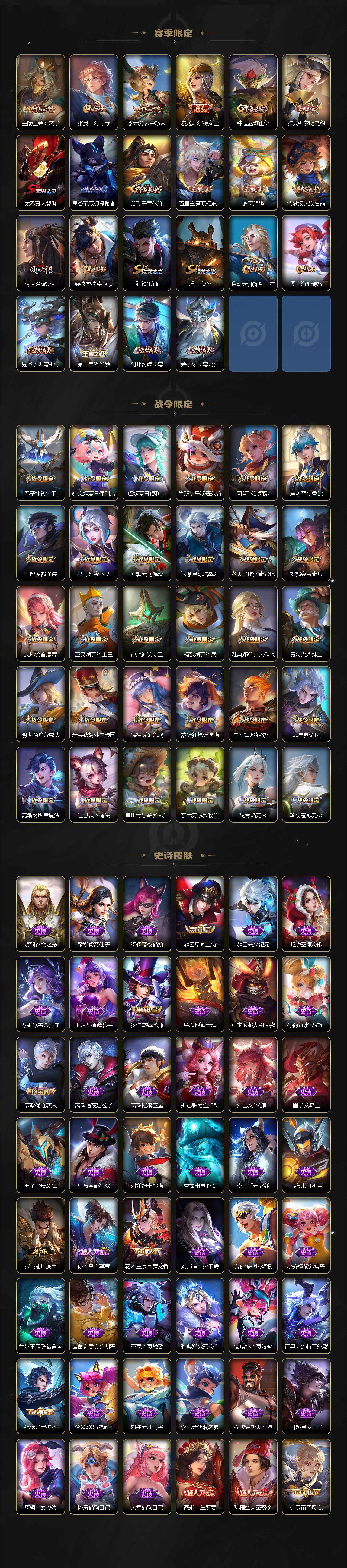 【限定皮肤】:蔡文姬夏日便利店,大乔绒语心约,虞姬夏日便利店,姜子牙天穹之誓,狄仁杰阴阳师,虞姬凯尔特女王,廉颇寅虎御盾,赵云皇家上将,墨子神迹守卫,嬴政优雅恋人,鲁班七号狮舞东方,高渐离死亡摇滚,高渐离玩趣恶龙,阿轲迷踪丽影,扁鹊奇幻香踪,白起夜都怪侠,芈月幻夜卜梦,吕布天魔缭乱,元歌云间偶戏,夏侯惇朔风刀,曹操烛龙,马可波罗山海玄木吟,狄仁杰魔术师,狄仁杰万华元夜,达摩星际陆战队,达摩沙漠行僧,项羽海滩派对,老夫子醍醐杖,老夫子航海奇遇记,程咬金演武夺筹,露娜一生所爱,刘邦夺宝奇兵,韩信飞衡,韩信傲雪梅枪,兰陵王金庭之子,亚瑟潮玩骑士王,孙悟空至尊宝,孙悟空大圣娶亲,孙悟空孙行者,李元芳云中旅人,虞姬启明星使,钟馗神迹守卫,钟馗驱傩正仪,杨玉环寅虎心曲,杨戬潮玩骑兵,雅典娜单词大作战,雅典娜黎明之约,太乙真人饕餮,鬼