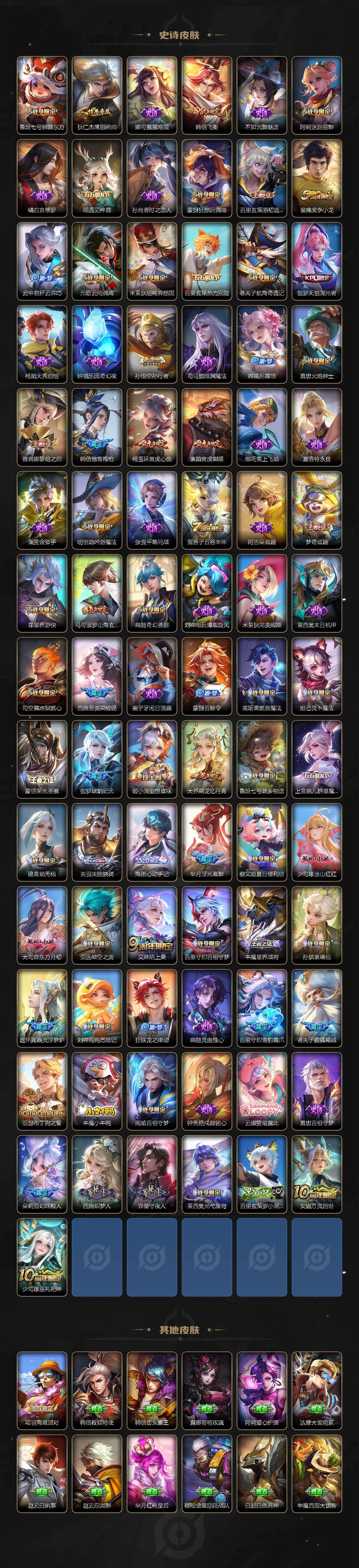 【传说皮肤】:后羿神树通天,大司命死亡执政官,司马懿九山相柳,公孙离云诺千山,杨玉环星之鸣奏,司空震愿照山河定,女娲愿照千秋盛,妲己愿照众生和,澜愿照九州拓,蔡文姬愿照福禄聚,虞姬愿照岁时盈,云缨幻光神枪,桑启鸣野蒿,庄周牧神诗旅,亚连落雪白狼,典韦战鼓燎原,孙尚香乘龙问璇玑,马超琥珀纪元,铠琥珀纪元,澜逐花归海,艾琳觅芳踪,东皇太一灼幽烈阳,伽罗炽翼辉光,裴擒虎寅虎赤拳,赵云淬星耀世,王昭君乞巧织情,西施游龙清影,周瑜音你心动,小乔音你心动,李元芳飞鸢探春,铠绛天战甲,镜炽阳神光,虞姬启明星使,李信一念神魔,刘备时之恋人,干将莫邪久胜战神,虞姬云霓雀翎,达摩黄金狮子座,后羿黄金射手座,孙尚香末日机甲,宫本武藏地狱之眼,吕布天魔缭乱,武则天海洋之心,狄仁杰超时空战士