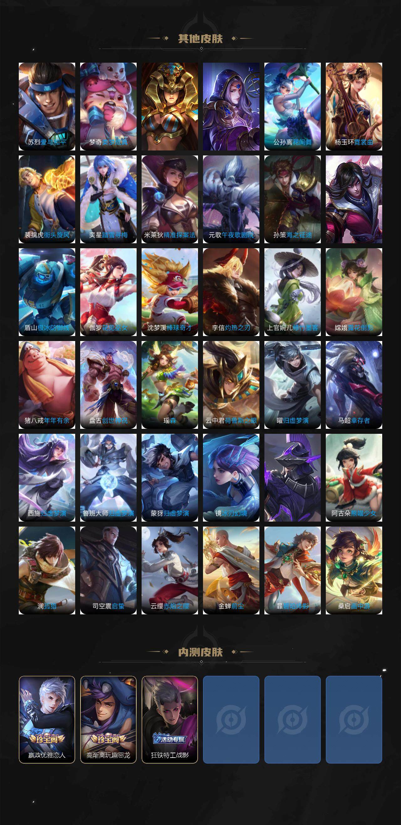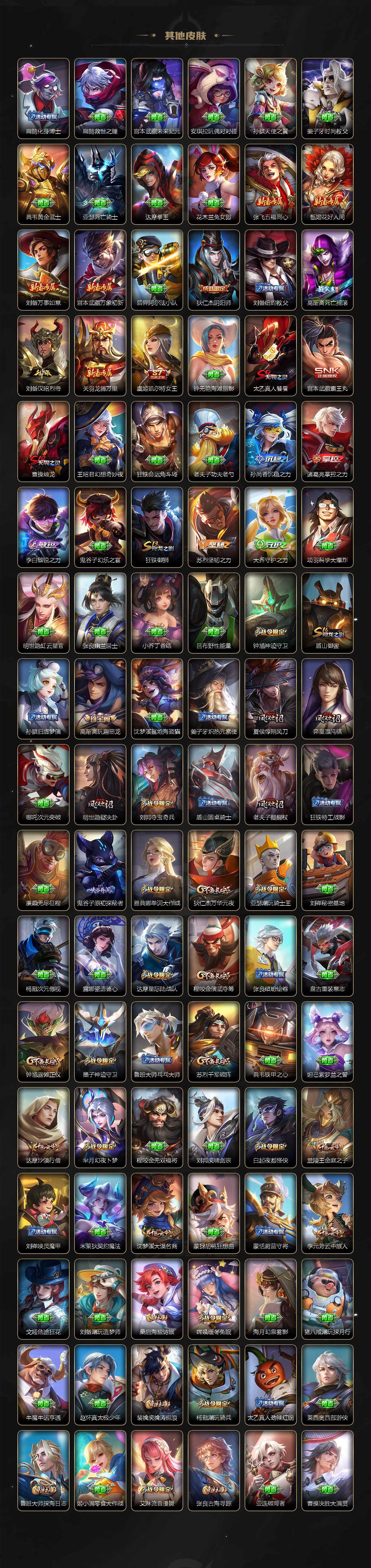 瑶遇见神鹿,娜可露露晚萤,伽罗箭羽风息,李元芳逐浪之夏,不知火舞魅语,大乔猫狗日记,孙策猫狗日记,阿轲节奏热浪,露娜紫霞仙子,诸葛亮黄金分割率,王昭君偶像歌手,项羽苍穹之光,孙尚香时之恋人,阿轲暗夜猫娘,雅典娜冰冠公主,吕布末日机甲,橘右京修罗,墨子龙骑士,嬴政摇滚巨星,刘禅绅士熊喵,刘禅天才门将,白起星夜王子,安琪拉心灵骇客,程咬金功夫厨神,刘邦德古拉伯爵,兰陵王暗隐猎兽者,曹操幽灵船长,宫本武藏鬼剑武藏,司马懿暗渊魔法,亚瑟心灵战警,钟馗乐园奇幻夜,杨戬天秀·启明,蔡文姬舞动绿茵,廉颇地狱岩魂,小乔缤纷独角兽,夏侯惇乘风破浪,花木兰水晶猎龙者,铠曙光守护者,百里玄策热力回旋,墨子金属风暴,百里玄策原初追逐者,吕布圣诞狂欢,貂蝉圣诞恋歌,百里守约特工魅影,嬴政暗夜贵公子,嫦娥拒霜思,雅典娜黎明之约,李白千年之狐,哪吒雪上飞焰,夏洛特永昼,澜赏金猎手,张良千筹问战,阿古朵顽趣,刘禅电玩·爆裂旋风,莱西奥末日机甲,姜子牙闲日渔趣,蒙犽百解令,高渐离燃音魔法,伽罗琥珀纪元,大乔乘龙·忆丹青,上官婉儿群星魔术团,关羽决胜骁骑,海诺心动手记,赵怀真器灵·浮梦炉