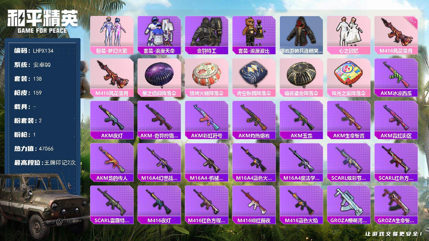 [15186435]【特价出售/店主推荐】安卓 手Q-2粉装-1特效枪-0载具-0粉色飞行器-47066热力值-2王牌印记-138套装-159枪皮 【热门品类】:粉装-梦幻火箭,套装-浪漫天命,套装-金羽特工,套装-浪漫波比,熔岩游骑兵连帽夹克 【粉色套装】:粉装-梦幻火箭,粉装-心之回忆 【粉色枪皮等级】:M416-风花雪月(七级) 【粉色枪皮】:M416-风花雪月 【粉色降落伞】:星之信仰降落伞,锦绣火鲤降落伞,青空秋雨降落伞,暗夜鎏金降落伞,炫光之旅降落伞 【稀有枪皮】:AKM-冰凉西瓜,AKM-夜灯,AKM-奇异狩猎者,AKM-彩虹符号,AKM-灼热熔岩,AKM-玉龙,AKM-生命誓言,AKM-霓虹街区,AKM-龙的传人,M16A4-幻世战舞者,M16A4-机械英豪,M16A4-蓝色火焰,M16A4-魔法学院,SCAR-L-炫彩节奏,SCAR-L-红色方程式,SCAR-L-雷霆特警,M416-夜灯,M416-红色方程式,M416-绯红前夜,M416-蓝色火焰,GROZA-懵萌河马,GROZA-生命誓言,GROZA-田园牧歌,GROZA-雷霆特警,GROZA-黑色刀锋,AUG-耀粉歌者,QBZ-彩虹符号,QBZ-神秘黑猫,QBZ-诡娃娃,M762-奇异狩猎者,M762-拳皇97,M762-牛气冲天,M762-生命誓言,M762-第五大道,M762-绯红前夜,M762-诡娃娃,Mk47-妙红点点,Mk47-炫光之旅,G36C-懵萌河马,G36C-荒野猎神,AC-VAL-天降萌叽,蜜獾-天降萌叽,UZI-众神之王,UZI-啾咪啾咪,UZI-红色方程式,UMP45-生命誓言,UMP45-蓝色火焰,UMP45-诡娃娃,Vector-彩虹符号,Vector-田园牧歌,Vector-黑色刀锋,汤姆逊-勇闯险境,汤姆逊-奇异狩猎者,汤姆逊-暗夜鎏金,汤姆逊-耀粉歌者,野牛-机械英豪,MP5K-众神之王,Kar98K-勇闯险境,Kar98K-古堡领主,Kar98K-炫彩节奏,Kar98K-王子的夏天,Kar98K-红色方程式,M24-众神之王,M24-冰封烈焰,SKS-勇闯险境,SKS-夜灯,SKS-未来歌姬,SKS-诡娃娃,VSS-华贵君王,VSS-彩虹符号,VSS-田园牧歌,VSS-繁花小夜曲,VSS-雷霆特警,VSS-黑色刀锋,Mini14-梦幻火箭,Mini14-炫彩节奏,Mini14