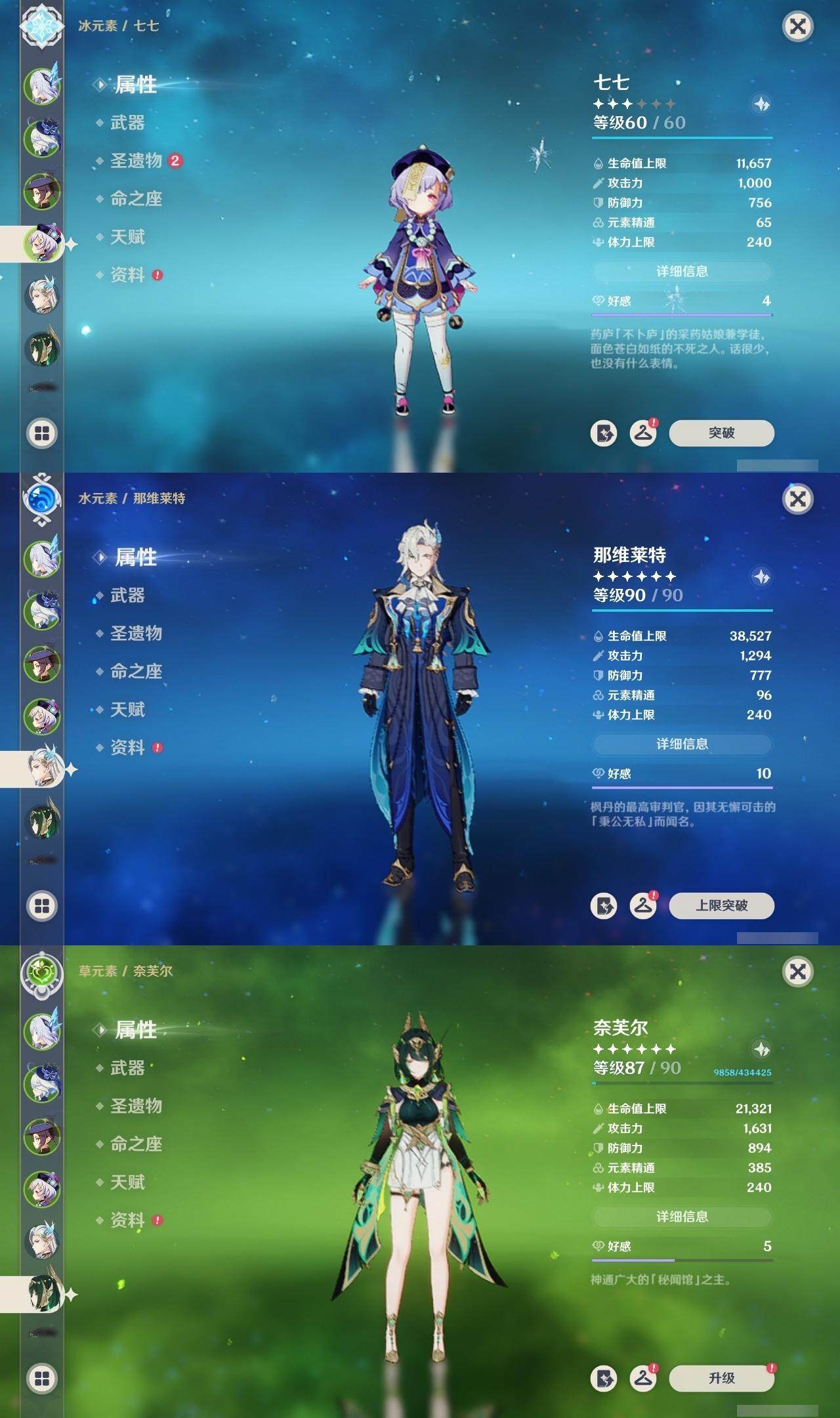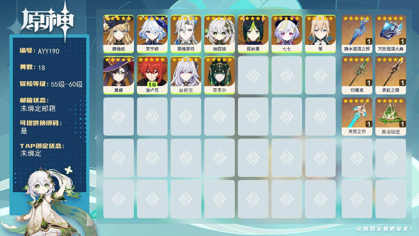 [15186493]57级/18黄/男主/11个五星角色/6个五星武器 0命娜维娅,0命芙宁娜,0命那维莱特,0命纳西妲,0命提纳里,0命七七,0命琴,0命莫娜,1命迪卢克,0命丝柯克,0命奈芙尔,精1静水流涌之辉,精1万世流涌大典,精1和璞鸢,精1贯虹之槊,精1天空之刃,精1真语秘匣