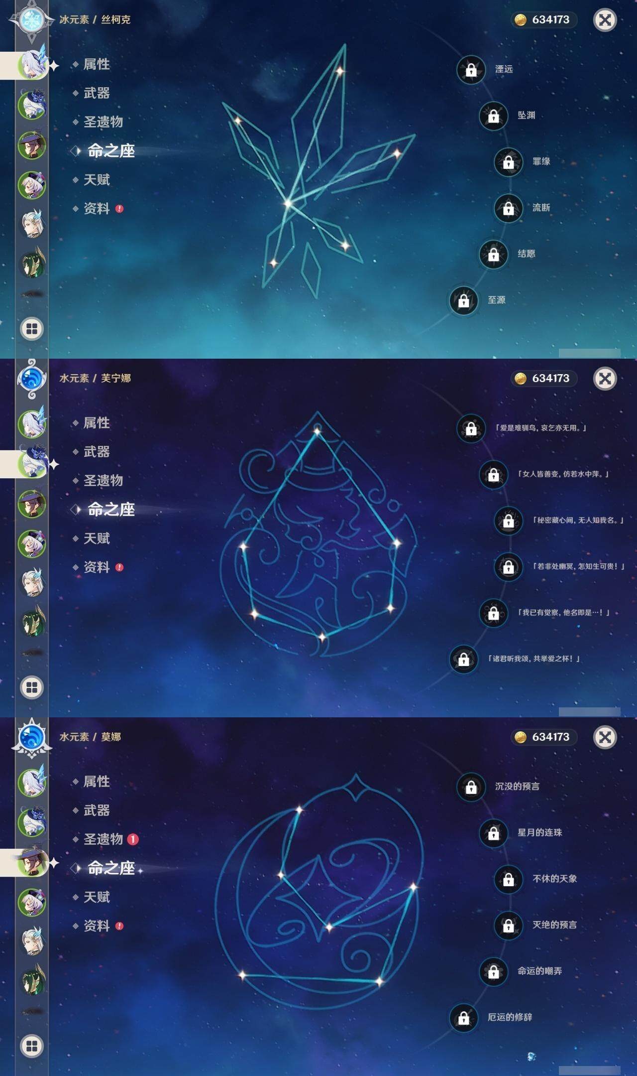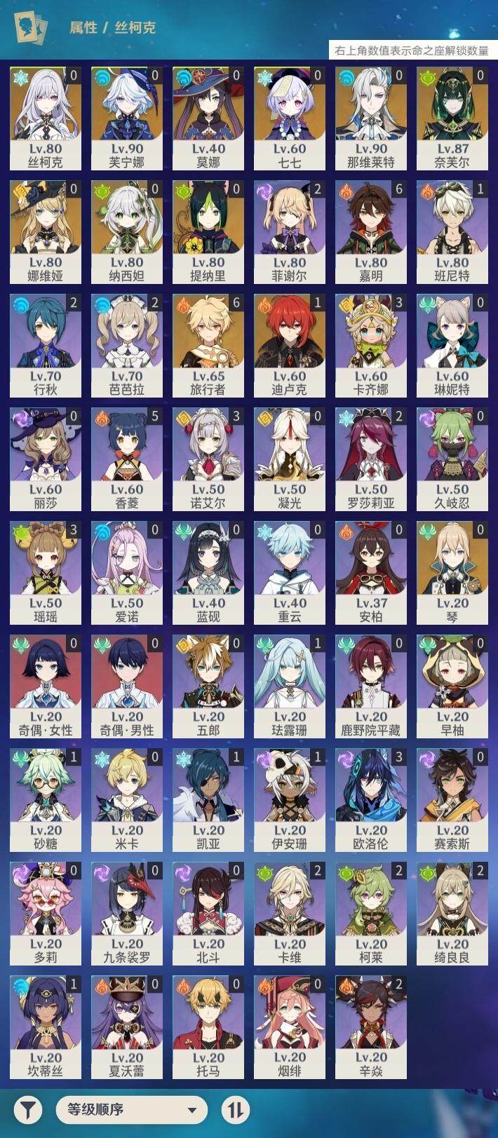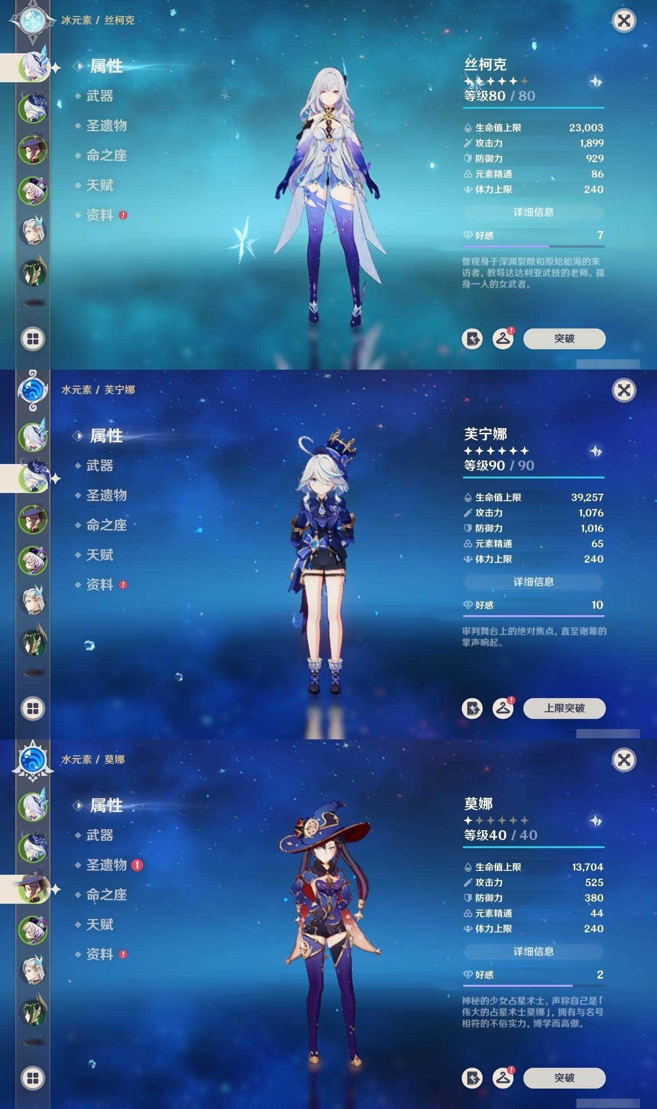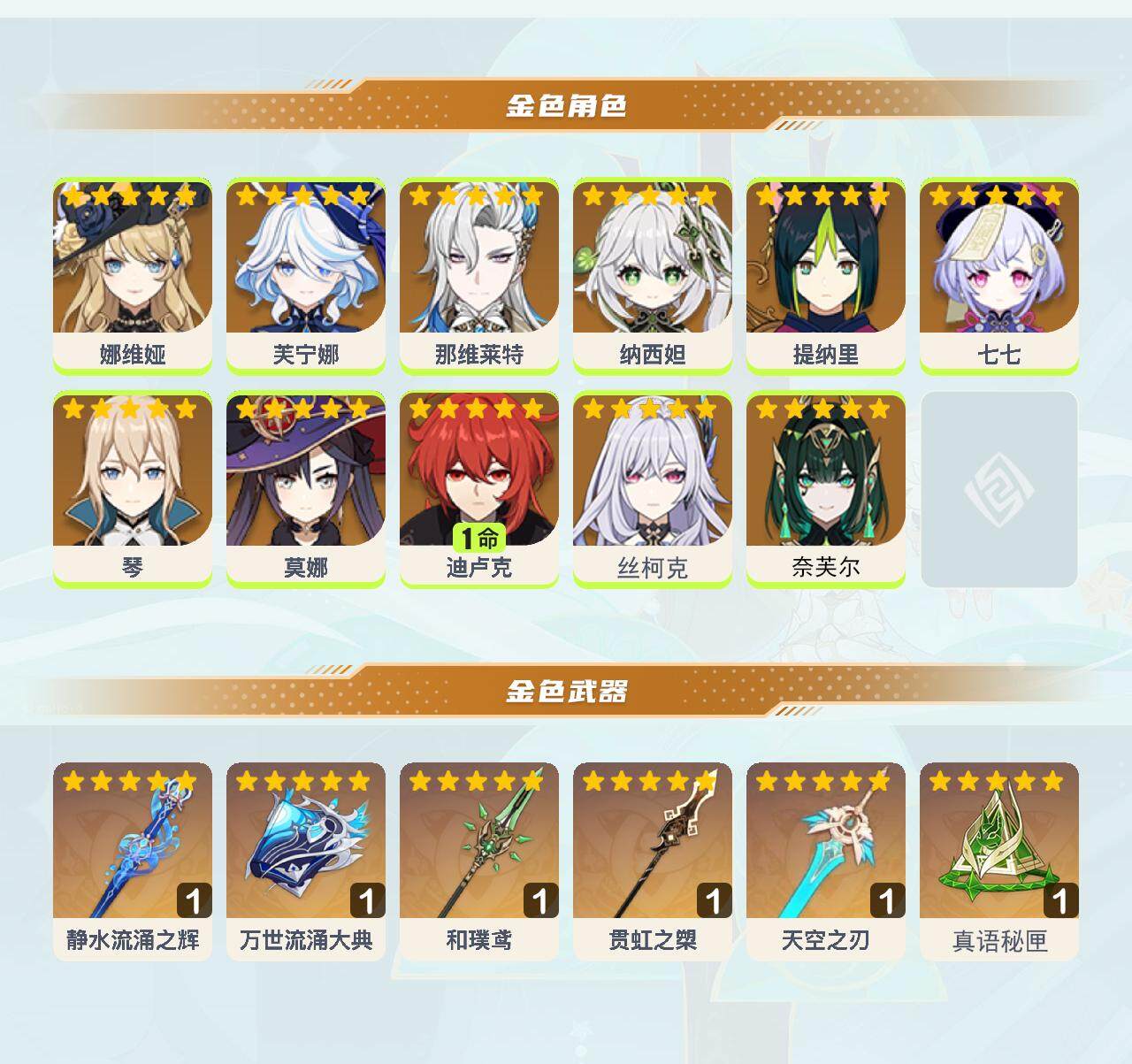 0命娜维娅,0命芙宁娜,0命那维莱特,0命纳西妲,0命提纳里,0命七七,0命琴,0命莫娜,1命迪卢克,0命丝柯克,0命奈芙尔,精1静水流涌之辉,精1万世流涌大典,精1和璞鸢,精1贯虹之槊,精1天空之刃,精1真语秘匣