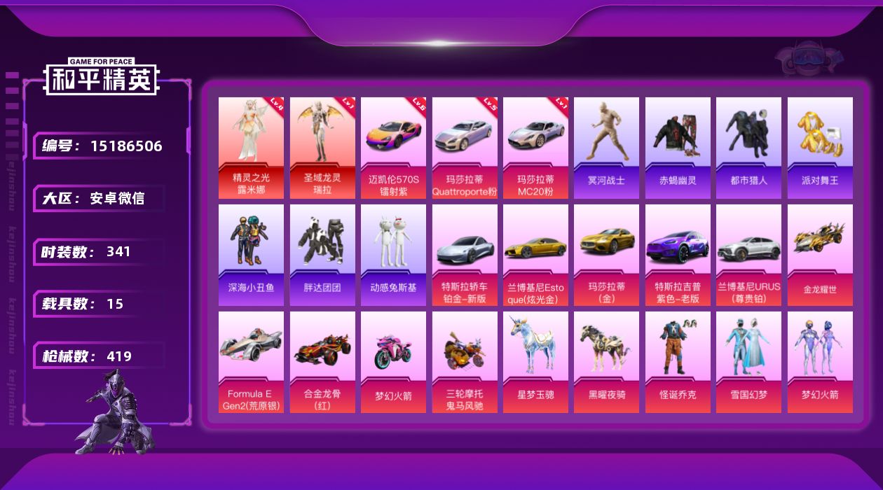 [15186506]【特价出售/店主推荐】安卓 微信-无敌战神框-2神装-50粉装-31特效枪-15载具-15粉色飞行器-218487热力值-32王牌印记-341套装-419枪皮 【红色载具】:玛莎拉蒂MC20(幻星粉)(一级),玛莎拉蒂Quattroporte(幻星粉)(五级),迈凯伦570S(镭射紫)(六级) 【红色神装等级】:圣域龙灵-瑞拉(一级),精灵之光-露米娜(四级) 【红色角色神装】:圣域龙灵-瑞拉,精灵之光-露米娜 【热门品类】:粉装-怪诞乔克,粉装-雪国幻梦,粉装-梦幻火箭,粉装-童趣迷兔,粉装-缤纷油彩,绝对防御上衣,套装-浪漫天命,套装-赤蝎幽灵,套装-都市猎人,套装-冥河战士,套装-派对舞王,套装-深海小丑鱼,套装-小丑鱼,角色-军刀雅典娜,套装-胖达团团,套装-动感兔斯基人偶服,套装-SS1特训,套装-龟仙人,套装-暗影哥特,套装-糯粉咩咩,角色-六号稻草人,套装-红熊茄茄 【粉色套装】:粉装-独舞天鹅,粉装-数码大师,粉装-怪诞乔克,粉装-甜心巧克力,粉装-宝贝奶油派,粉装-天使彩虹糖,粉装-雪国幻梦,粉装-蝶舞迷情,粉装-梦幻火箭,粉装-金属狂野,粉装-缤纷油彩,粉装-放客神游,粉装-心之恋语,粉装-冰霜白皇,粉装-童趣迷兔,粉装-炙焰红王,粉装-暗翼战神,粉装-绮梦青鸾,粉装-相思残雪,粉装-馨动时刻,粉装-蜜桃特工,粉装-蝶舞蔷薇,粉装-铁血龙王,粉装-暗夜玫瑰,粉装-林间仙鹿,粉装-彩虹鹿灵,粉装-山涧鹿灵,角色-洛天依,粉装-吟月归客,粉装-黄伞悠悠,粉装-黑伞漫漫,角色-零号机款机体服,角色-初号机款机体服,角色-2号机款机体服,粉装-绚金瑰梦,粉装-焦糖拿铁,粉装-恐龙拽拽,粉装-妙趣可丽,粉装-灵感创作师,角色-歌者泠鸢,粉装-暗夜鎏金,粉装-第五大道,角色-白勺歌姬,角色-小可学妹,粉装-炫光之旅,角色-圣堂之誓,角色-脉冲星,角色-千金淑猫,粉装-幻彩电音,角色-绯穹魔姬 【粉色枪皮等级】:AKM-炫紫旋律(四级),AKM-盖世英雄(九级),SCAR-L-童趣迷兔(七级),M416-五爪金龙(一级),M416-风花雪月(一级),M416-至情至圣(九级),M416-墨龙九天(一级),GROZA-香水柠檬(一级),GROZA-焦糖拿铁(一级),GROZA-精灵之光(三级),AUG-妙趣可丽(七级),M762-电糖天使(七级),蜜獾-荧海星