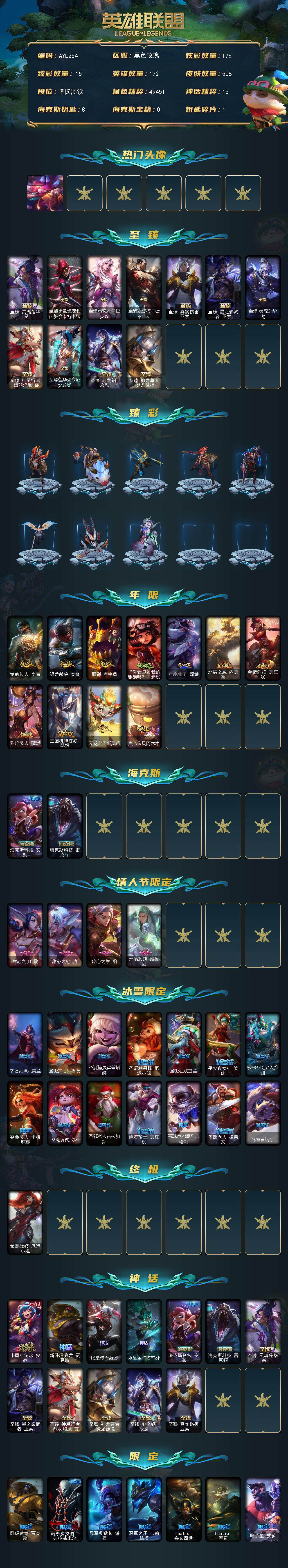 [15187065]可二次【特价出售/店主推荐】未定级段位-172英雄-508皮肤-176炫彩-1终极-17神话-82限定-50传说-108史诗