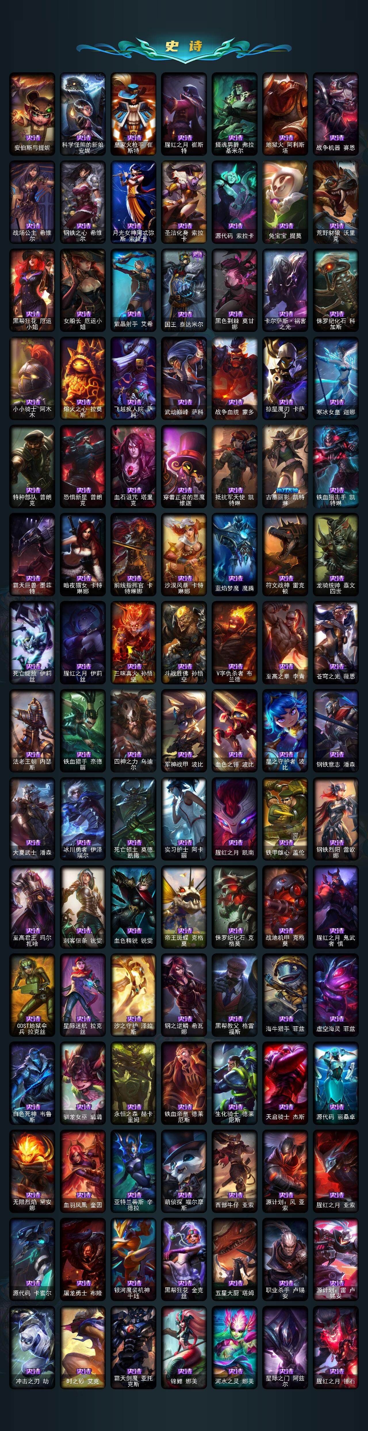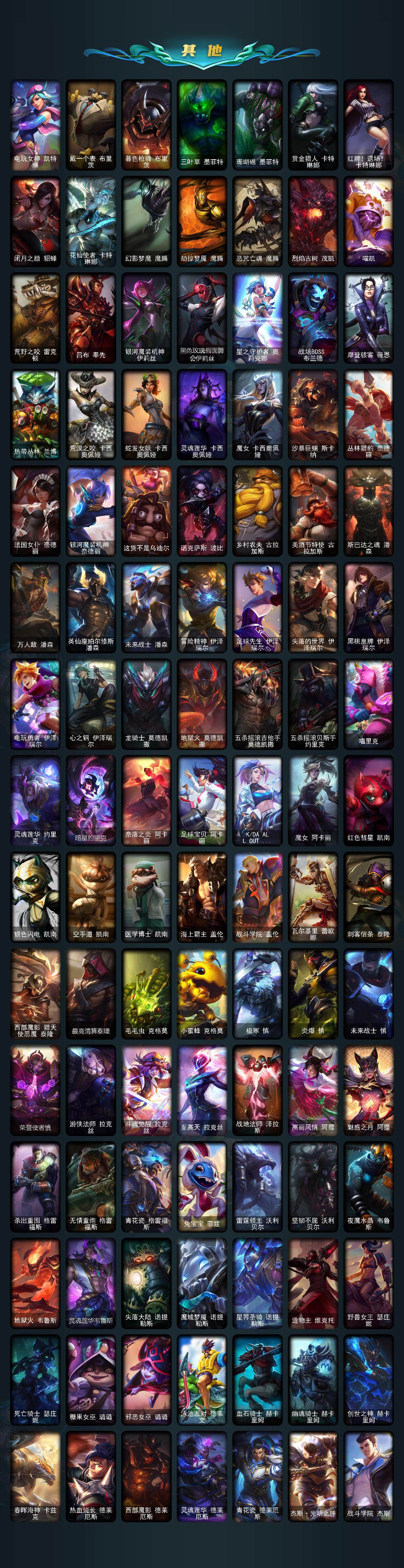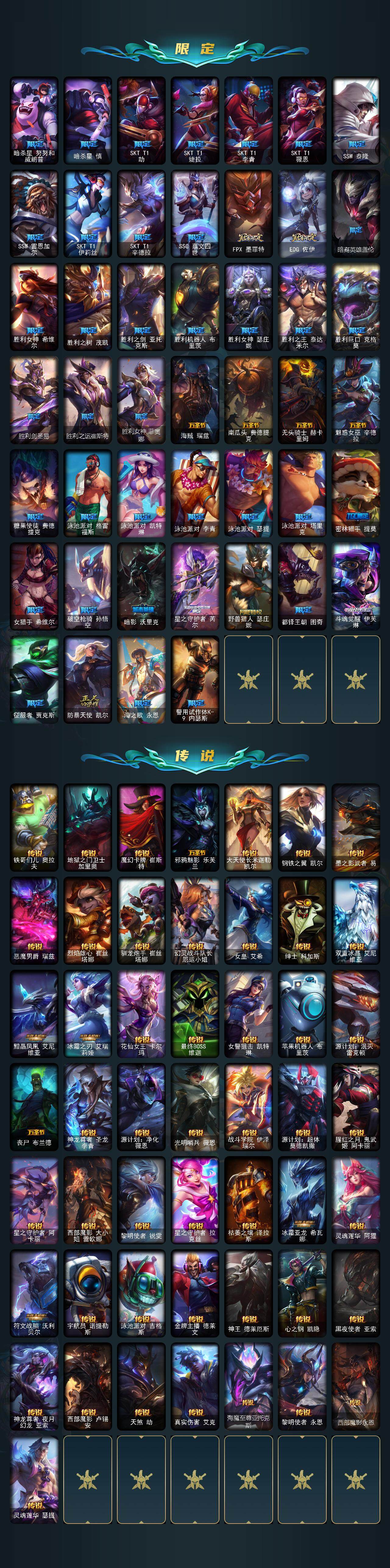 【冰雪限定】:幸福女神乐芙兰,圣诞开心鬼提莫,圣诞精灵崔丝塔娜,圣诞糖果棒厄运小姐,圣诞狂欢基兰,平安夜女神娑娜,邪恶圣诞老人维迦,夺命美人卡特琳娜,圣诞玩偶波比,圣诞老人古拉加斯,魄罗骑士瑟庄妮,雪球也能爆炸吉格斯,圣诞老人德莱文,冰雪兽纳尔
