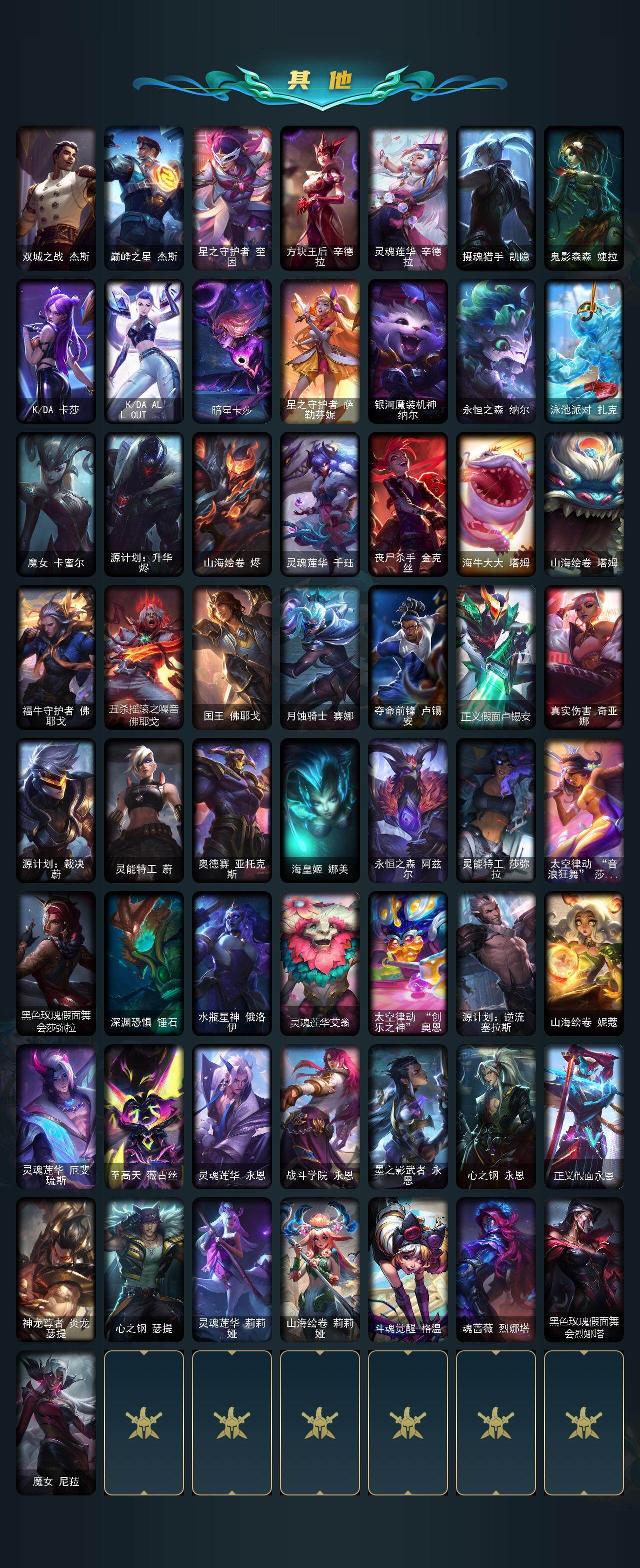 【至臻皮肤】:至臻灵魂莲华易,至臻黑色玫瑰假面舞会卡特琳娜,至臻灵魂莲华拉克丝,至臻凯旋将军德莱厄斯,至臻真实伤害亚索,至臻墨之影武者亚索,至臻灵魂莲华劫,至臻神凰行者烈羽焰凰霞,至臻莲华温泉厄斐琉斯,至臻心之钢永恩,至臻神龙尊者炎龙瑟提