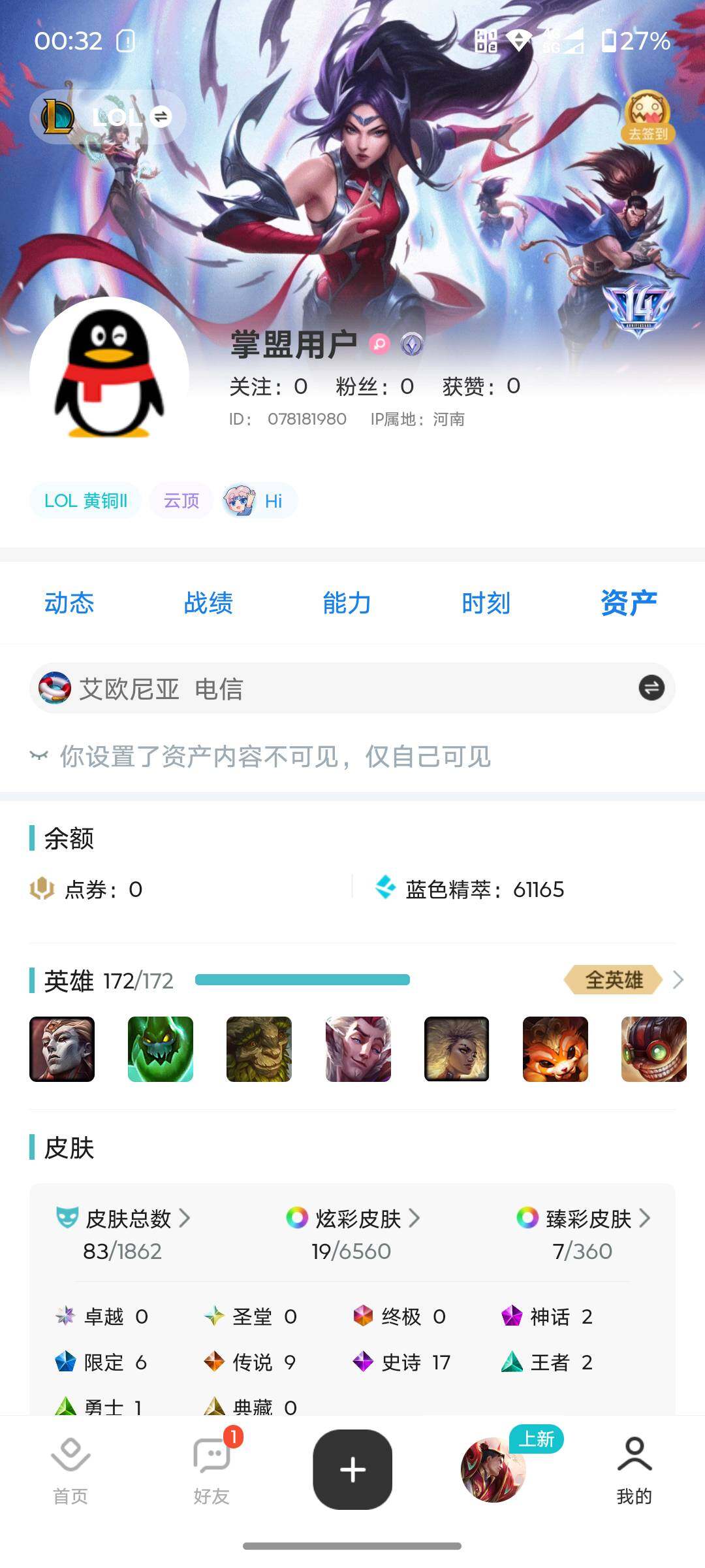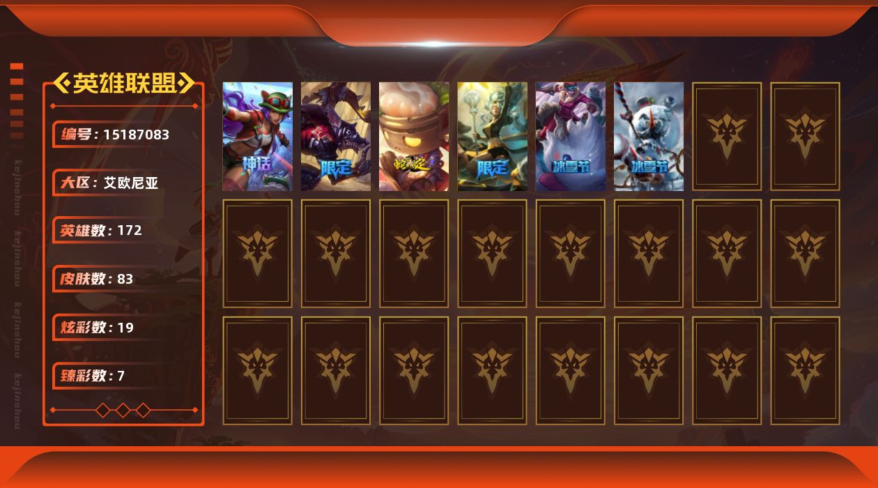 [15187083]【店主推荐捡漏号!可直接换绑】青铜段位-172英雄-83皮肤-19炫彩-0终极-2神话-6限定-9传说-17史诗