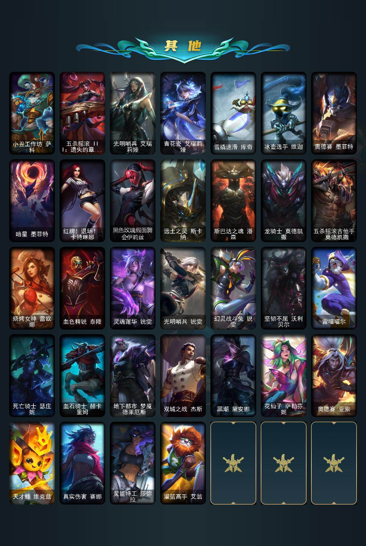 【其他皮肤1】:电锯狂人厄加特,魔女乐芙兰,弗拉基米尔侯爵,金牛座阿利斯塔,黯晶战神赛恩,星界圣骑赛恩,古神沃里克,睡衣守护者厄运小姐,黑色天灾辛吉德,假面女皇伊芙琳,欧米伽小队毒针狙击手,尼斯巨兽科加斯,暴龙科加斯,铬金铠甲拉莫斯,小丑工作坊萨科,五杀摇滚III遗失的章节娑娜,光明哨兵艾瑞莉娅,青花瓷艾瑞莉娅,雪橇速滑库奇,冰壶选手维迦,奥德赛墨菲特,暗星墨菲特,红牌退场卡特琳娜,黑色玫瑰假面舞会伊莉丝,远土之灵斯卡纳,斯巴达之魂潘森,龙骑士莫德凯撒,五杀摇滚吉他手莫德凯撒,烧烤女神蕾欧娜,血色精锐泰隆,灵魂莲华锐雯,光明哨兵锐雯,幻灵战斗兔锐雯,坚韧不屈沃利贝尔,雷喵喵尔,死亡骑士瑟庄妮,血石骑士赫卡里姆,地下都市梦魇德莱厄斯,双城之战杰斯,黑潮黛安娜,花仙子萨勒芬妮,奥德赛亚索,天才蜂维克兹,真实伤害赛娜,灵能特工莎弥拉,灌篮高手艾翁