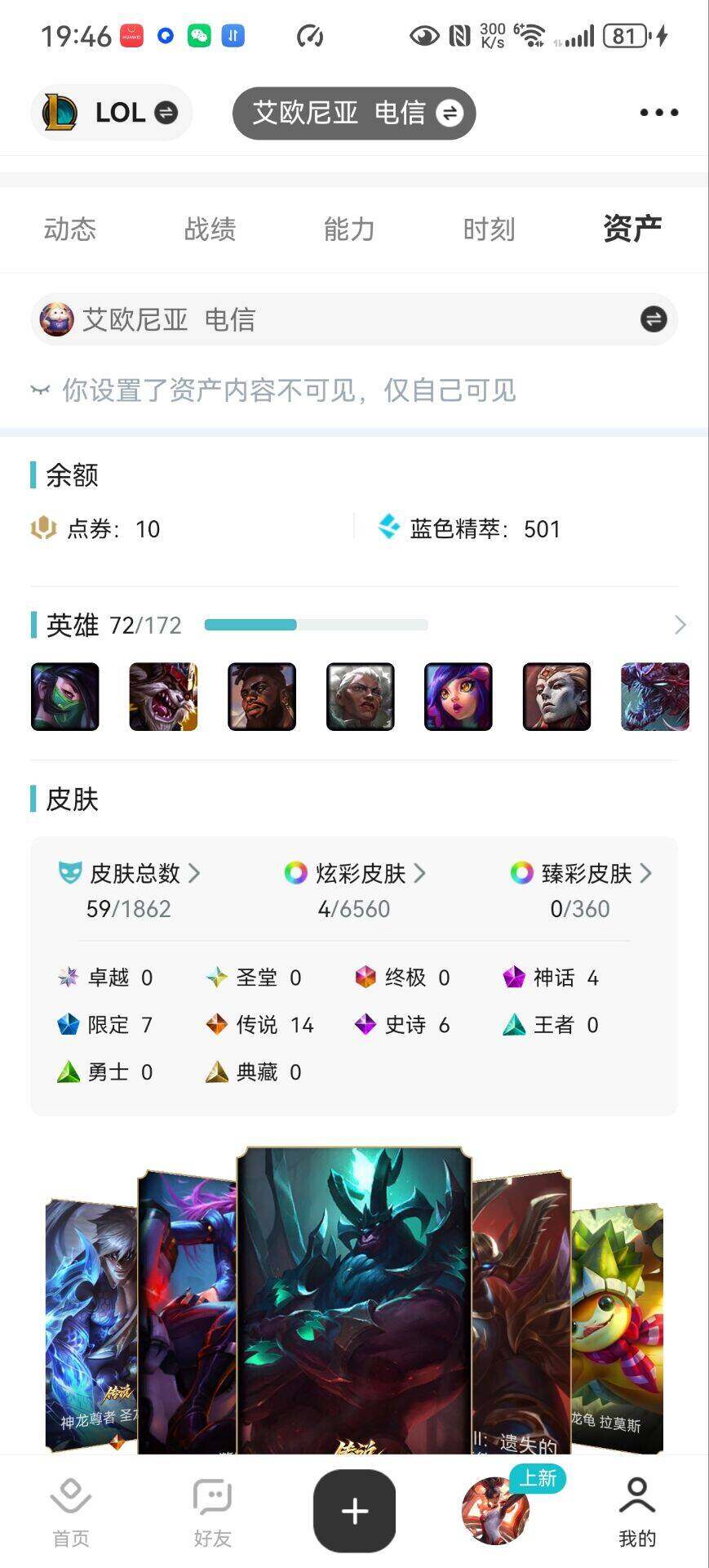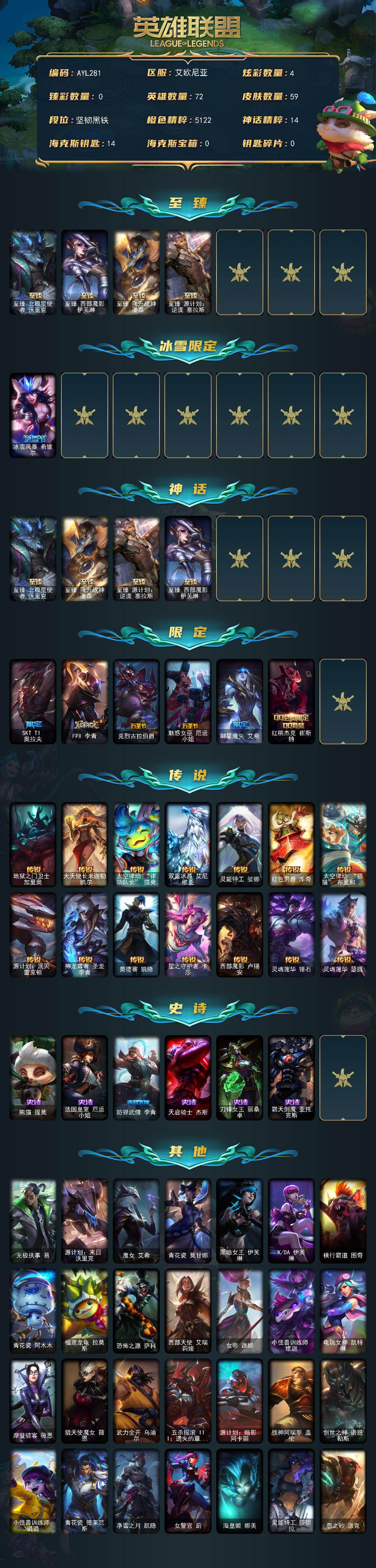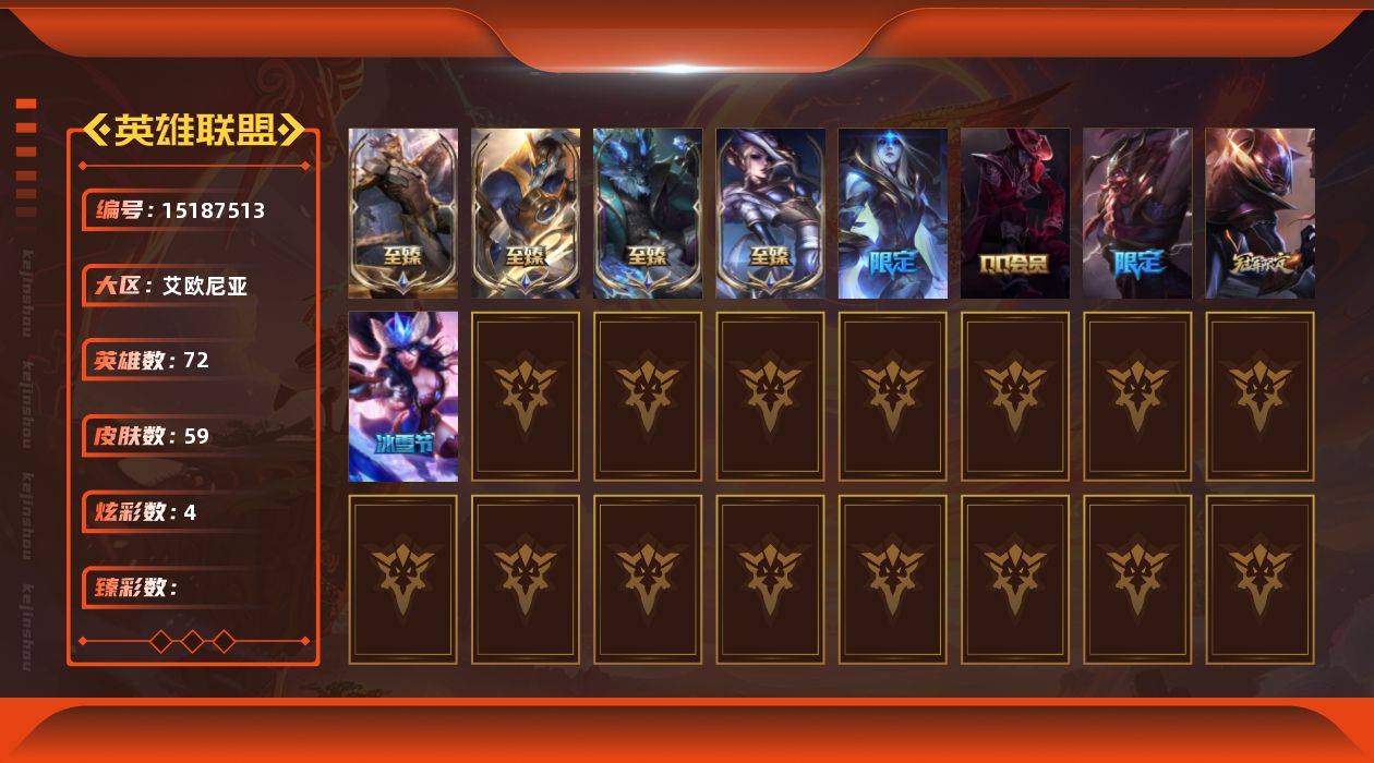 [15187513]可二次【特价出售/店主推荐】黑铁段位-72英雄-59皮肤-4炫彩-0终极-4神话-7限定-14传说-6史诗