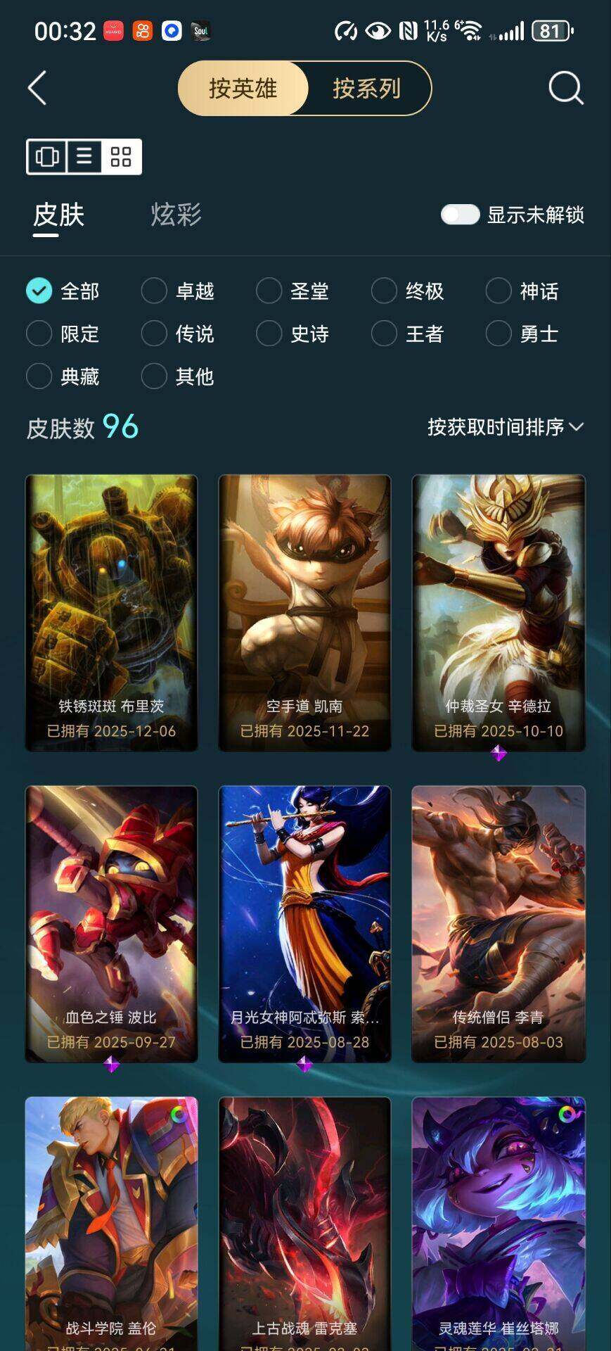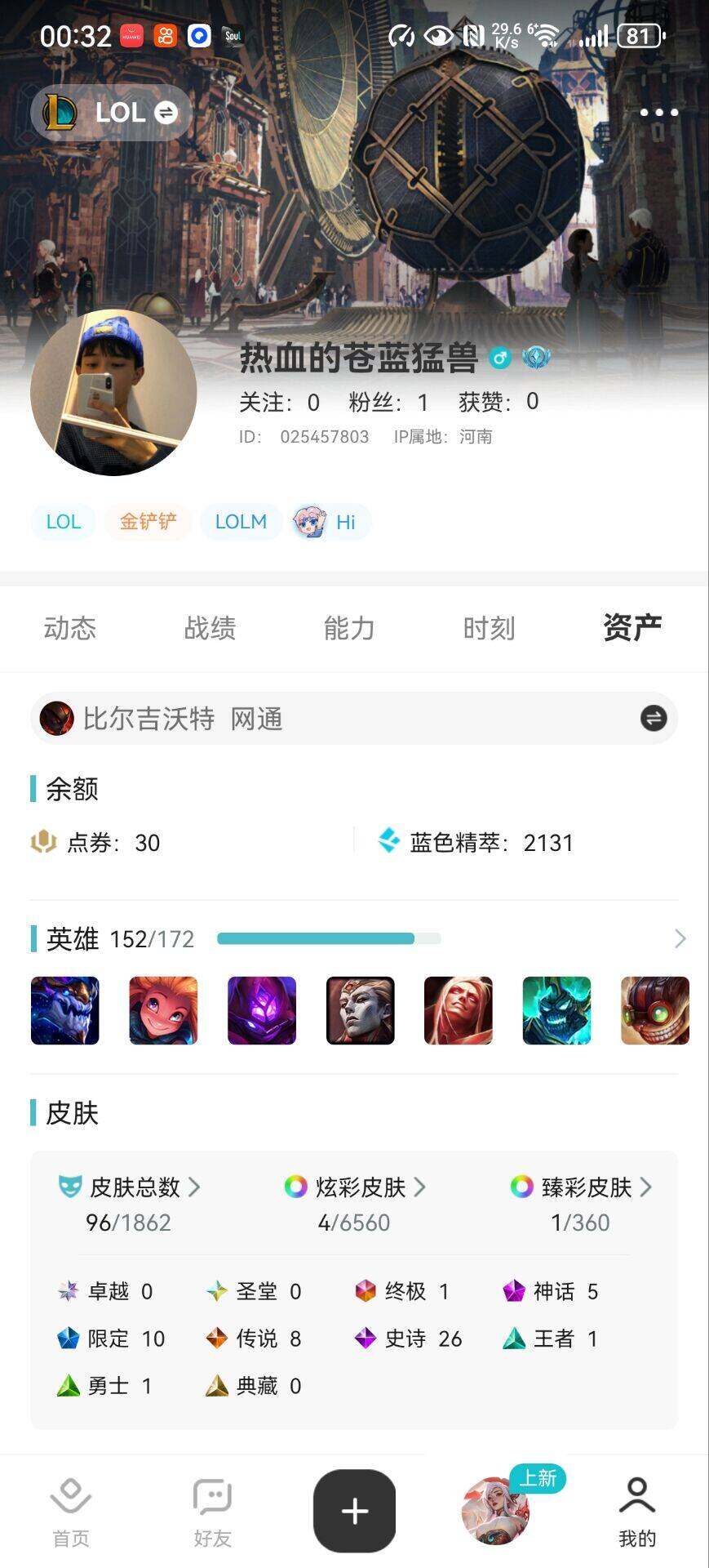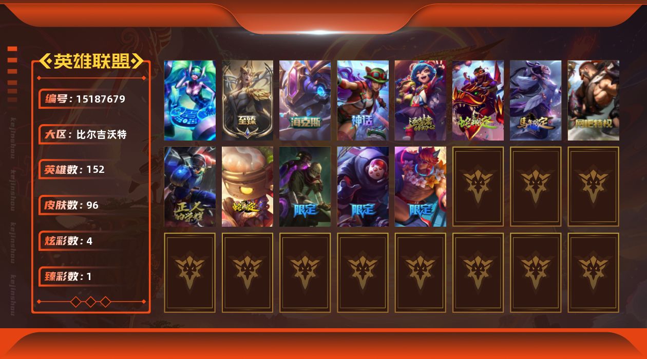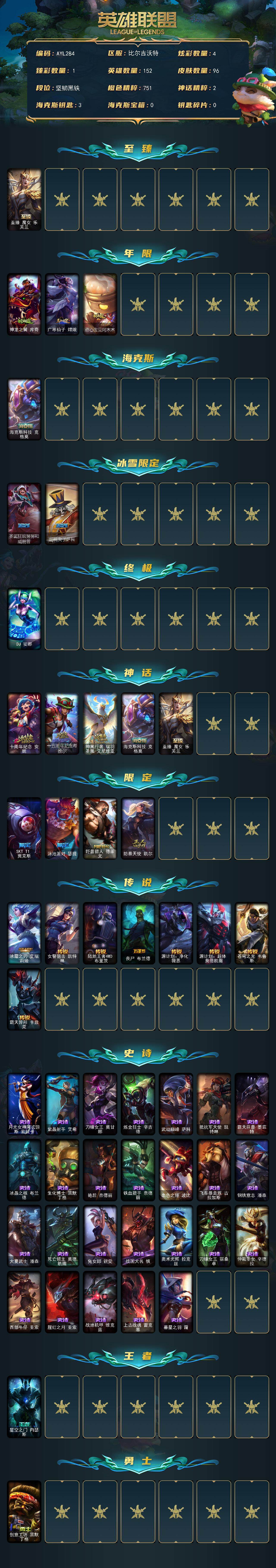 [15187679]【特价出售/店主推荐】未定级段位-152英雄-96皮肤-4炫彩-1终极-5神话-10限定-8传说-26史诗