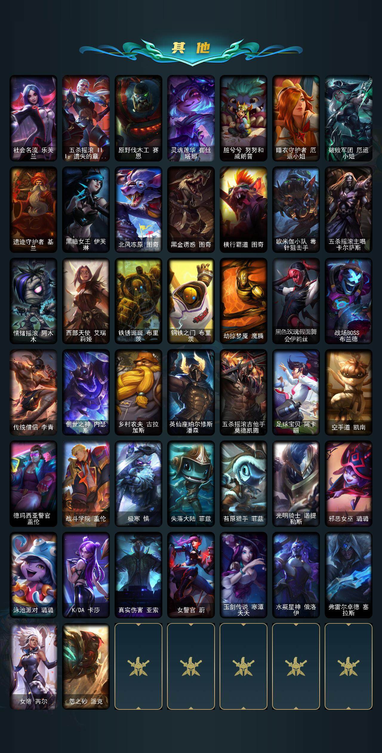【其他皮肤1】:社会名流乐芙兰,五杀摇滚III遗失的章节凯尔,原野伐木工赛恩,灵魂莲华崔丝塔娜,脏兮兮努努和威朗普,睡衣守护者厄运小姐,破败军团厄运小姐,遗迹守护者基兰,黑暗女王伊芙琳,北风冻原图奇,黑金诱惑图奇,横行霸道图奇,欧米伽小队毒针狙击手,五杀摇滚主唱卡尔萨斯,情绪摇滚阿木木,西部天使艾瑞莉娅,铁锈斑斑布里茨,钢铁之门布里茨,劫掠梦魇魔腾,黑色玫瑰假面舞会伊莉丝,战场BOSS布兰德,传统僧侣李青,创世之神内瑟斯,乡村农夫古拉加斯,英仙座珀尔修斯潘森,五杀摇滚吉他手莫德凯撒,足球宝贝阿卡丽,空手道凯南,德玛西亚警官盖伦,战斗学院盖伦,极寒慎,失落大陆菲兹,苔原猎手菲兹,光明骑士诺提勒斯,邪恶女巫璐璐,泳池派对璐璐,KDA卡莎,真实伤害亚索,女警官蔚,玉剑传说寒潭夭夭,水瓶星神俄洛伊,弗雷尔卓德塞拉斯,女帝芮尔,怨之砂派克