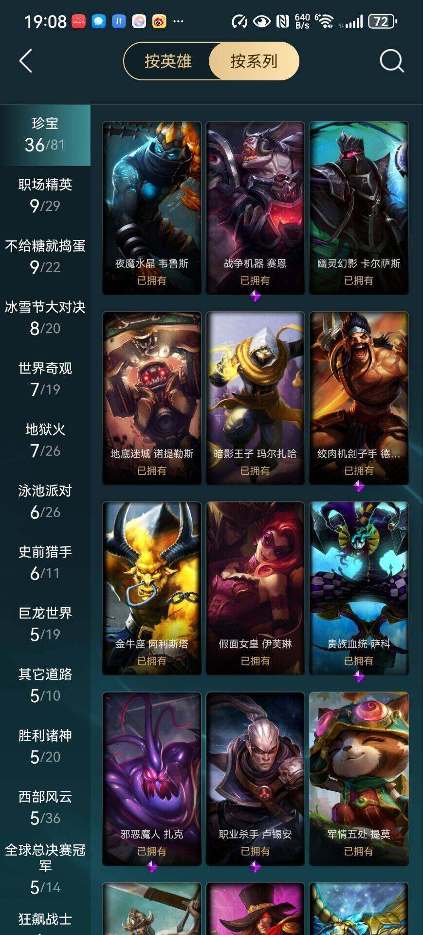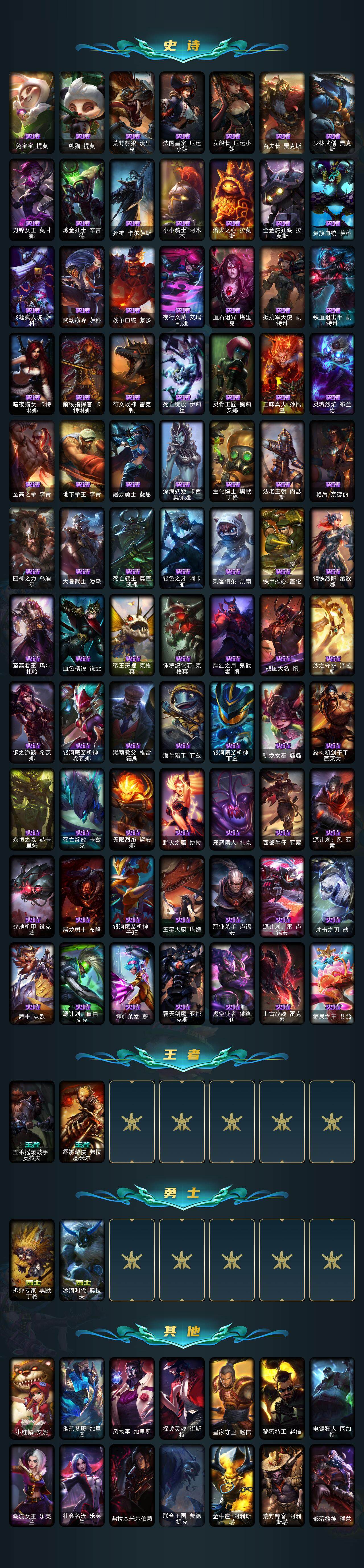 【史诗皮肤】:安伯斯与提妮,铁钩船长费德提克,重生之沙费德提克,圣光审判凯尔,战争机器赛恩,战场公主希维尔,月光女神阿忒弥斯索拉卡,兔宝宝提莫,熊猫提莫,荒野豺狼沃里克,法国皇室厄运小姐,女船长厄运小姐,百夫长贾克斯,少林武僧贾克斯,刀锋女王莫甘娜,炼金狂士辛吉德,死神卡尔萨斯,小小骑士阿木木,熔火之心拉莫斯,全金属狂潮拉莫斯,贵族血统萨科,飞越疯人院萨科,武动巅峰萨科,战争血统蒙多,夜行义贼艾瑞莉娅,血石诅咒塔里克,抵抗军天使凯特琳,铁血狙击手凯特琳,暗夜猫女卡特琳娜,前线指挥官卡特琳娜,符文战神雷克顿,死亡绽放伊莉丝,灵骨工匠奥莉安