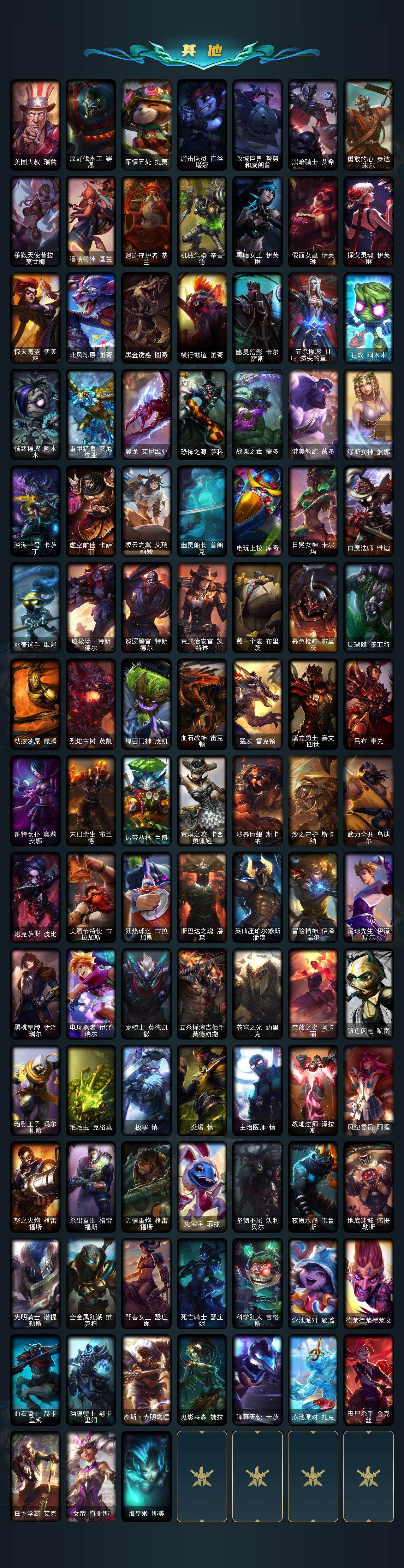 【传说皮肤】:魔幻卡牌崔斯特,邪鸦魅影乐芙兰,大天使长米迦勒凯尔,战场女武神凯尔,恶魔男爵瑞兹,提莫约德尔人的一大步,女皇艾希,源计划联合艾希,恶魔之刃泰达米尔,鬼魂新娘莫甘娜,绅士科加斯,律政大亨蒙多,冰霜之刃艾瑞莉娅,最终BOSS维迦,冰川巨兽墨菲特,地狱行者孙悟空,丧尸布兰德,炼狱魔犬内瑟斯,星之守护者拉克丝,宇航员诺提勒斯,女校长菲奥娜,霸天异形卡兹克,灌篮高手德莱厄斯,黑夜使者亚索