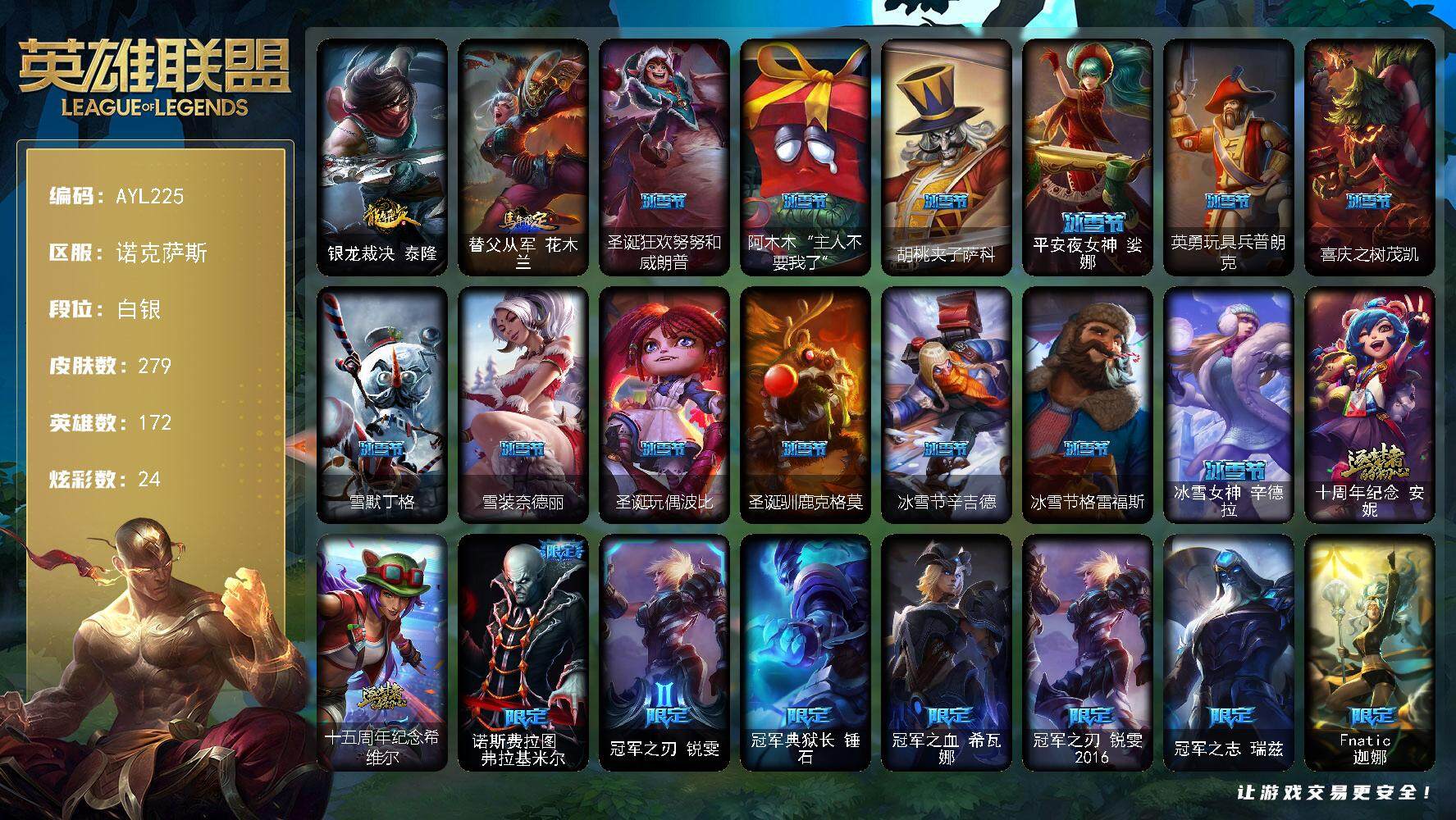 [15188047]【特价出售/店主推荐】白银段位-172英雄-279皮肤-24炫彩-0终极-2神话-50限定-24传说-84史诗 【臻彩皮肤】:冠军之志瑞兹凯旋圣装 【年限皮肤】:银龙裁决泰隆,替父从军花木兰 【冰雪限定】:圣诞狂欢努努和威朗普,阿木木“主人不要我了”,胡桃夹子萨科,平安夜女神娑娜,英勇玩具兵普朗克,喜庆之树茂凯,雪默丁格,雪装奈德丽,圣诞玩偶波比,圣诞驯鹿克格莫,冰雪节辛吉德,冰雪节格雷福斯,冰雪女神辛德拉 【神话皮肤】:十周年纪念安妮,十五周年纪念希维尔 【限定皮肤】:诺斯费拉图弗拉基米尔,冠军之刃锐雯,冠军典狱长锤石,冠军之血希瓦娜,冠军之刃锐雯2016,冠军之志瑞兹,Fnatic迦娜,暗杀星伊泽瑞尔,SKTT1李青,SSW雷恩加尔,SKTT1阿利斯塔,SKTT1阿兹尔,SKTT1雷克顿,勇敢的心德莱厄斯,胜利之树茂凯,胜利枪神格雷福斯,胜利女神奥莉安娜,胜利之剑亚托克斯,胜利机器人布里茨,海贼瑞兹,南瓜头费德提克,糖果使徒费德提克,泳池派对厄运小姐,泳池派对格雷福斯,泳池派对雷克顿,泳池派对李青,机械迷城加里奥,蓝色忧郁崔斯特,蒙多蒙多,女猎手希维尔,波比的巧克力工坊,电玩战魂赫卡里姆,红桃杰克崔斯特,防暴天使凯尔,警用试作体K9内瑟斯 【传说皮肤】:魔幻卡牌崔斯特,邪鸦魅影乐芙兰,大天使长米迦勒凯尔,战场女武神凯尔,恶魔男爵瑞兹,提莫约德尔人的一大步,女皇艾希,源计划联合艾希,恶魔之刃泰达米尔,鬼魂新娘莫甘娜,绅士科加斯,律政大亨蒙多,冰霜之刃艾瑞莉娅,最终BOSS维迦,冰川巨兽墨菲特,地狱行者孙悟空,丧尸布兰德,炼狱魔犬内瑟斯,星之守护者拉克丝,宇航员诺提勒斯,女校长菲奥娜,霸天异形卡兹克,灌篮高手德莱厄斯,黑夜使者亚索 【史诗皮肤】:安伯斯与提妮,铁钩船长费德提克,重生之沙费德提克,圣光审判凯尔,战争机器赛恩,战场公主希维尔,月光女神阿忒弥斯索拉卡,兔宝宝提莫,熊猫提莫,荒野豺狼沃里克,法国皇室厄运小姐,女船长厄运小姐,百夫长贾克斯,少林武僧贾克斯,刀锋女王莫甘娜,炼金狂士辛吉德,死神卡尔萨斯,小小骑士阿木木,熔火之心拉莫斯,全金属狂潮拉莫斯,贵族血统萨科,飞越疯人院萨科,武动巅峰萨科,战争血统蒙多,夜行义贼艾瑞莉娅,血石诅咒塔里克,抵抗军天使凯特琳,铁血狙击手凯特琳,暗夜猫女卡特琳娜,前线指挥官卡特琳娜,符文战神雷克顿,死亡绽放伊莉丝,灵骨工匠奥莉安
