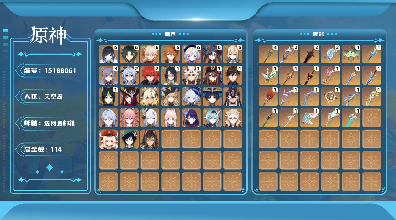 1命闲云,0命娜维娅,0命芙宁娜,0命迪希雅,0命流浪者,0命赛诺,1命提纳里,满命夜兰,0命神里绫人,0命八重神子,0命申鹤,1命荒泷一斗,0命优菈,0命雷电将军,满命枫原万叶,1命钟离,1命胡桃,2命甘雨,满命魈,0命温迪,0命可莉,满命达达利亚,0命阿贝多,0命珊瑚宫心海,3命刻晴,满命七七,5命琴,满命莫娜,2命迪卢克,0命希诺宁,0命恰斯卡,精1鹤鸣余音,精1静水流涌之辉,精1千夜浮梦,精1赤沙之杖,精1猎人之径,精2若水,精1赤角石溃杵,精1终末嗟叹之诗,精1冬极白星,精1飞雷之弦振,精1苍古自由之誓,精1松籁响起之时,精1护摩之杖,精1磐岩结绿,精2四风原典,精4和璞鸢,精1天空之翼,精1阿莫斯之弓,精1天空之刃,精1天空之卷,精1尘世之锁,精1风鹰剑,精2狼的末路