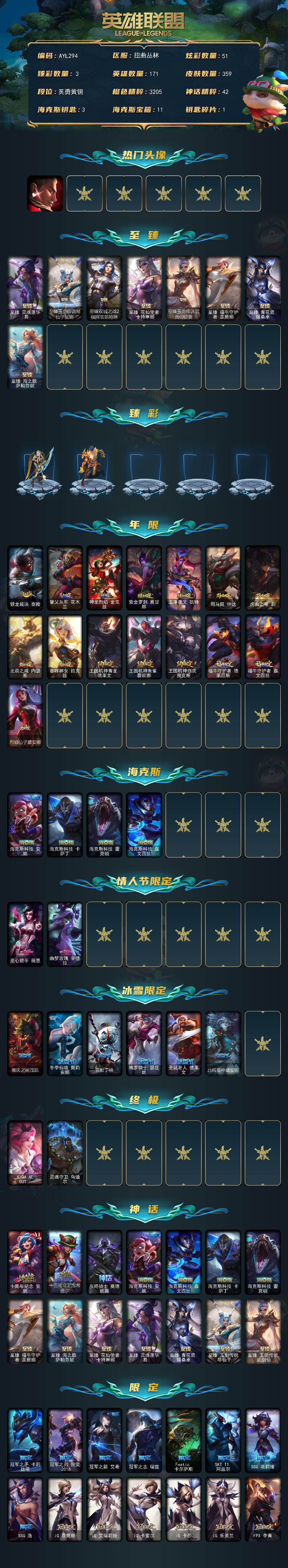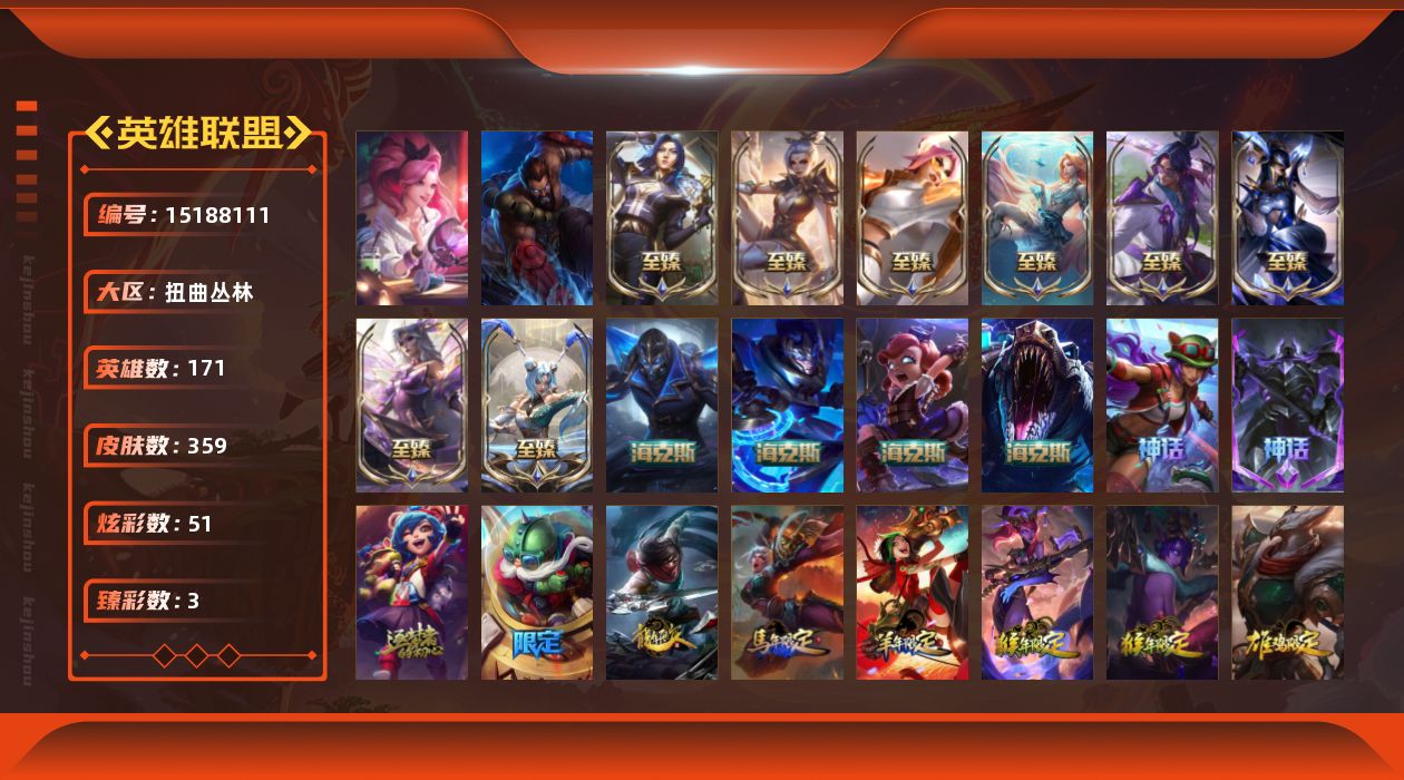 [15188111]可二次【特价出售/店主推荐】青铜段位-171英雄-359皮肤-51炫彩-4终极-15神话-67限定-50传说-79史诗