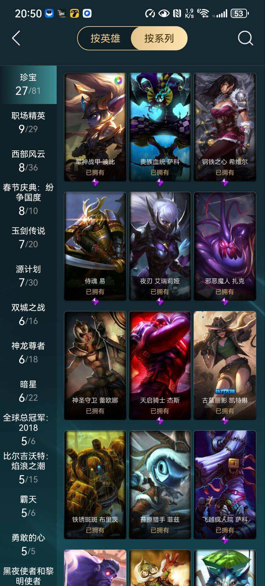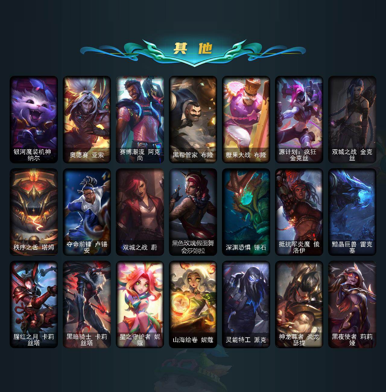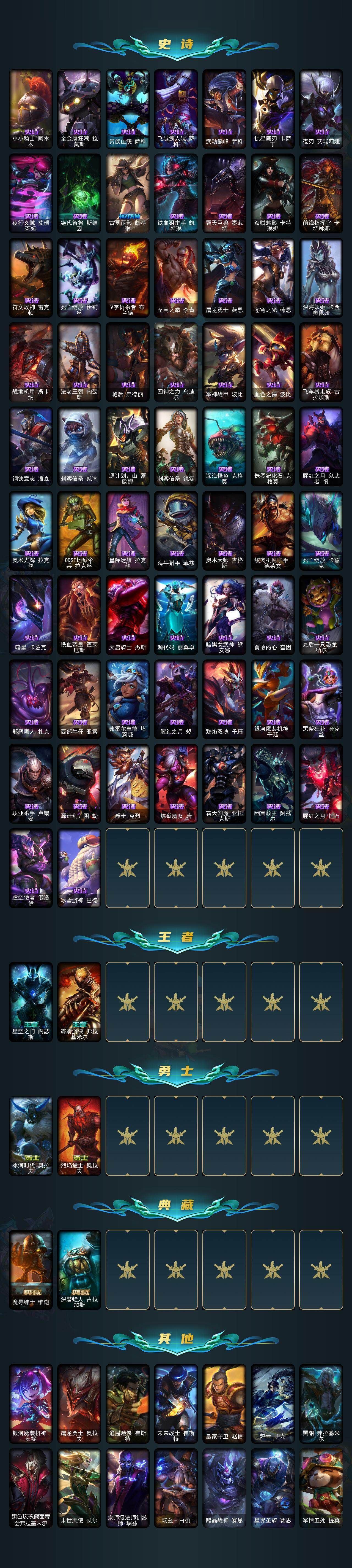 【年限皮肤】:银龙裁决泰隆,替父从军花木兰,神龙烈焰金克丝,紫金罗刹莫甘娜,玉净夜叉凯特琳,司马懿仲达,虎痴之拳蔚,北辰之威内瑟斯,春晖神女拉克丝,王国机神青龙德莱文,王国机神朱雀蕾欧娜,王国机神白虎贾克斯,福牛守护者德莱厄斯,福牛守护者嘉文四世,烈焰仙子黛安娜
