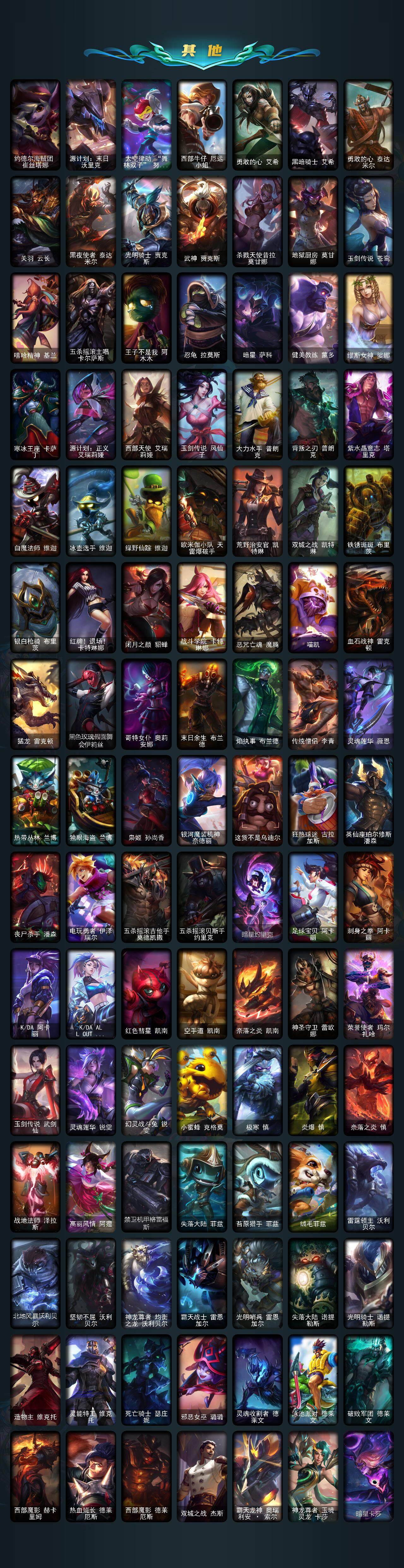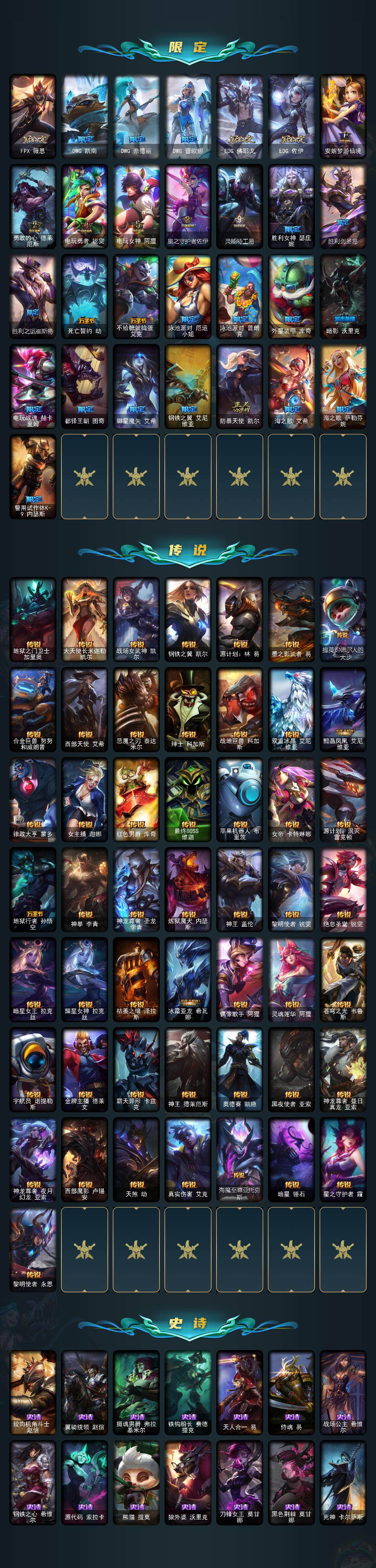 【限定皮肤】:冠军之矛卡莉丝塔,冠军之刃锐雯2016,冠军之箭艾希,冠军之志瑞兹,Fnatic卡尔萨斯,SKTT1阿兹尔,SSG塔莉垭,SSG洛,iG菲奥娜,iG艾瑞莉娅,iG卡蜜尔,iG卡莎,iG乐芙兰,FPX李青,FPX薇恩,DWG凯南,DWG奈德丽,DWG蕾欧娜,EDG佛耶戈,EDG佐伊,安妮梦游仙境,勇敢的心德莱厄斯,电玩勇者锐雯,电玩女神阿狸,星之守护者佐伊,灵能特工易,胜利女神瑟庄妮,胜利剑圣易,胜利之运崔斯特,死亡誓约劫,不给糖就捣蛋艾克,泳池派对厄运小姐,泳池派对普朗克,外星装甲库奇,暗影沃里克,电玩战魂赫卡里姆,都铎王朝图奇,御星魔矢艾希,钢铁之翼艾尼维亚,防暴天使凯尔,海之歌艾希,海之歌萨勒芬妮,警用试作体K9内瑟斯,双城之战2微光实验室辛吉德