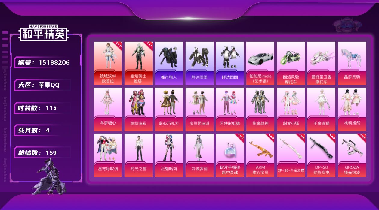 [15188206]素材身法号/绝世印记1 苹果 手Q-2神装-13粉装-14特效枪-4载具-10粉色飞行器-6.2w热力值-6王牌印记-115套装-159枪皮【红色神装等级】:幽焰骑士-维塔(一级),镜域双华-欧若拉(二级)【热门品类】:粉装-缤纷油彩,套装-浪漫天命,套装-都市猎人,套装-胖达团团,套装-胖达圆圆,套装-糯粉咩咩,套装-软软马卡龙,角色-六号稻草人,套装-红熊茄茄【粉色载具】:帕加尼imola(艺术银),幽焰风驰摩托车,最终圣卫者摩托车,晶梦灵驹【粉色套装】:粉装-甜心巧克力,粉装-宝贝奶油派,粉装-天使彩虹糖,粉装-缤纷油彩,粉装-绚金战神,粉装-甜梦小狐,角色-千金淑猫,粉装-桃粉嫣然,粉装-星穹咏叹调,角色-时光之誓,角色-狂魅哈莉,角色-冷漠罗丽,角色-羊梦糖心【粉色枪皮等级】:AKM-甜心宝贝(六级),AKM-幽焰骑士(一级),M416-墨龙九天(三级),GROZA-镜光银凌(五级),AUG-暖羊咩咩(五级),蜜獾-异瞳寒姬(一级),Vector-最终圣卫者(三级),P90-沙丘之主(三级),Kar98K-巳巳如意(五级),Mk14-盛世惊鸿(一级),Mk14-樱桃泡泡(一级),DP-28-千金淑猫(六级),DP-28-豹影疾电(五级),破片手榴弹-瓶中星球(七级)【粉色飞行器】:酣梦熊熊飞行器,镜光幻境飞行翼,沙丘之主天马,镜域双华-灵镜之阶,龙翔九天飞行器,幽焰列车飞行器,凤舞九天飞行器,彩虹独角兽飞行器,终晖之翼飞行器