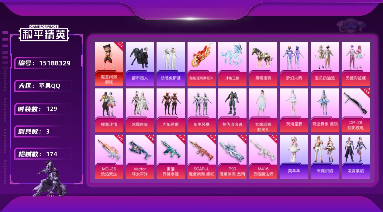[15188329]【店主推荐捡漏号!可直接换绑】背包2200红碎片 素材身法号/无敌战神框1/苹果 手Q-无敌战神框-1神装-11粉装-7特效枪-3载具-4粉色飞行器-5.8w热力值-10王牌印记-129套装-174枪皮【红色神装等级】:魔童闹海-哪吒(一级)【热门品类】:粉装-梦幻火箭,套装-浪漫天命,套装-都市猎人,套装-小丑鱼,角色-军刀雅典娜,套装-动感兔斯基人偶服,套装-暗影哥特,套装-浪漫波比【粉色载具】:踏焰逐风摩托车,黑曜夜骑,冰绡玉鳞【粉色套装】:粉装-宝贝奶油派,粉装-天使彩虹糖,粉装-蝶舞迷情,粉装-梦幻火箭,粉装-冰霜白皇,粉装-赤焰黑爵,粉装-紫电风暴,角色-复仇流浪者,女娲后裔-赵灵儿,角色-荧海星豚,角色-奇迹舞步 美琪【粉色枪皮等级】:SCAR-L-魔童闹海 哪吒(三级),M416-灵猫魔法师(三级),蜜獾-异瞳寒姬(三级),Vector-环太平洋(四级),P90-魔童闹海 敖丙(三级),DP-28-豹影疾电(五级),MG-36-沧焰双生(五级)【粉色飞行器】:庄周梦蝶飞行器,灵猫魔法师飞行器,飞天猪飞行器,灵珠游龙飞行器