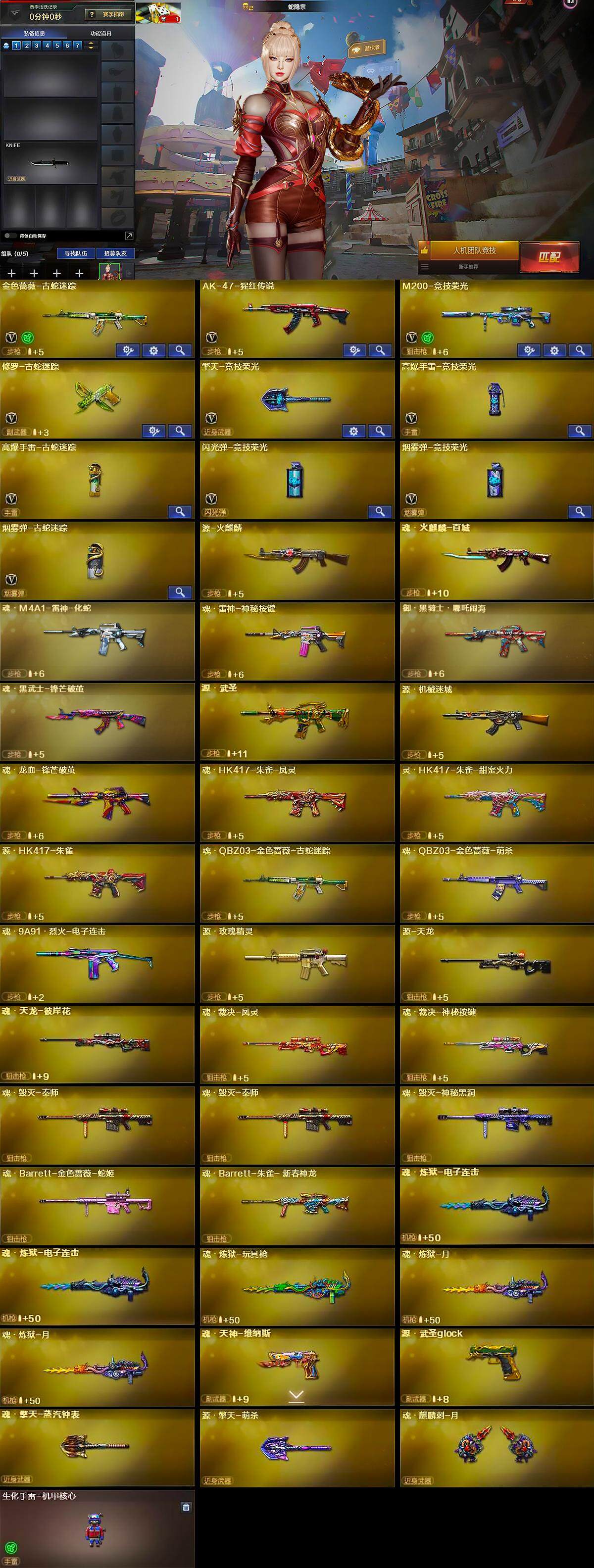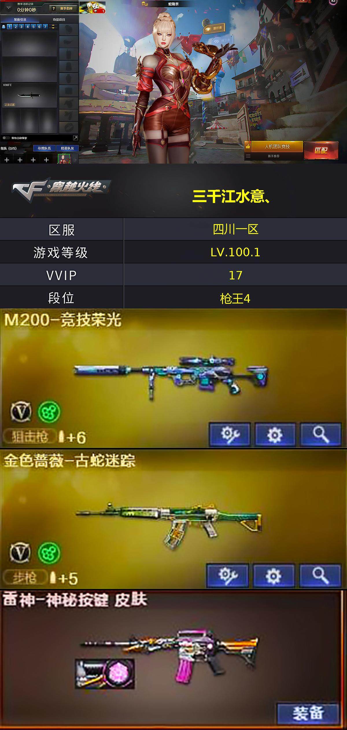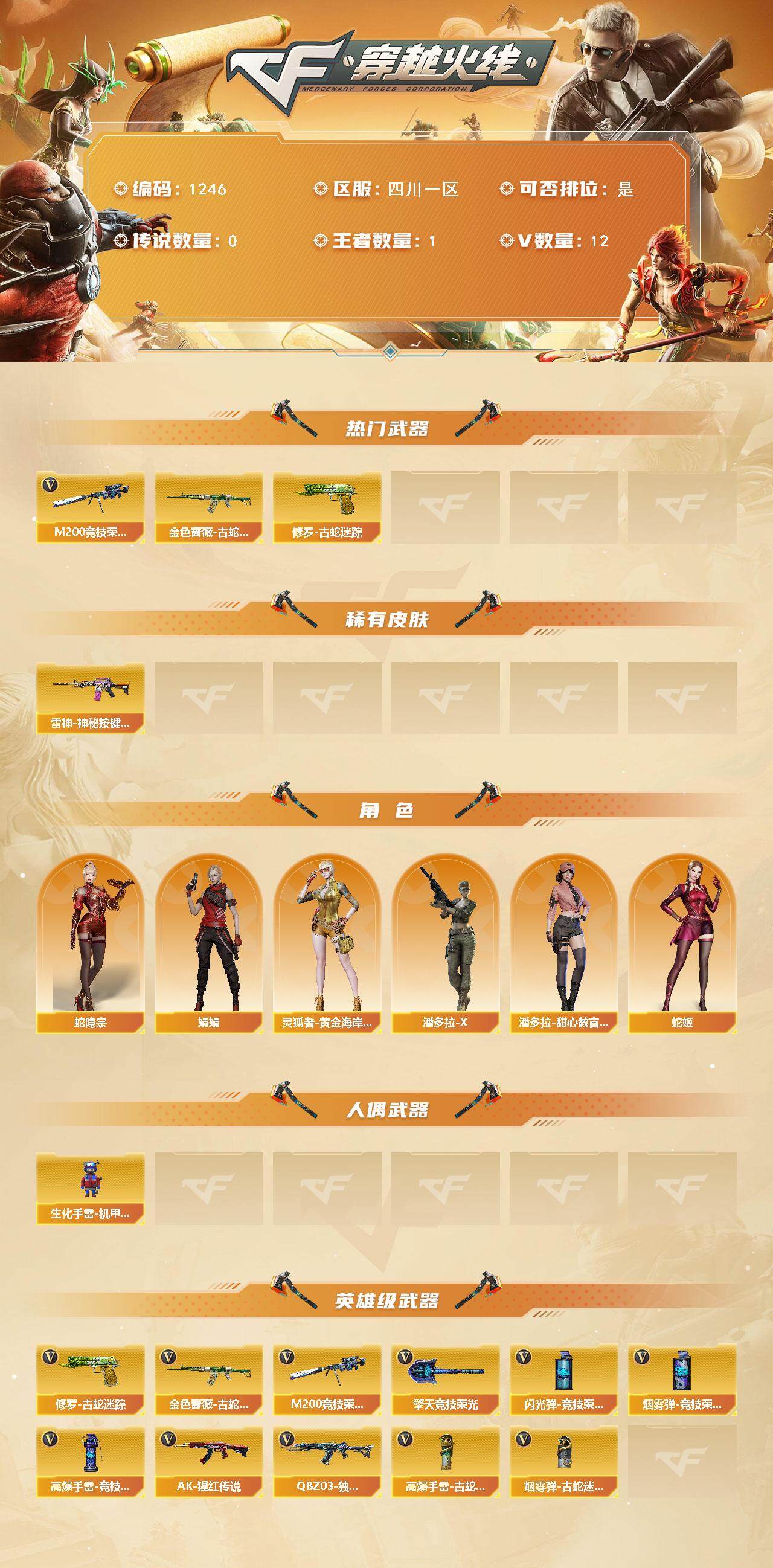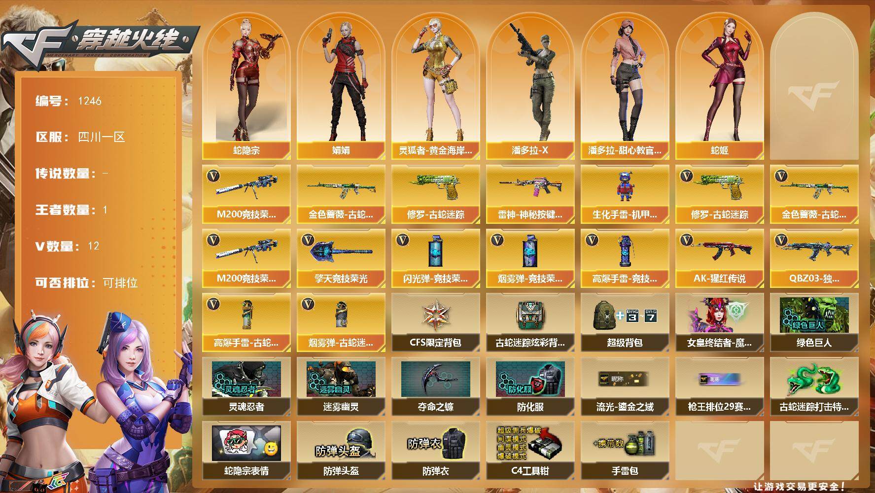[15188354]四川一区-12V-1王者-0炫金 【热门武器】:金色蔷薇-古蛇迷踪,修罗-古蛇迷踪,M200-竞技荣光 【皮肤】:雷神-神秘按键 皮肤 【角色】:蛇隐宗,娟娟,灵狐者-黄金海岸,潘多拉-X,潘多拉-甜心教官,蛇姬 【人偶武器】:生化手雷-机甲核心 【英雄级武器】:金色蔷薇-古蛇迷踪,QBZ03-独角-III,AK-47-猩红传说,M200-竞技荣光,修罗-古蛇迷踪,擎天-竞技荣光,高爆手雷-竞技荣光,高爆手雷-古蛇迷踪,闪光弹-竞技荣光,烟雾弹-竞技荣光,烟雾弹-古蛇迷踪 【道具】:CFS限定背包,古蛇迷踪炫彩背包,超级背包,女皇终结者-魔龙之吻,绿色巨人,灵魂忍者,迷雾幽灵,夺命之镰,防化服*2,流光-鎏金之域,枪王排位29赛季金色流光,古蛇迷踪打击特效,蛇隐宗表情,防弹头盔*3,防弹衣*3,C4工具钳*3,手雷包*3 【特殊枪械】: