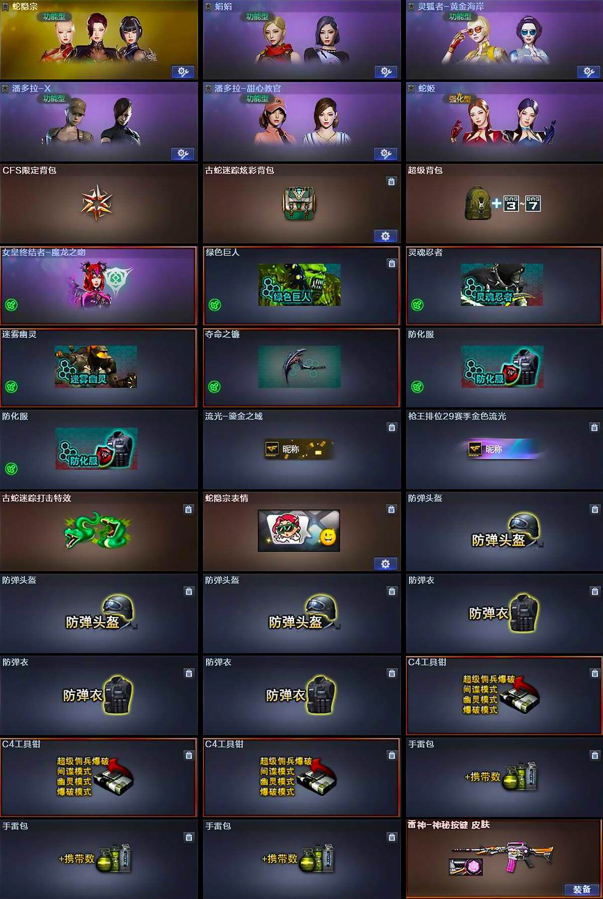 【道具】:CFS限定背包,古蛇迷踪炫彩背包,超级背包,女皇终结者-魔龙之吻,绿色巨人,灵魂忍者,迷雾幽灵,夺命之镰,防化服*2,流光-鎏金之域,枪王排位29赛季金色流光,古蛇迷踪打击特效,蛇隐宗表情,防弹头盔*3,防弹衣*3,C4工具钳*3,手雷包*3